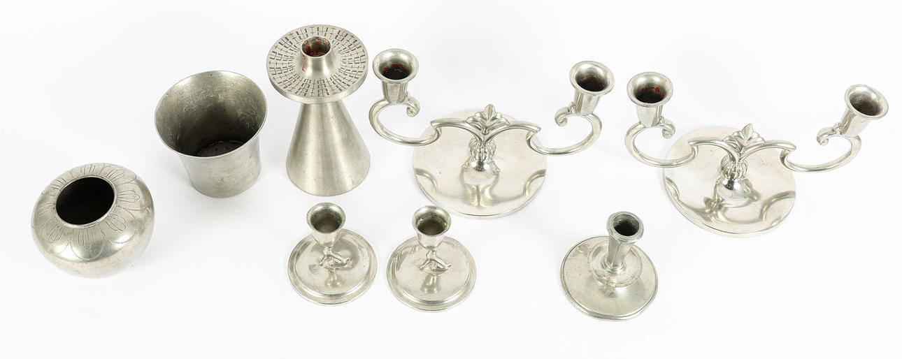 4908100. LJUSSTAKAR med mera i tenn.