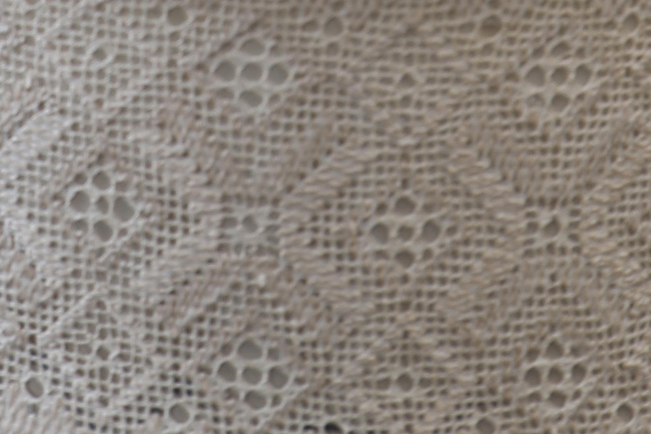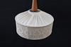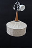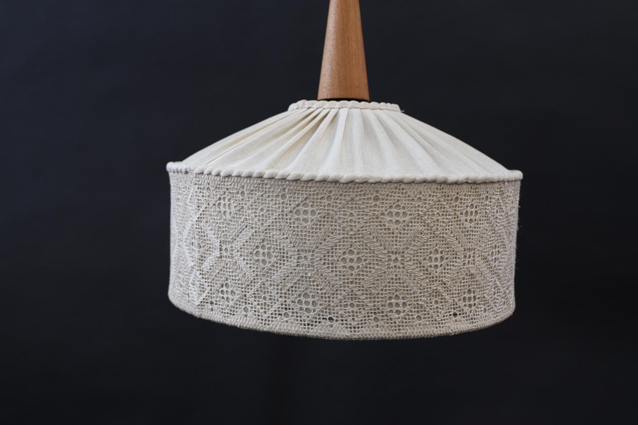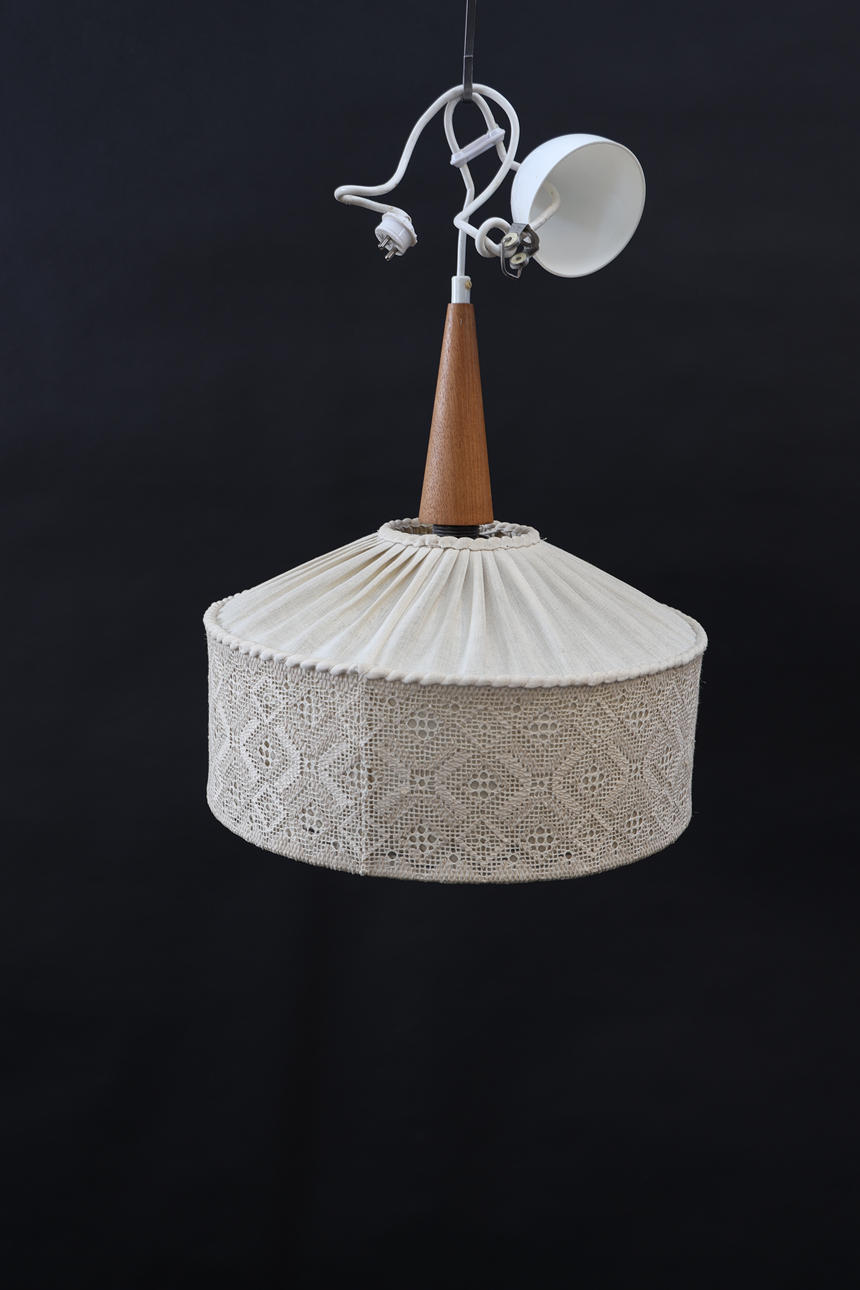 Textil med delvis näversöm. Fäste i massiv teak.