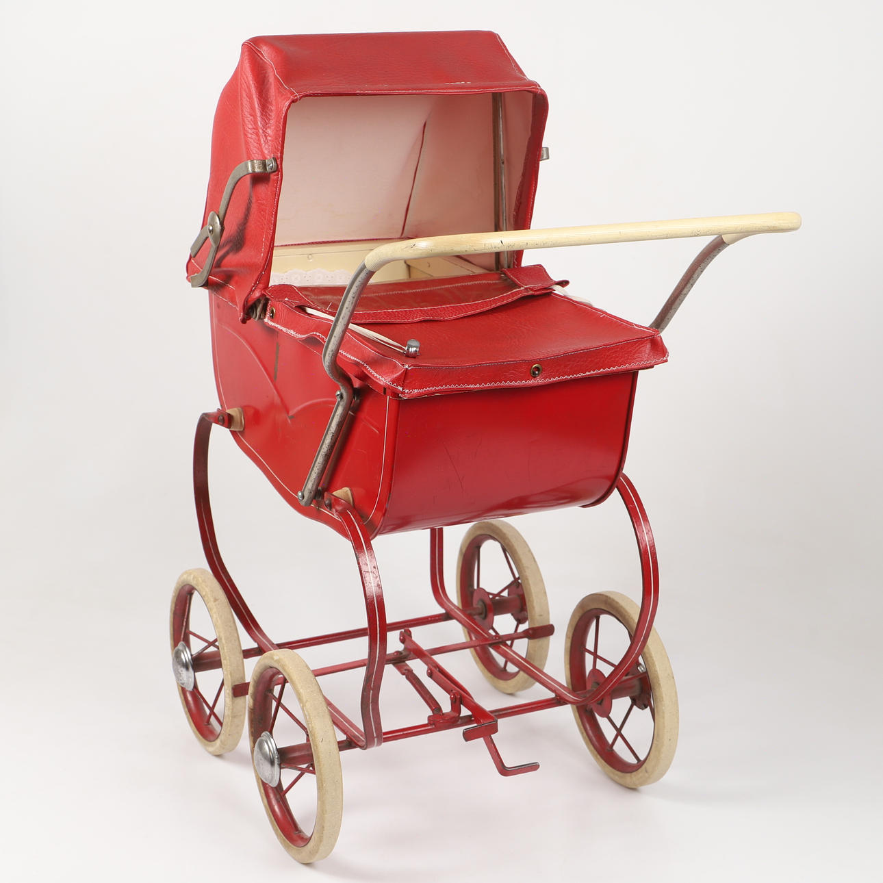 Bruks- och ytslitage, kapell senare omsytt, skador på hjulens ytskikt, smärre bucklor/repor.