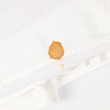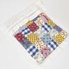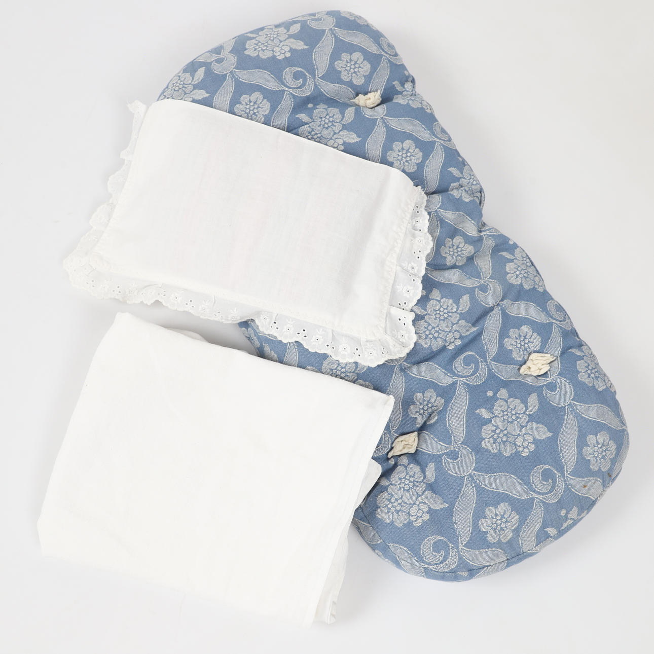 Sänglinne med spets, lapptäcke och madrass i textil