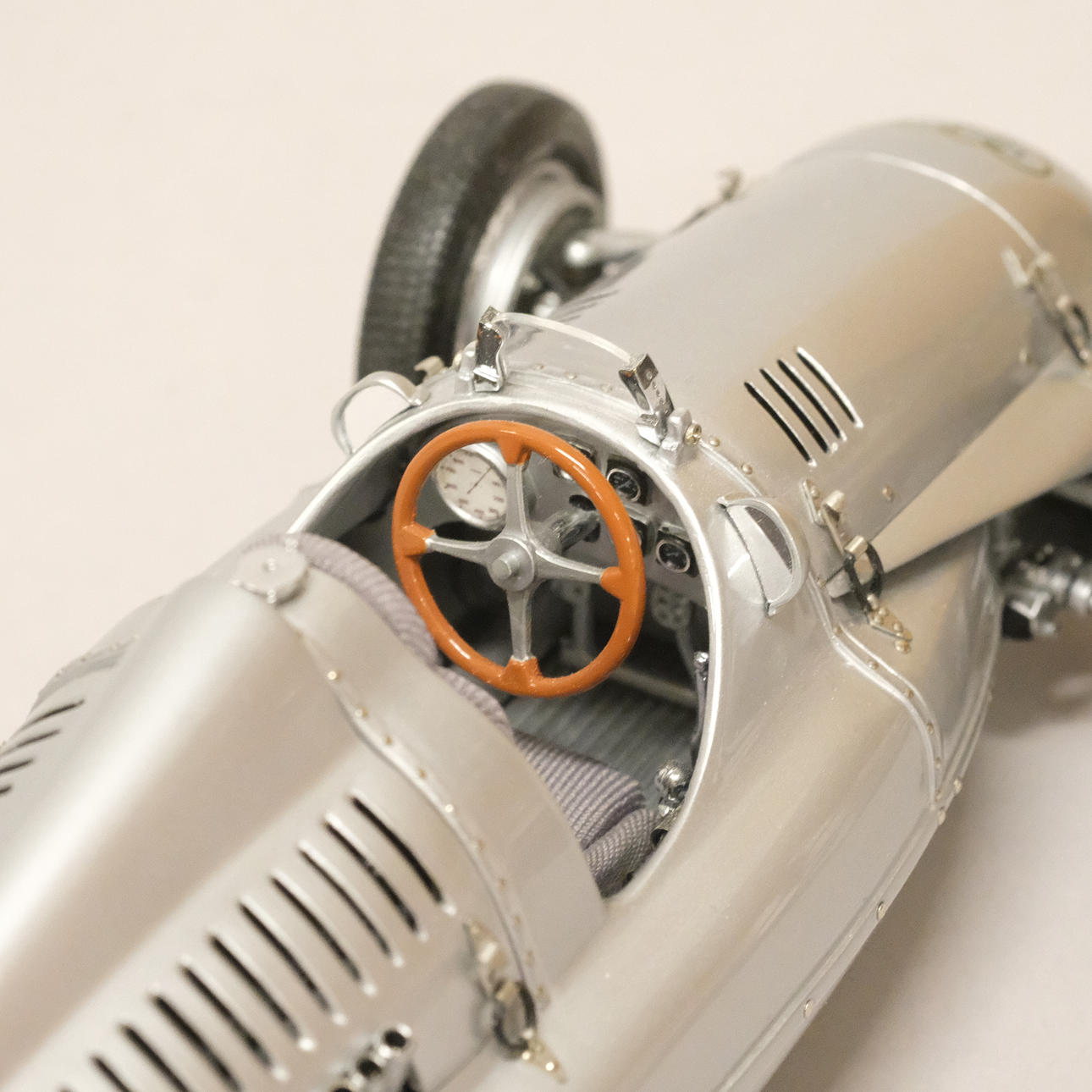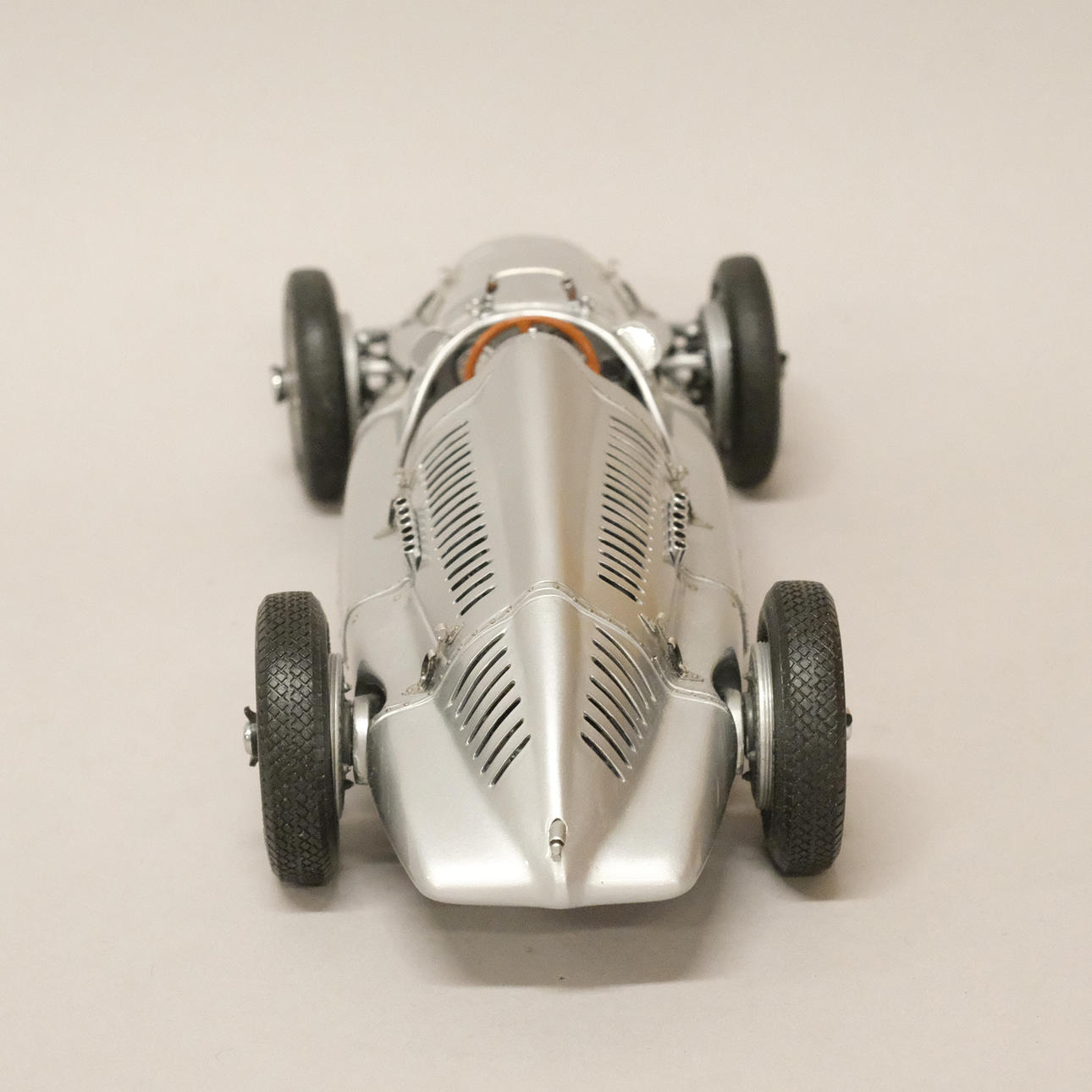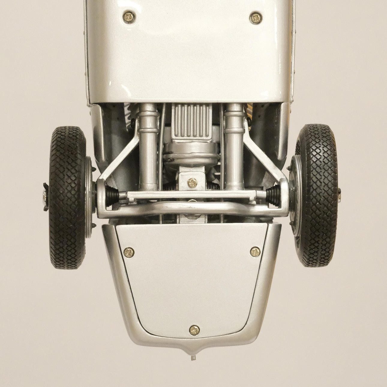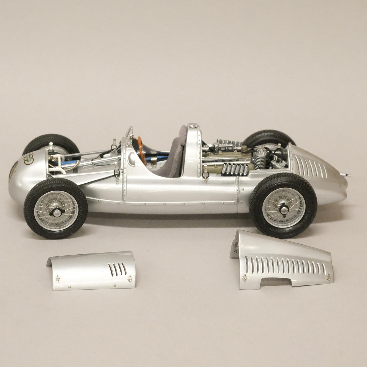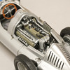 Silverlackerad metall och gummi/plast, förarstolen med textil klädsel, ett stort antal delar monterade för hand, serienummer 12721, artikelnummer M-027, längd 24 cm, bredd 10 cm.