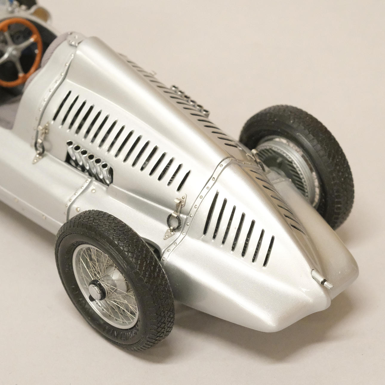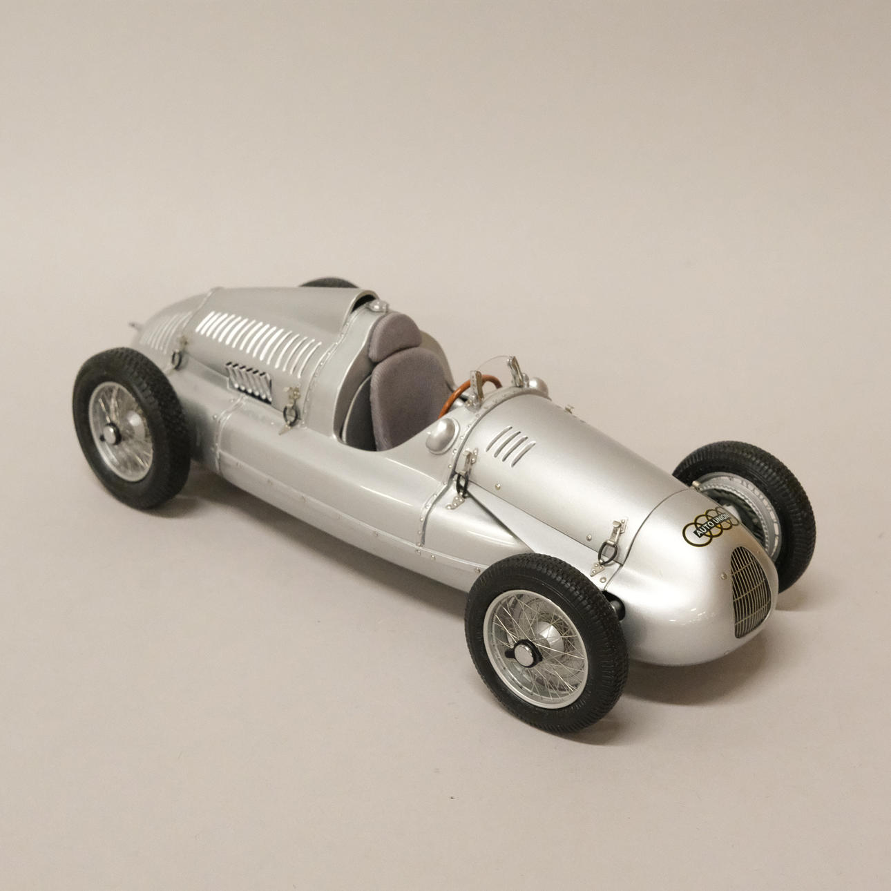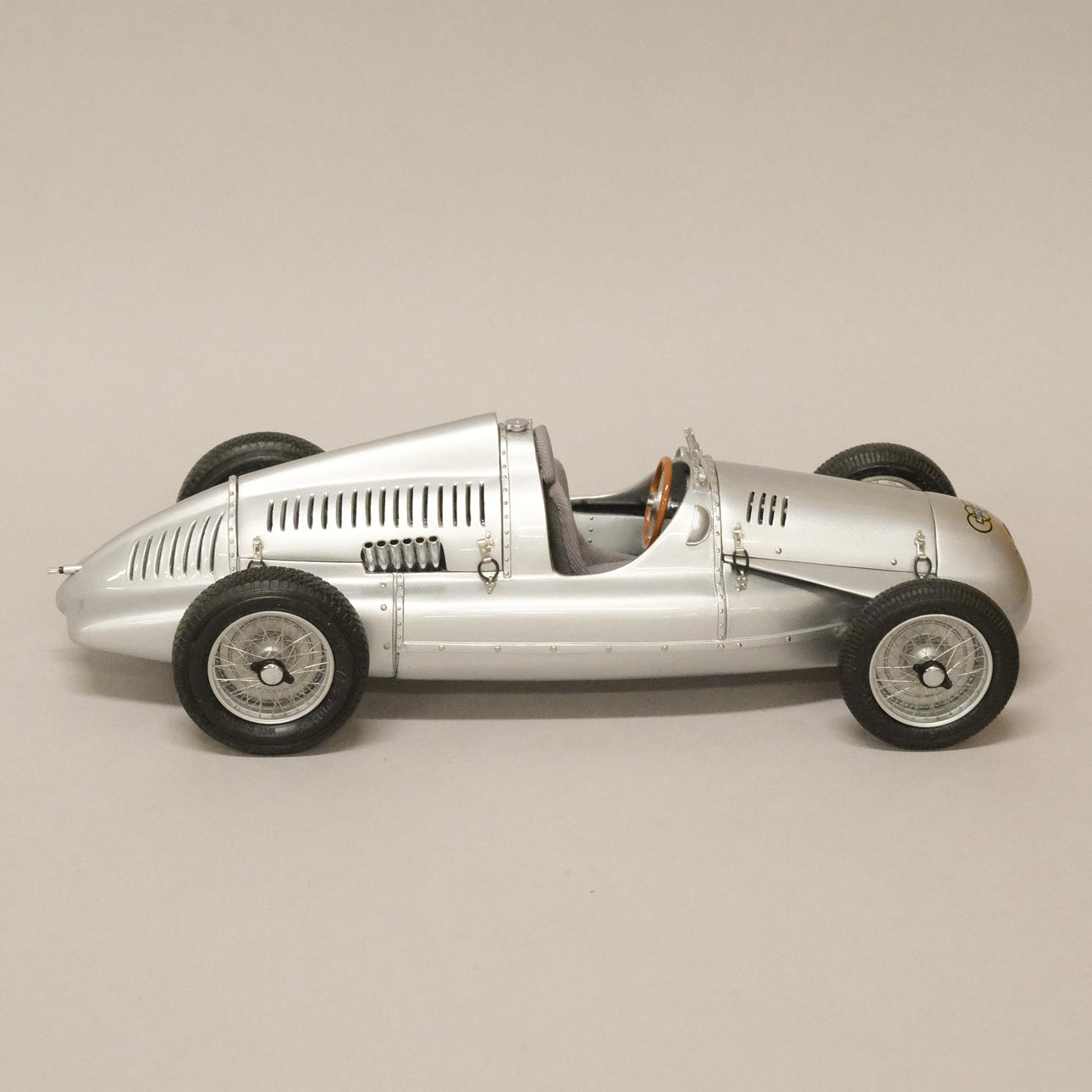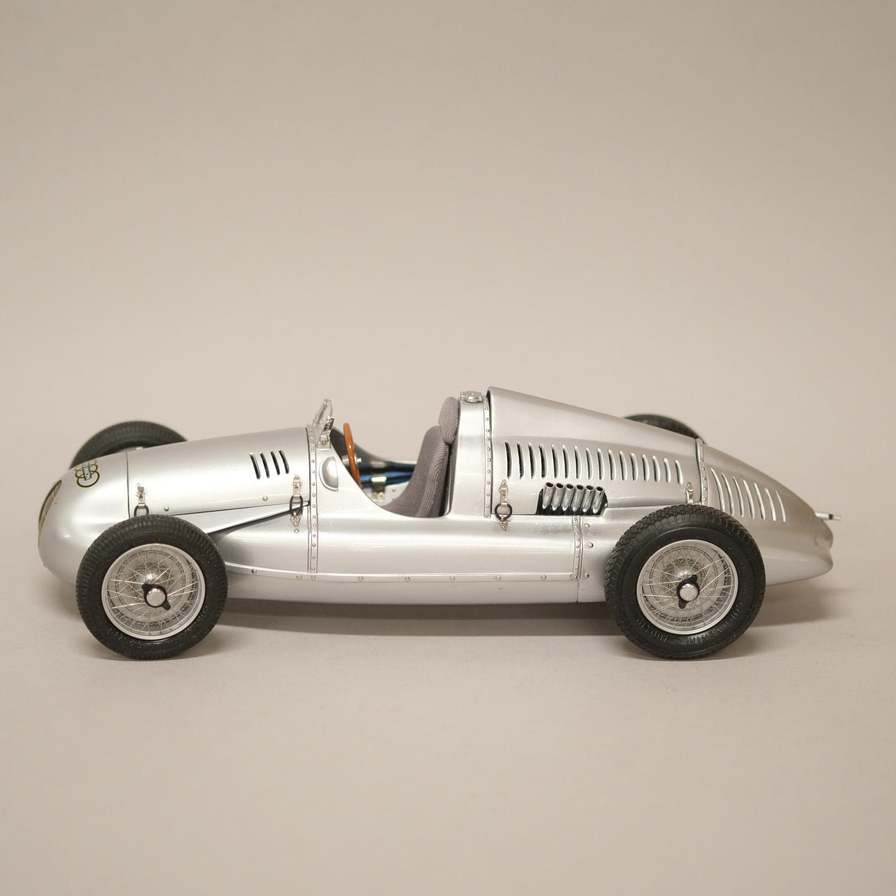 Silverlackerad metall och gummi/plast, förarstolen med textil klädsel, ett stort antal delar monterade för hand, serienummer 12721, artikelnummer M-027, längd 24 cm, bredd 10 cm.