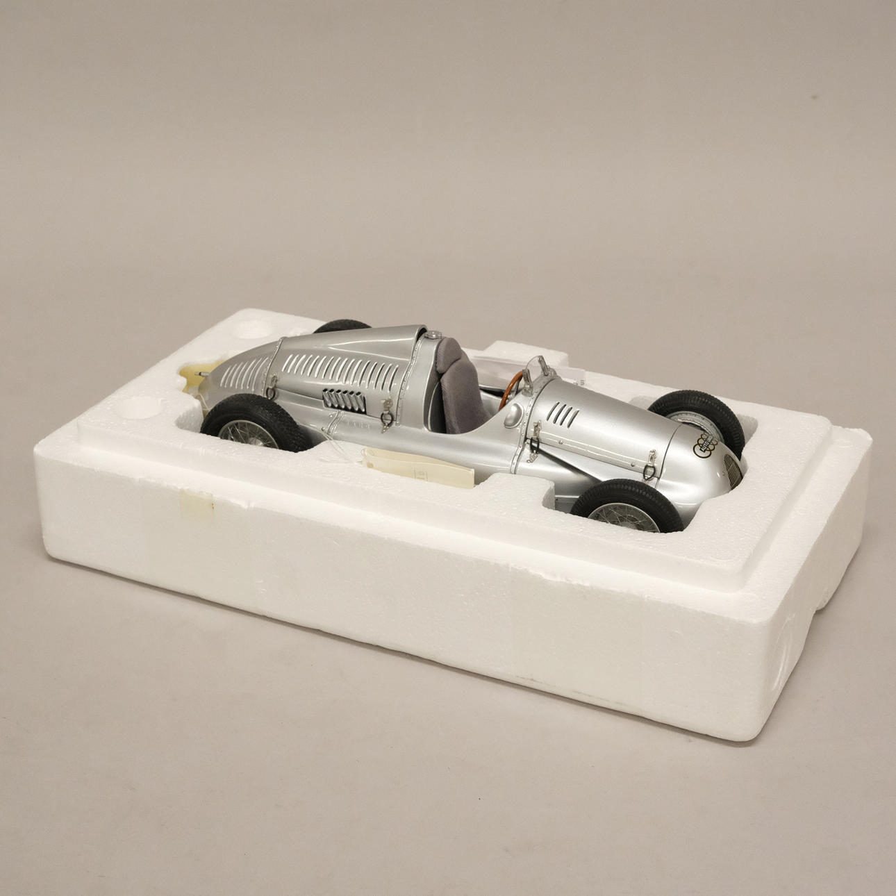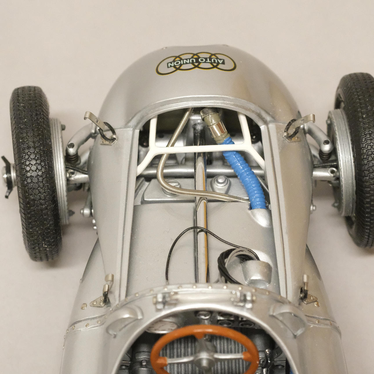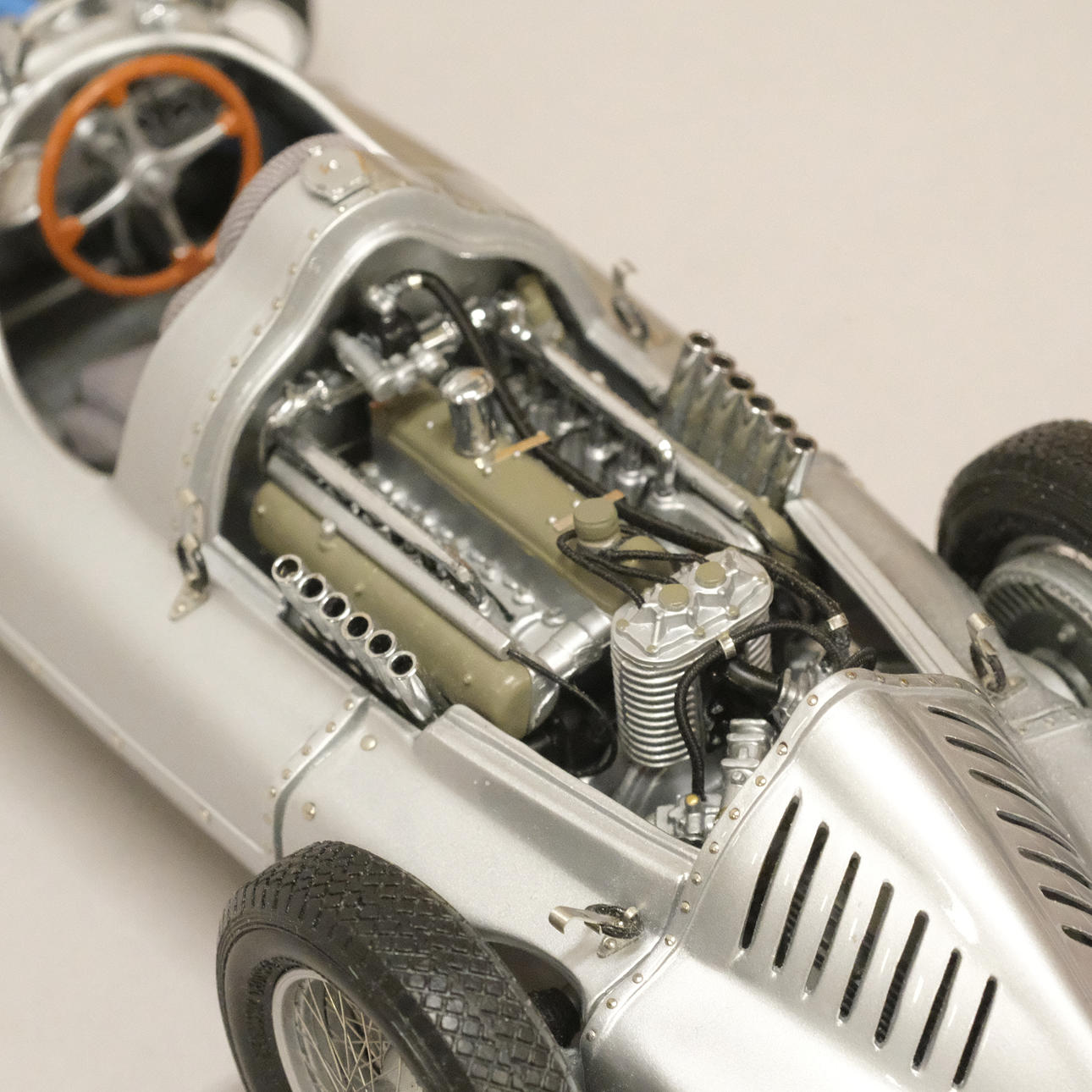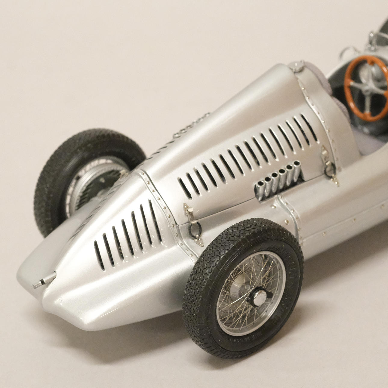 Silverlackerad metall och gummi/plast, förarstolen med textil klädsel, ett stort antal delar monterade för hand, serienummer 12721, artikelnummer M-027, längd 24 cm, bredd 10 cm.