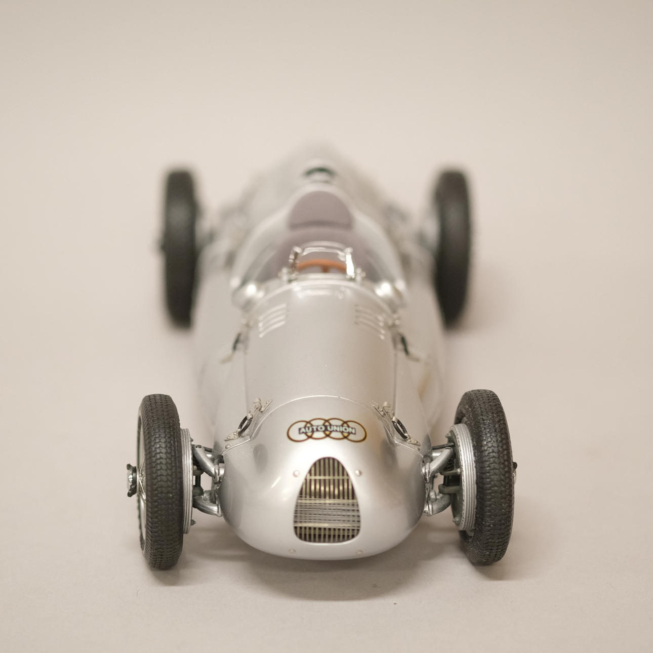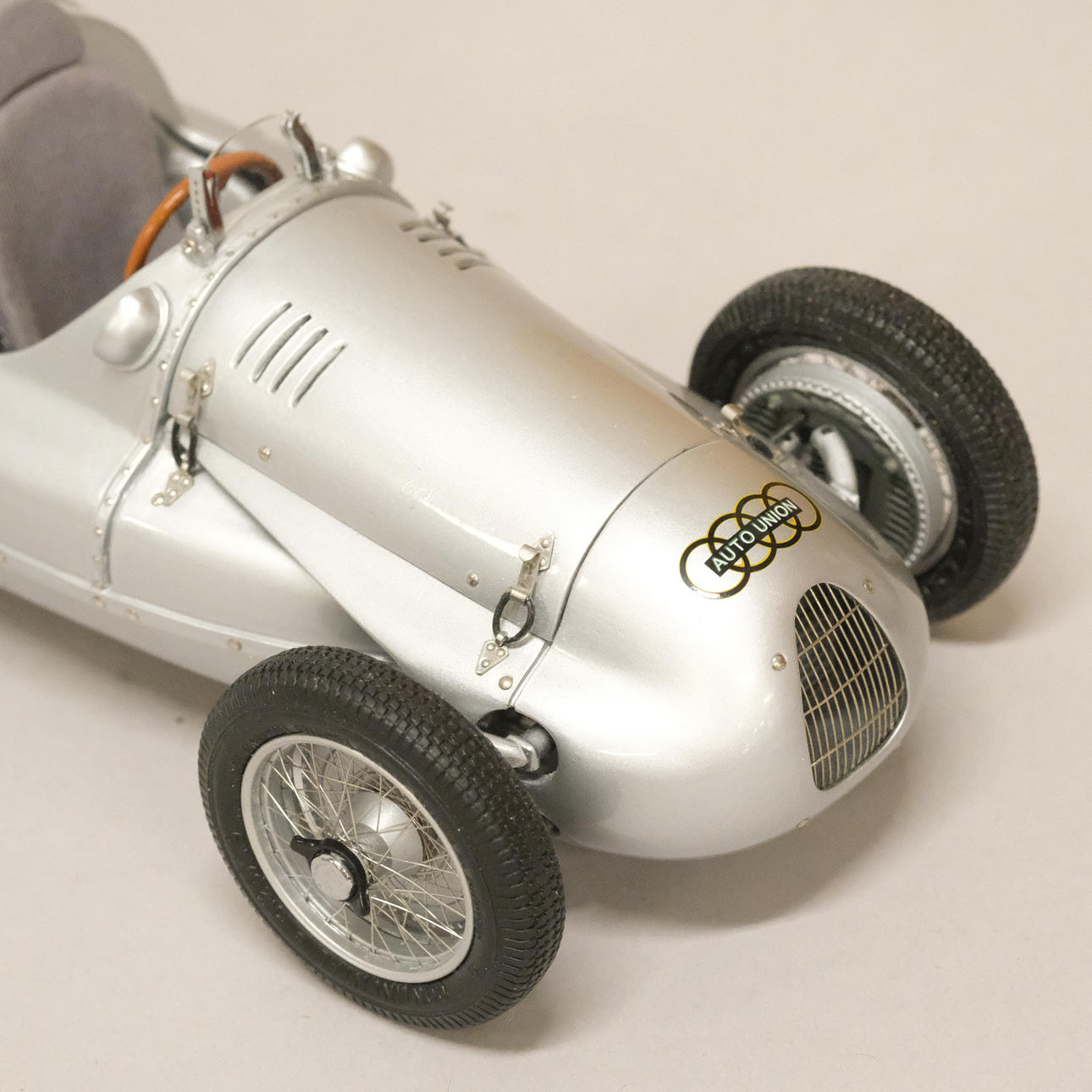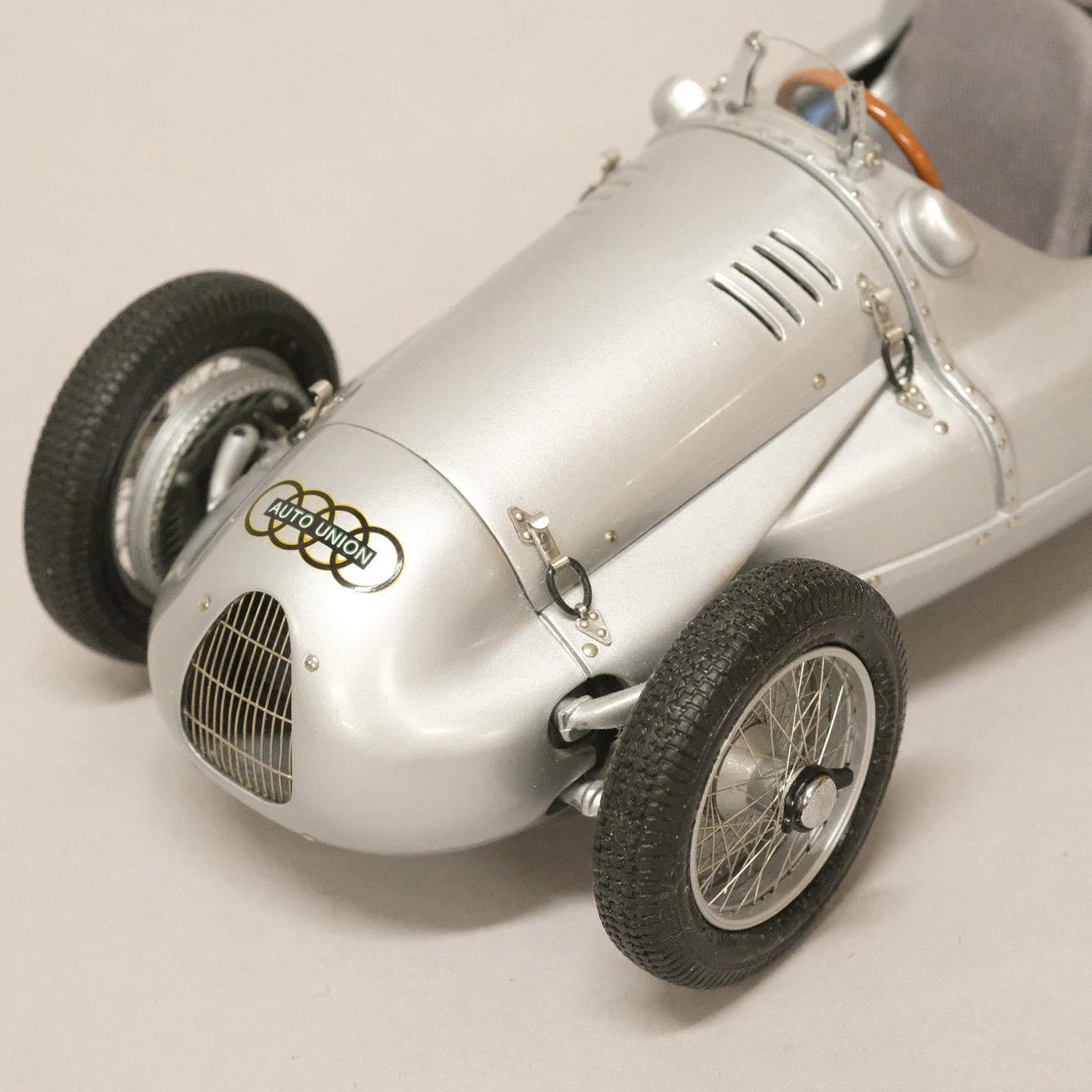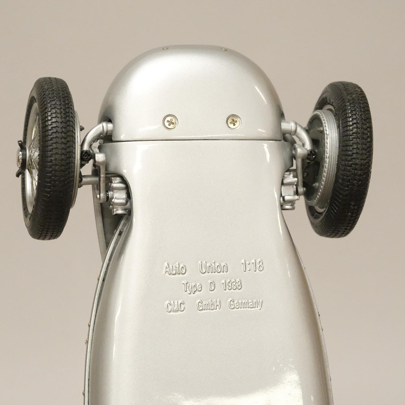 Silverlackerad metall och gummi/plast, förarstolen med textil klädsel, ett stort antal delar monterade för hand, serienummer 12721, artikelnummer M-027, längd 24 cm, bredd 10 cm.