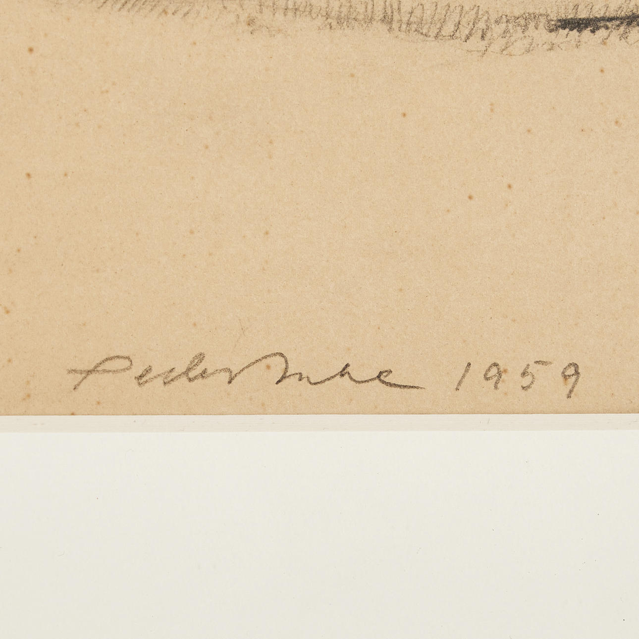 Blyerts på papper, bildyta 40 x 59 cm, inklusive ram 60 x 77 cm. Signerad Peder Duke och daterad 1959.