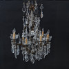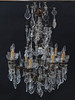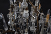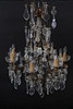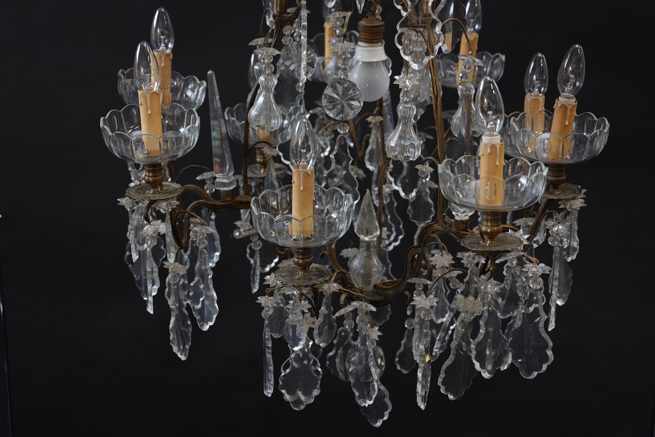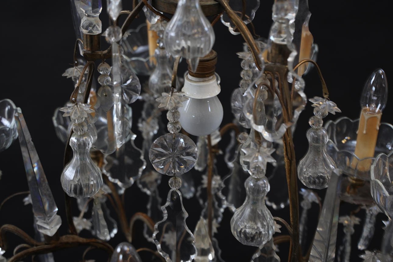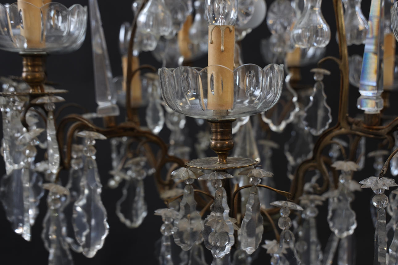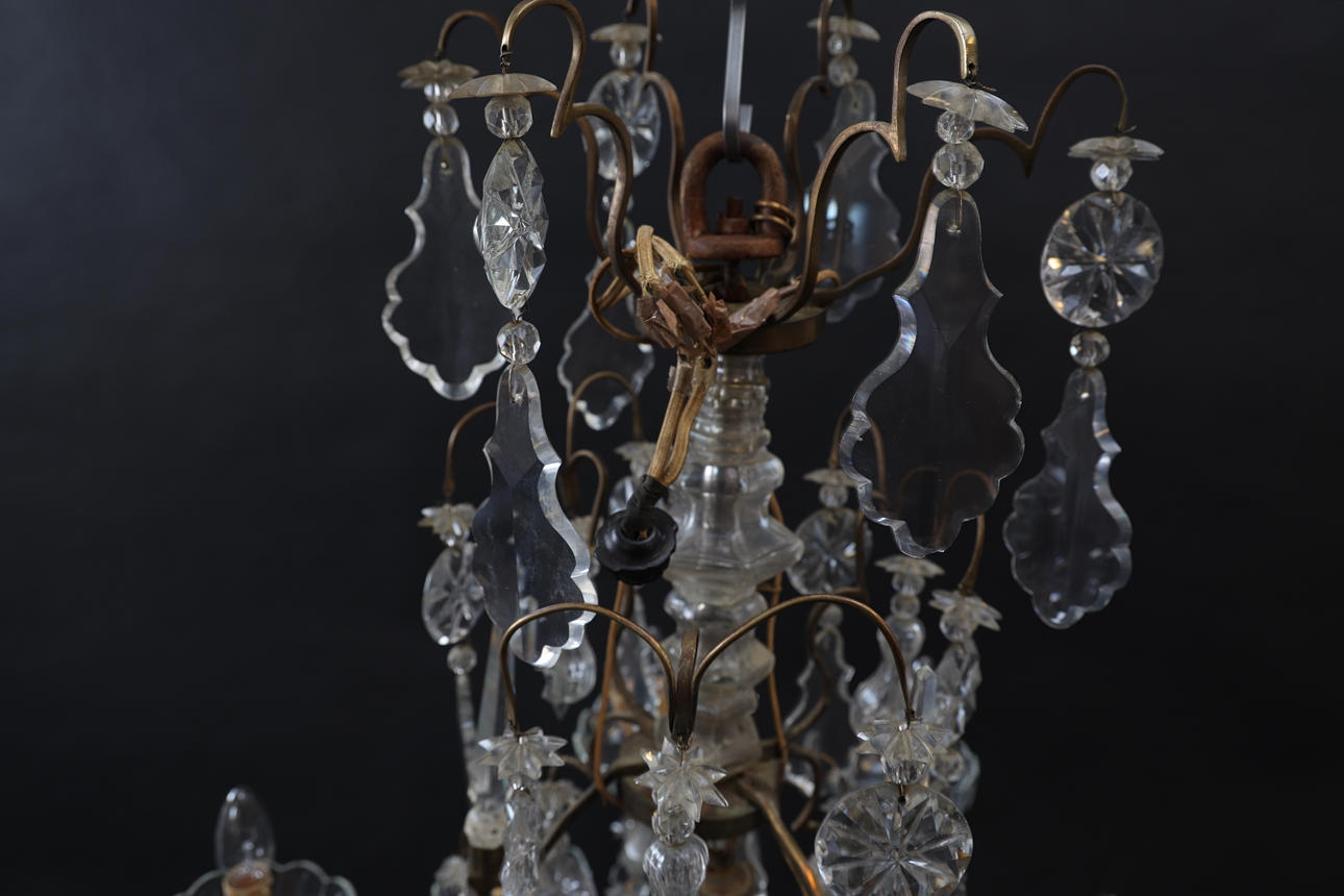 Stomme i mässing. Behängd med slipade prismor. Spjut av glas. Slipade löstagbara manschetter. Med 10st ljuspunkter.