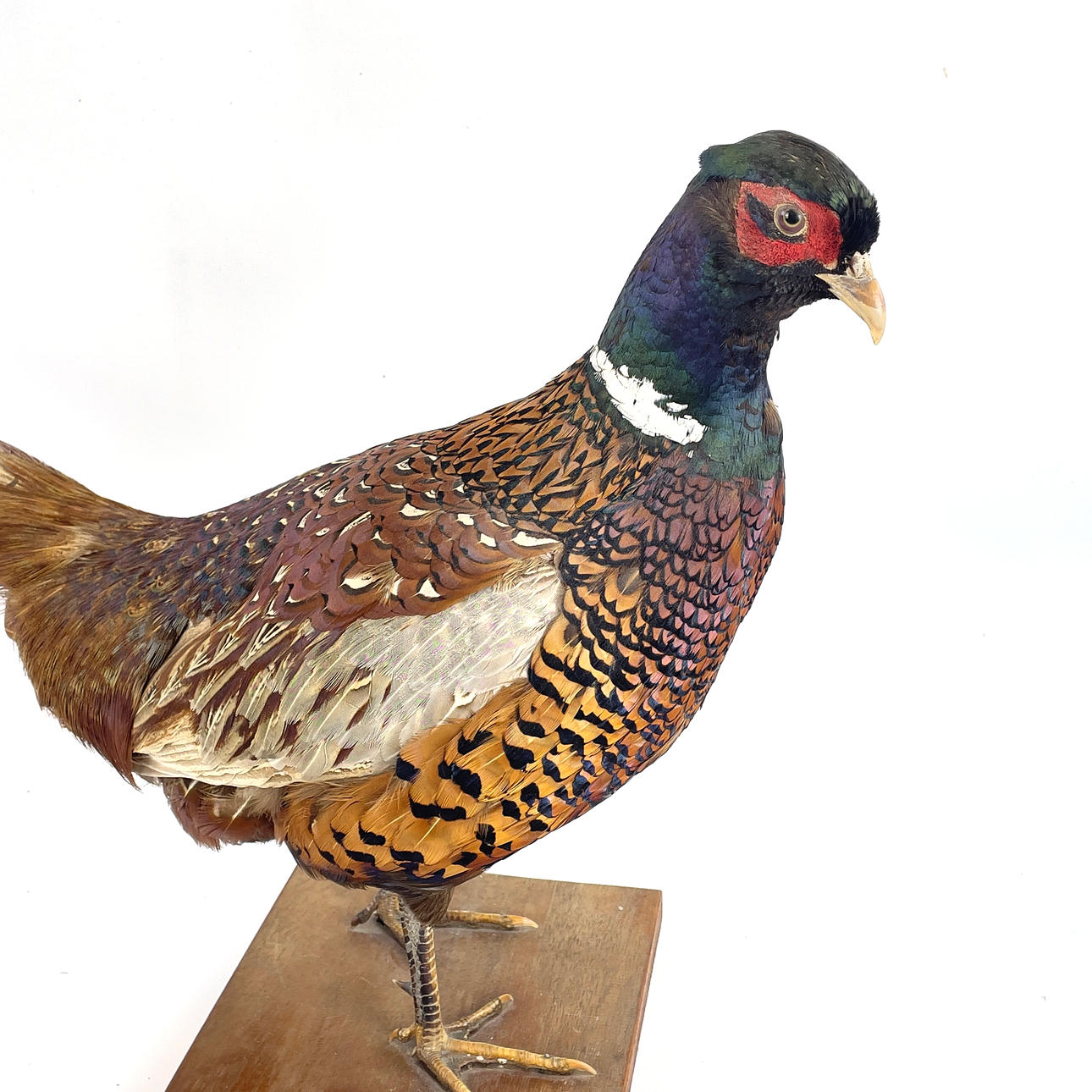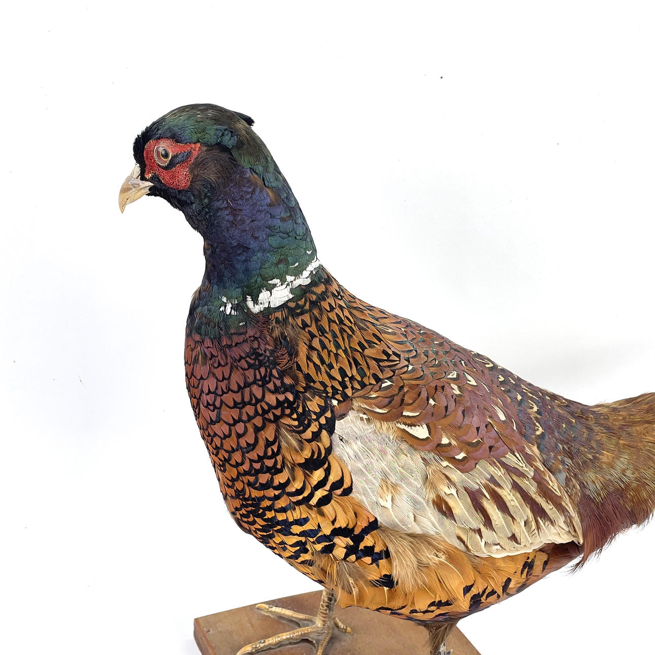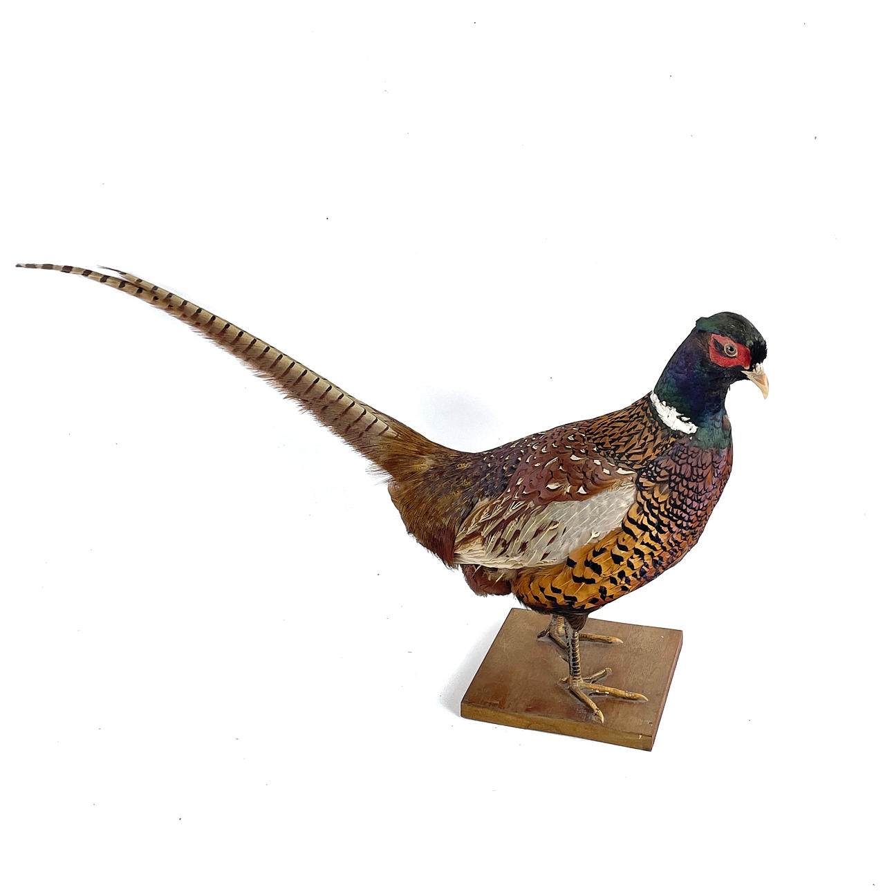 Uppstoppad fasan monterad på träplatta.