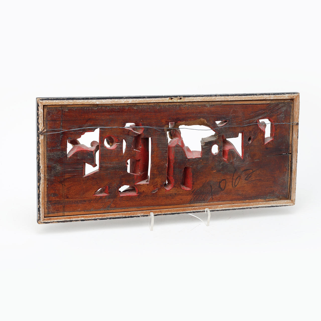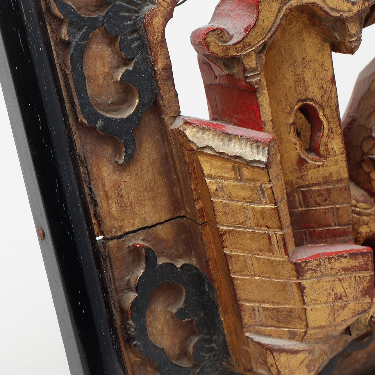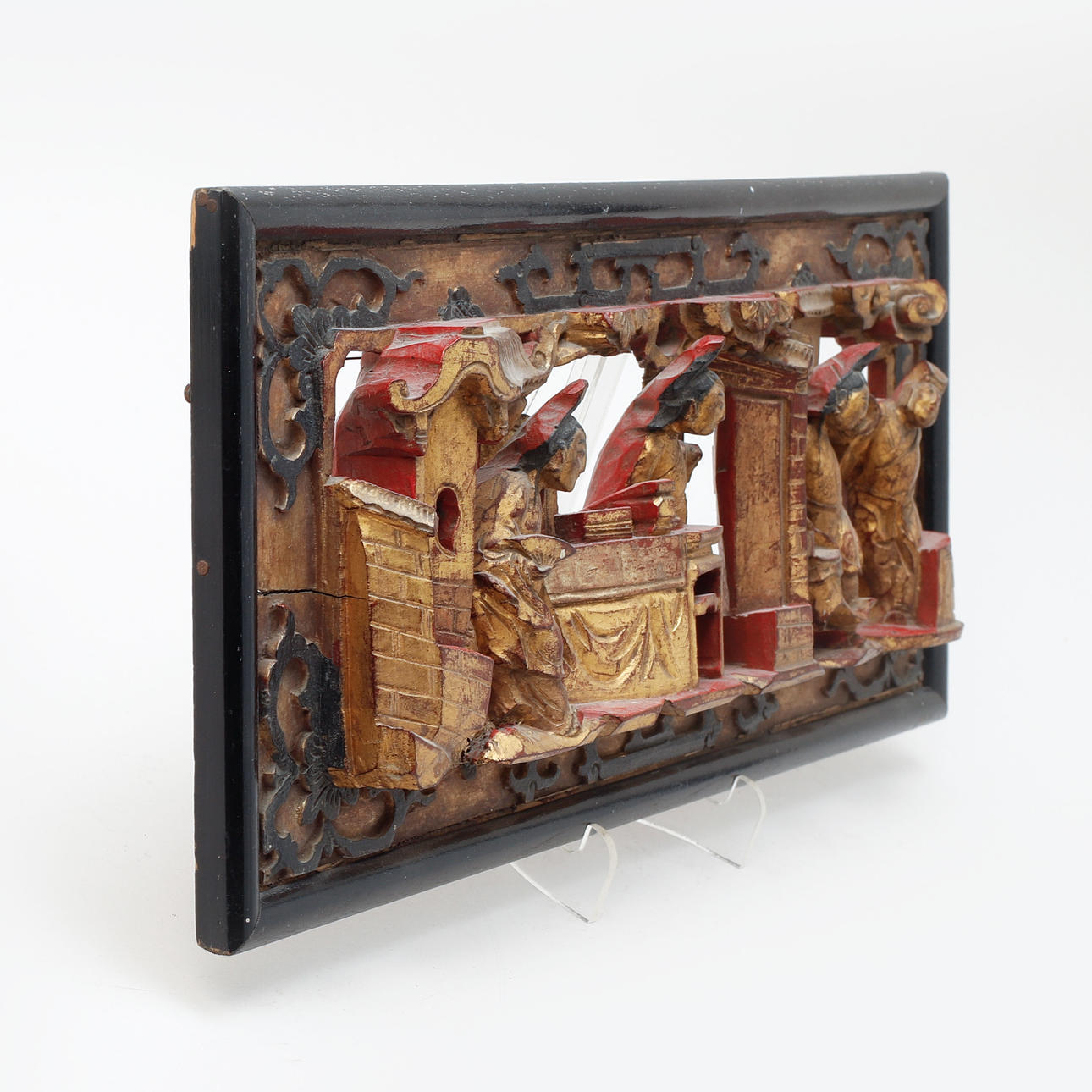 Utskuren dekor av figurscen. Förgylld och lack. 18 x 42 cm.