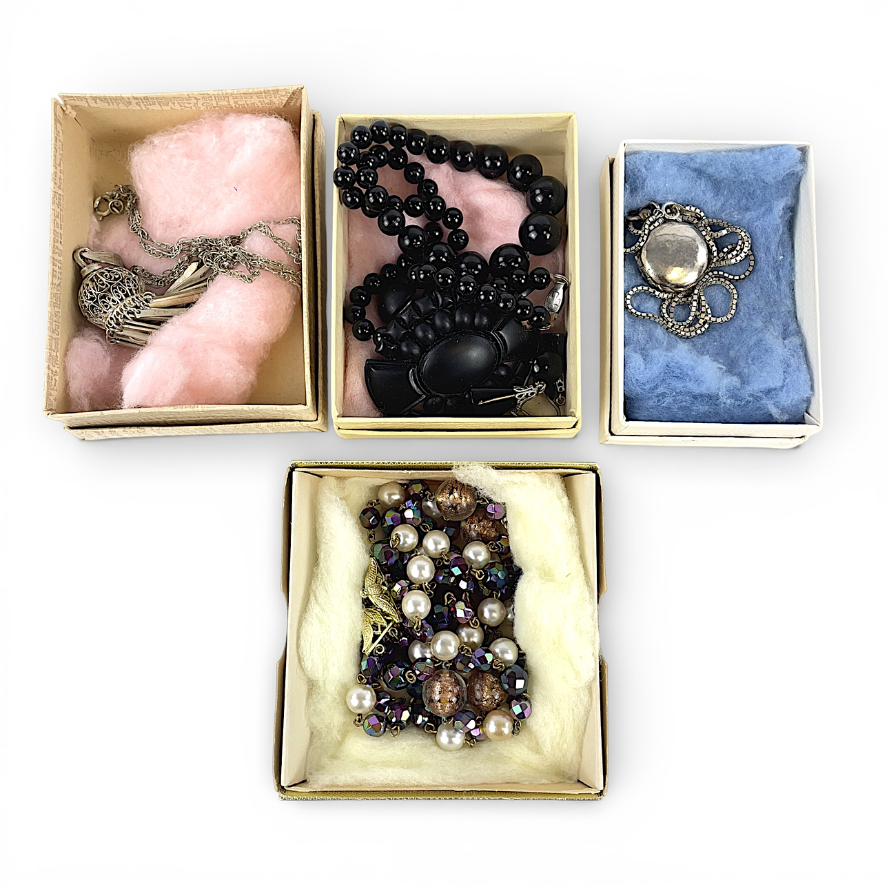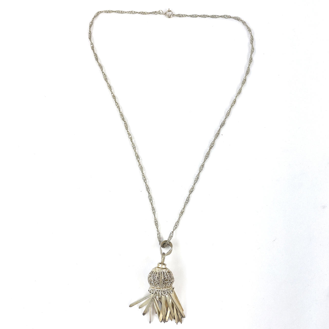 1 st collier med hänge i filigran, vitmetall, längd ca 55 cm, hänge ca 6 cm.