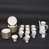 20 koppar, höjd 7 cm, 21 fat, diameter 14 cm, 18 assietter, diameter 17 cm, kaffekanna, höjd 22 cm, gräddkanna, höjd 9 cm samt sockerskål, höjd 11 cm.