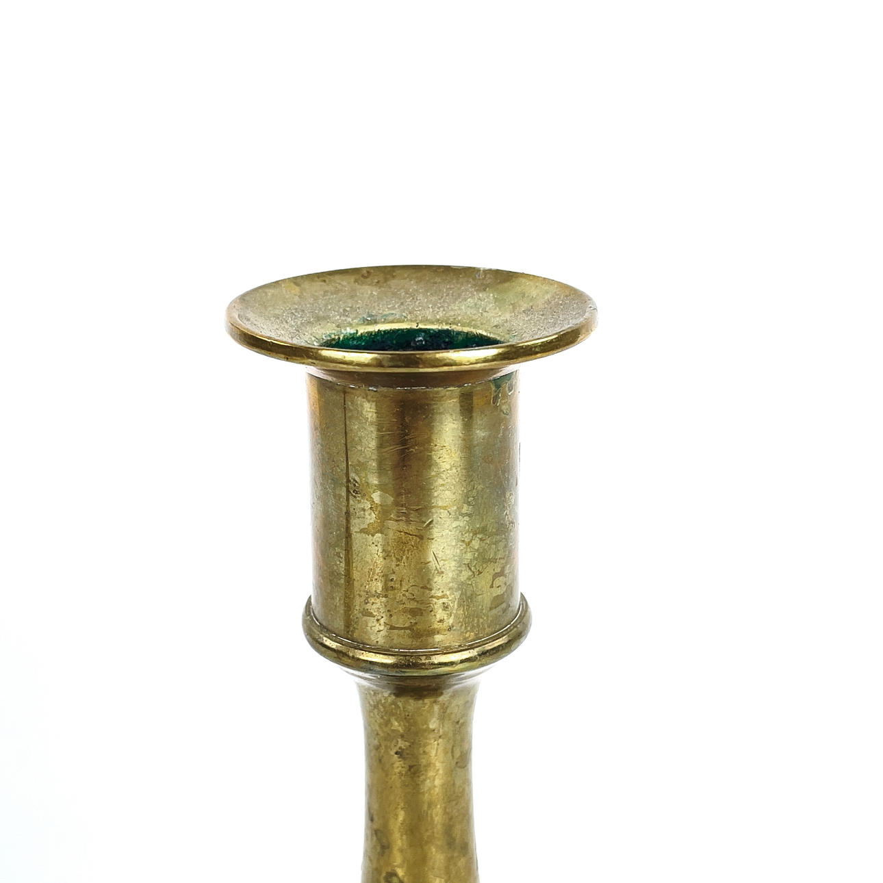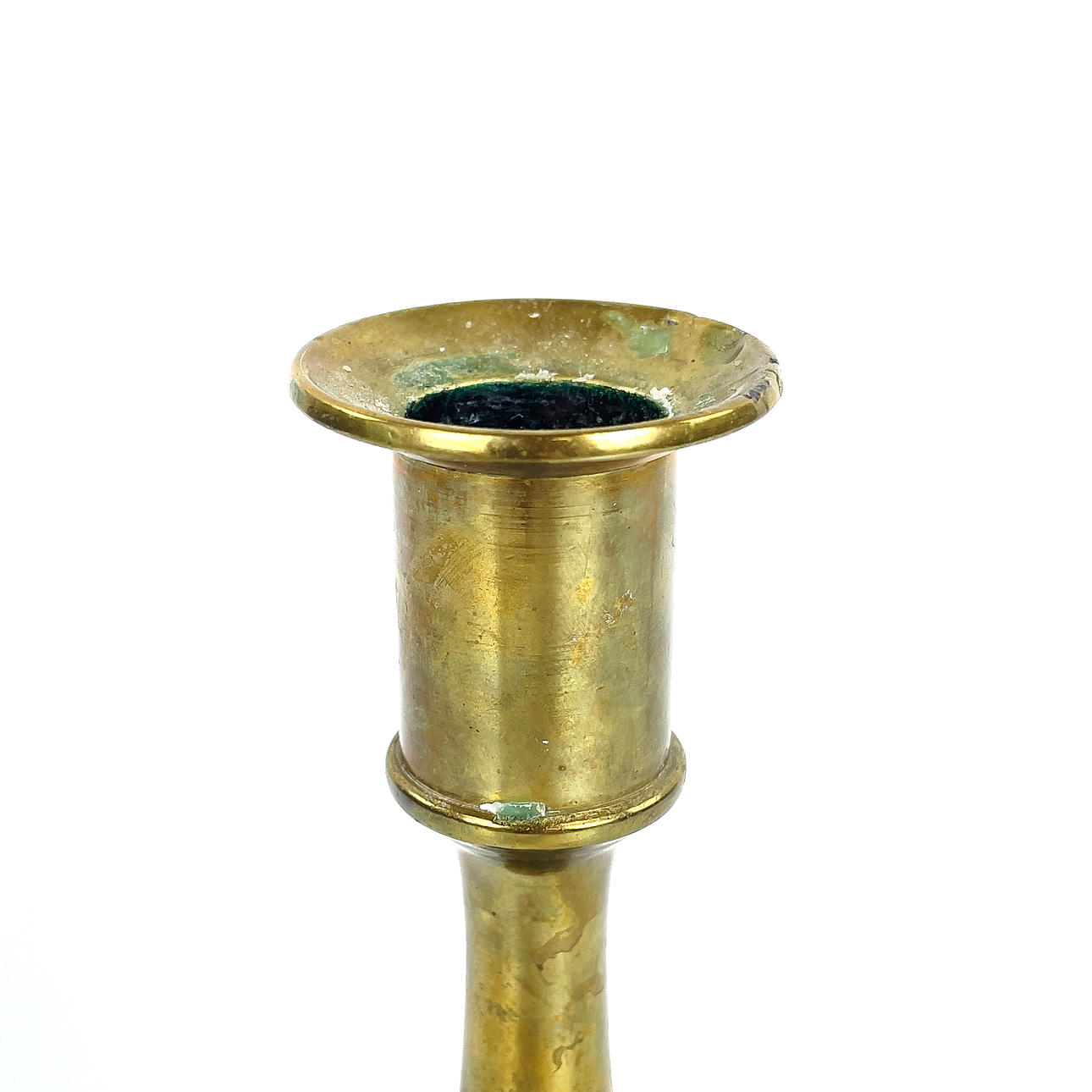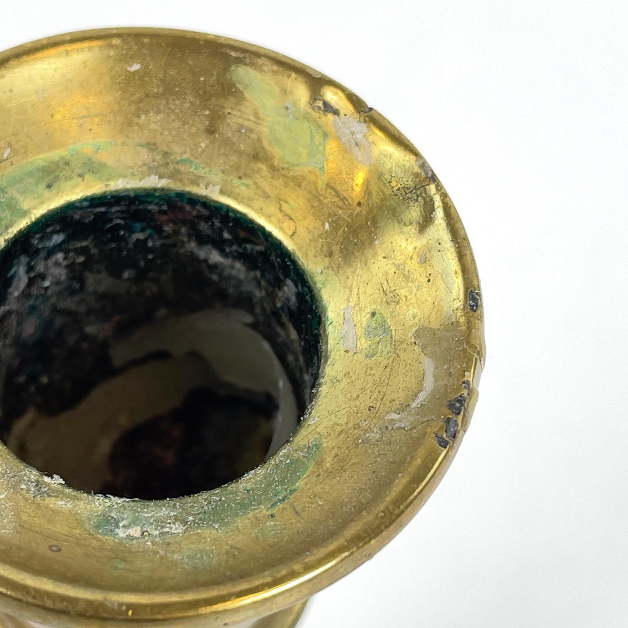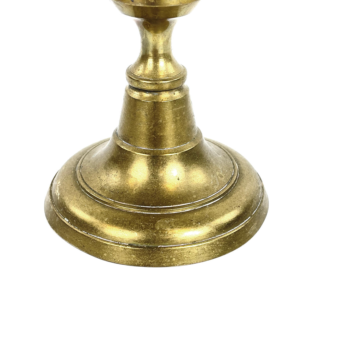 Bruksslitage, ena ljusstaken med bucklig ljushållarkant, rostiga skadade skruvar.