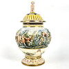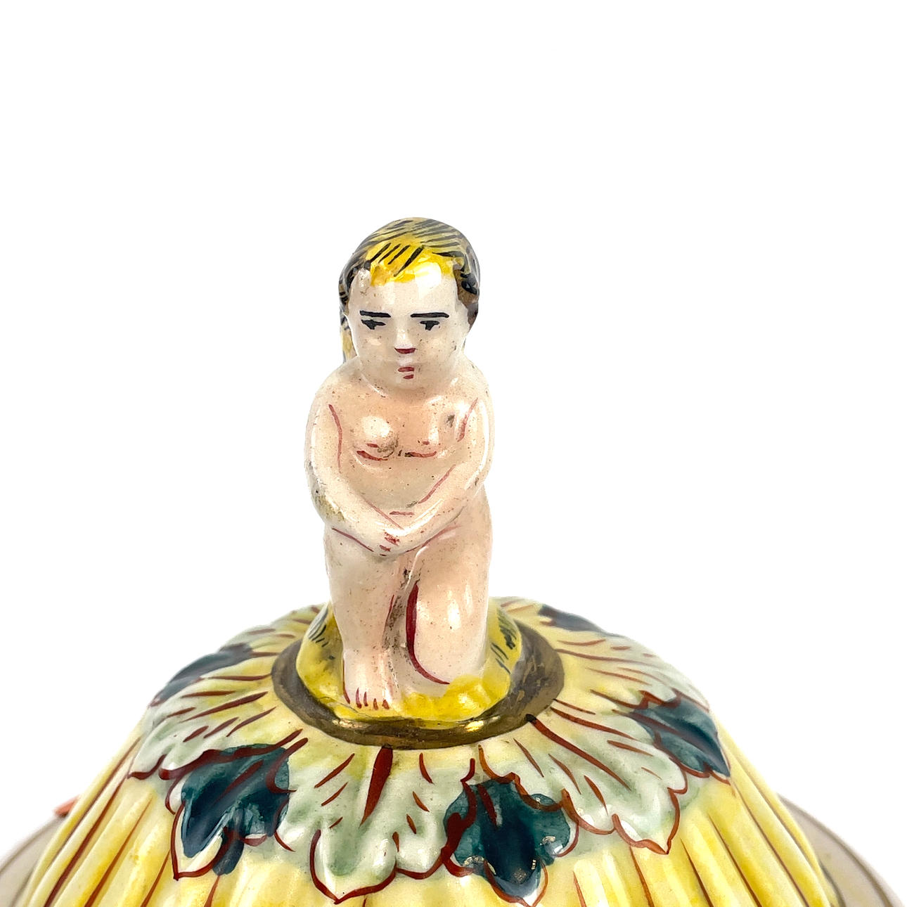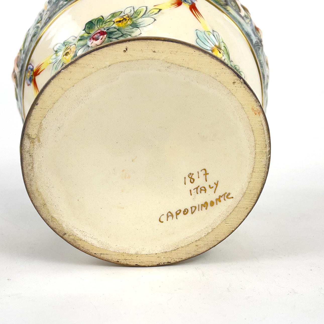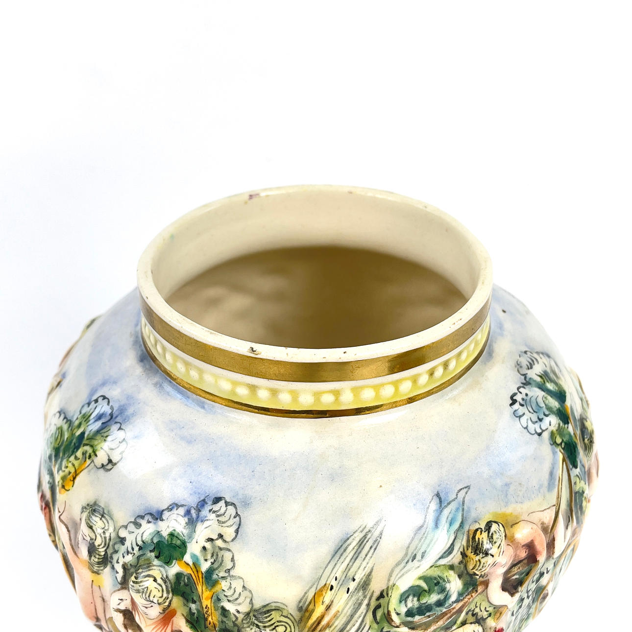 Glaserad porslin med handmålad dekor i relief av puttis. Förgyllda detaljer. Signerad undertill "1817 Italy Capodimonte".