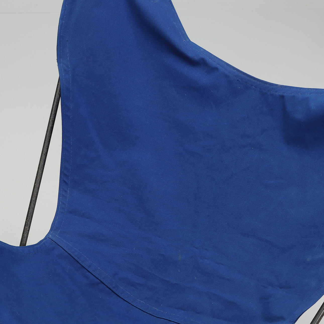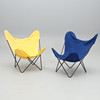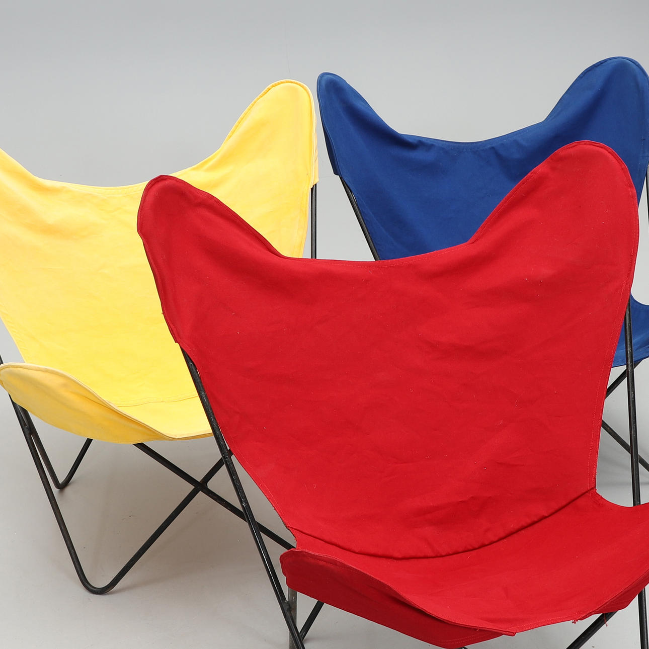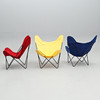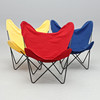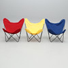 Svartlackerad metallstomme, löstagbar textilsits i rött, blått och gult. Bredd 85, djup 75, höjd 85 cm.