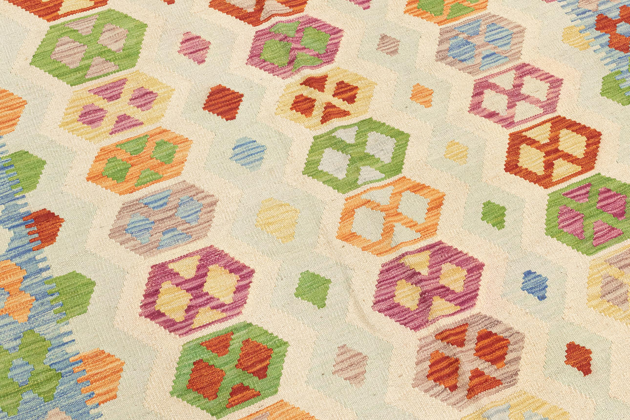Handvävd Kelim i klassisk design med geometriskt mönster i polykrom färgskala.