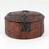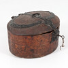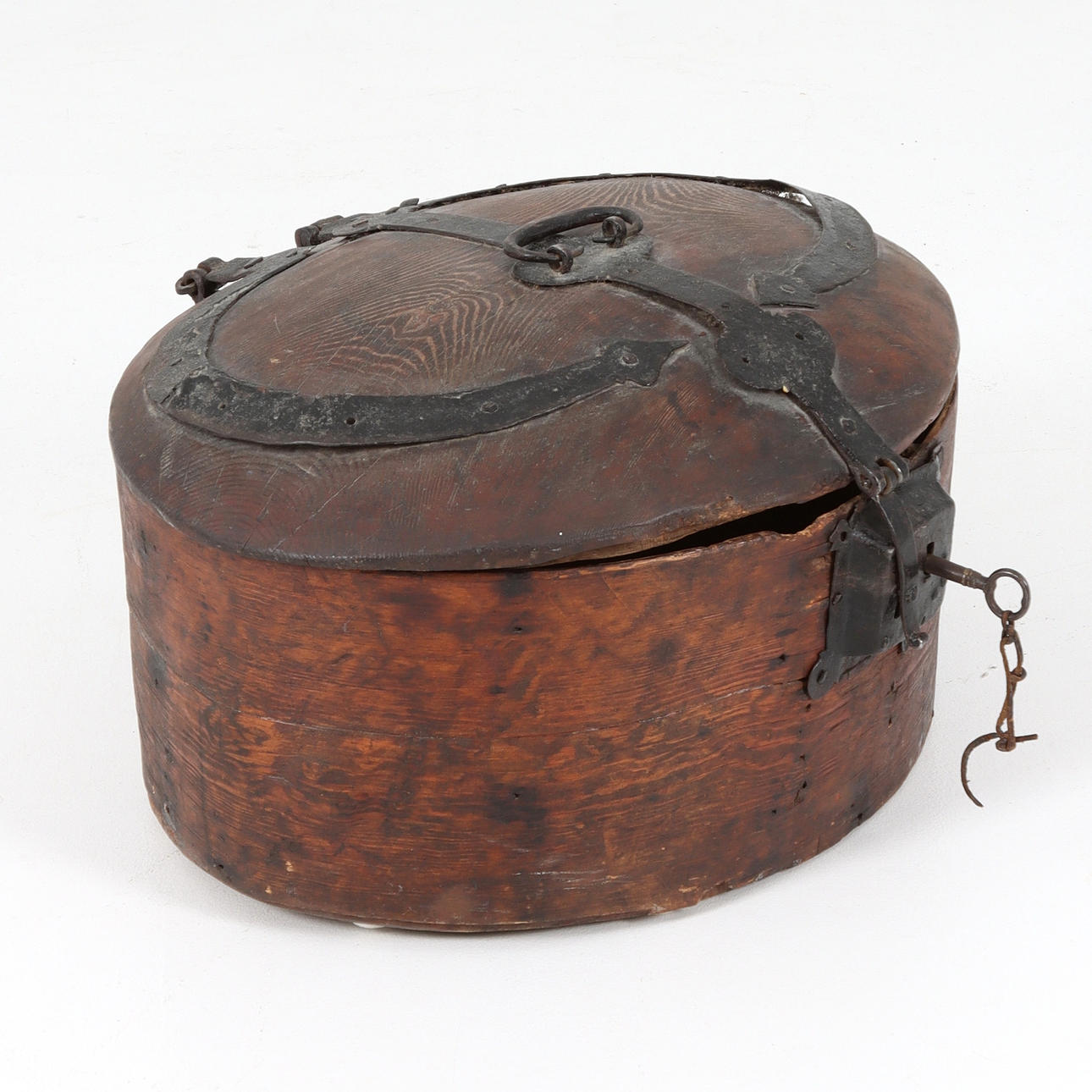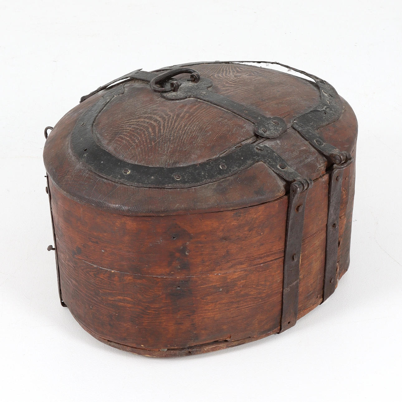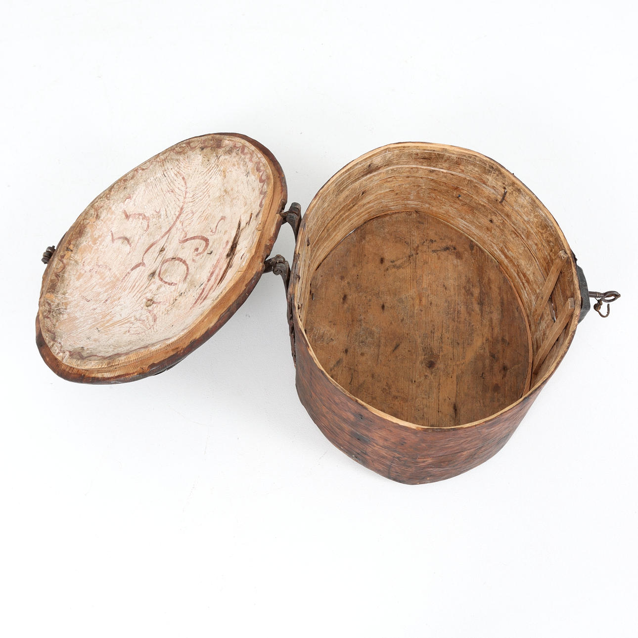 Oval form, stomme av furu, invändigt bemålad lock daterat 1835. Beslag i smidesjärn.