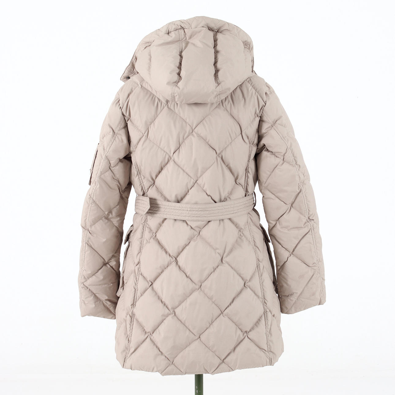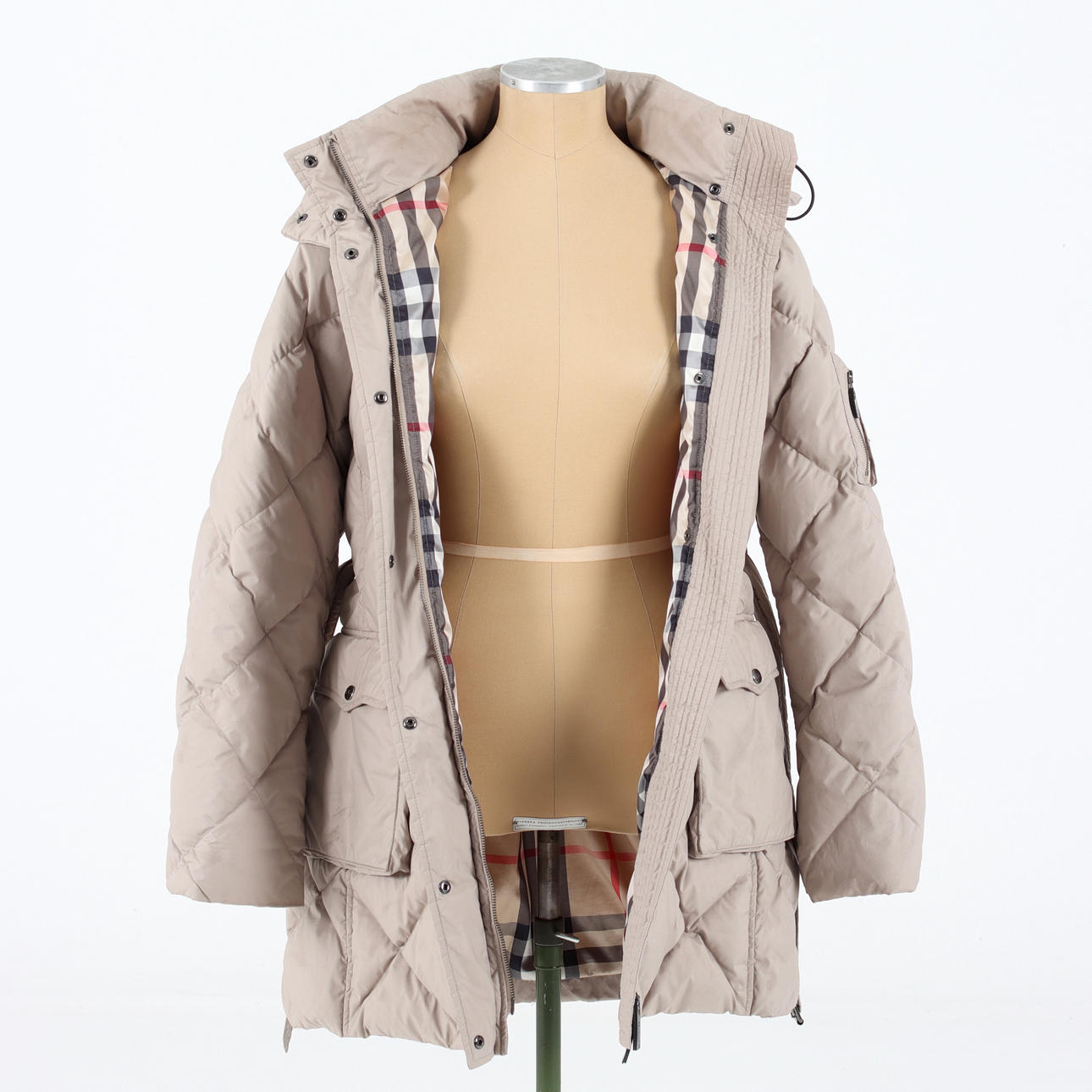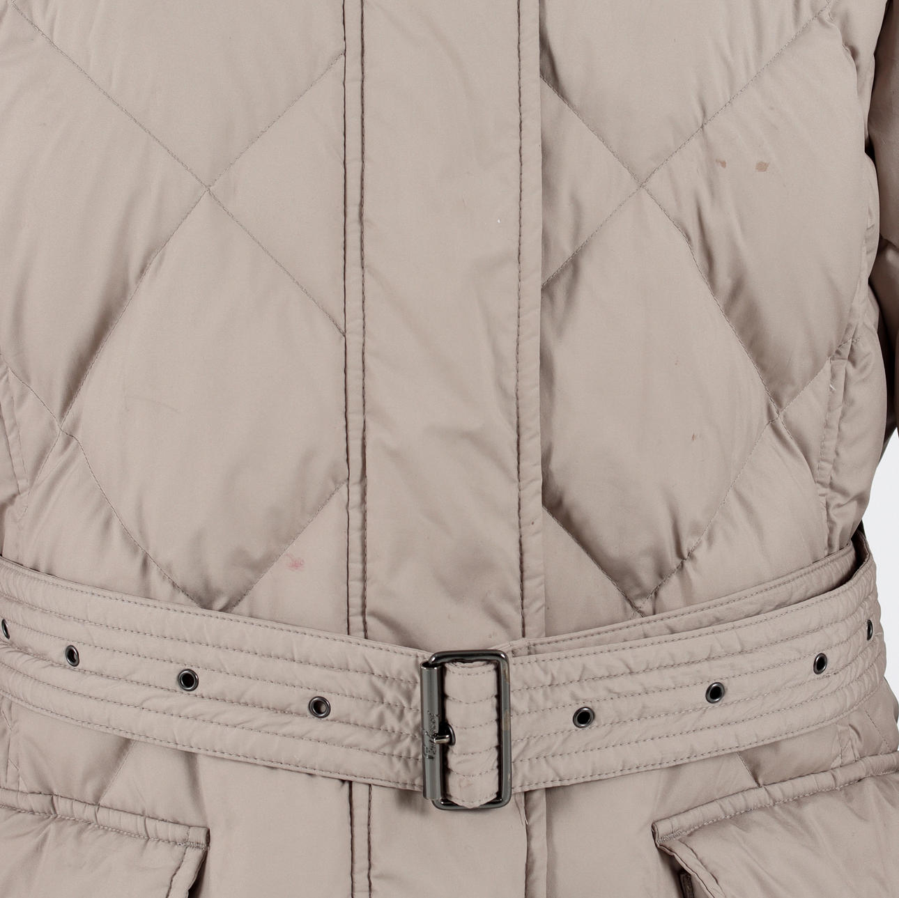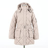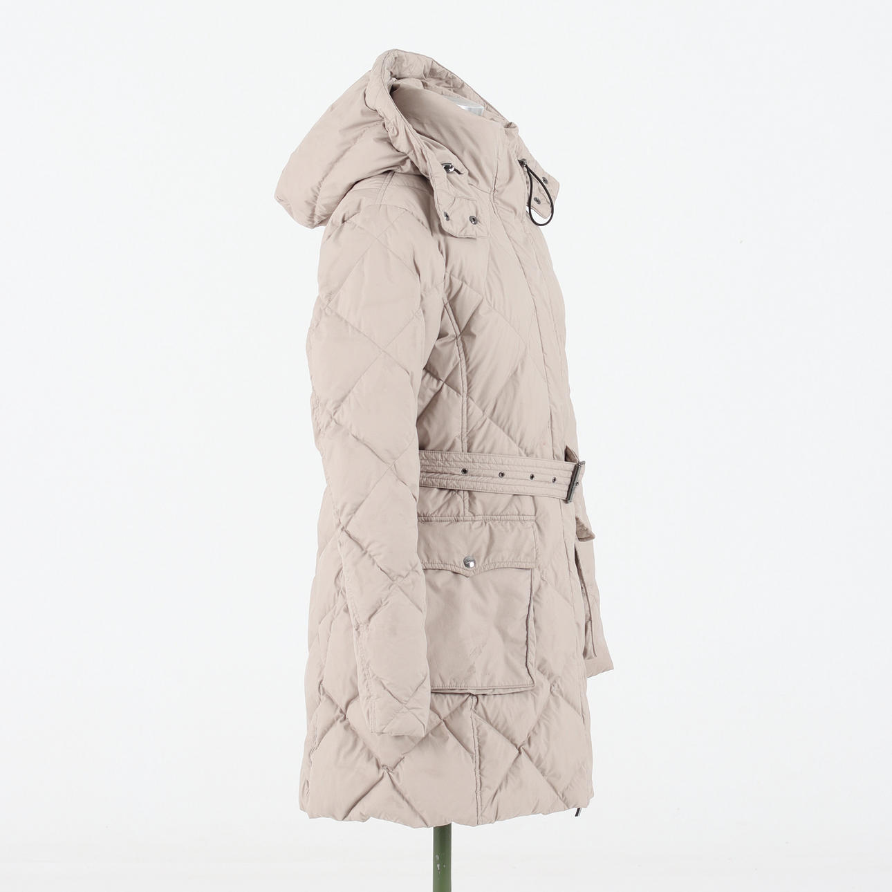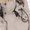 Midja med skärp, två utanpåliggande fickor med knapp, Blixtlås och vindlås. Avtagbar kapuschong.