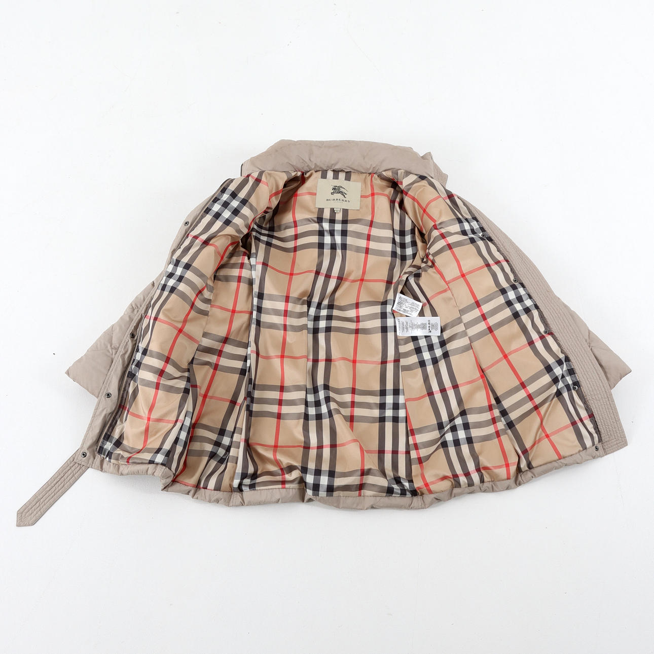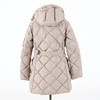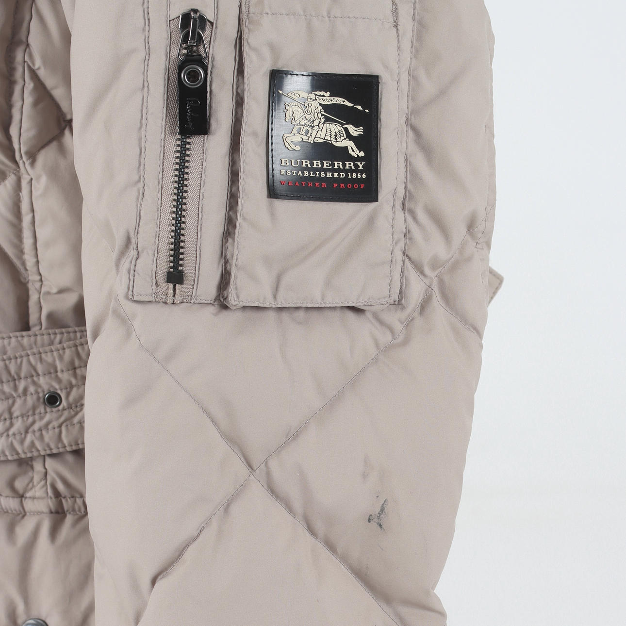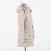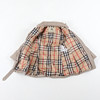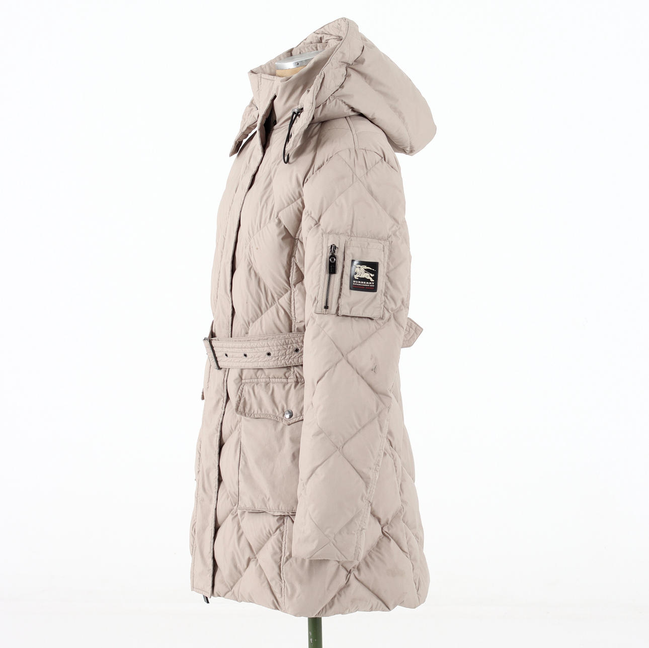 Midja med skärp, två utanpåliggande fickor med knapp, Blixtlås och vindlås. Avtagbar kapuschong.