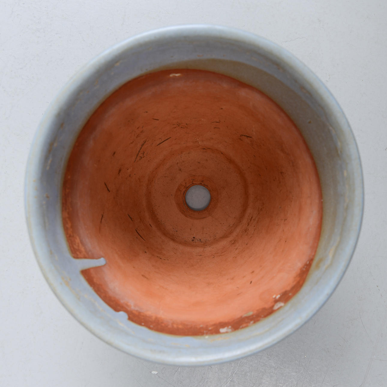 Hål i botten för avrinnging. Lergods. Höjd 12 cm. Diameter 15,5 cm.