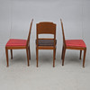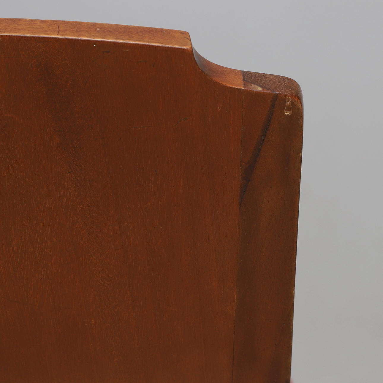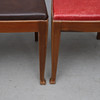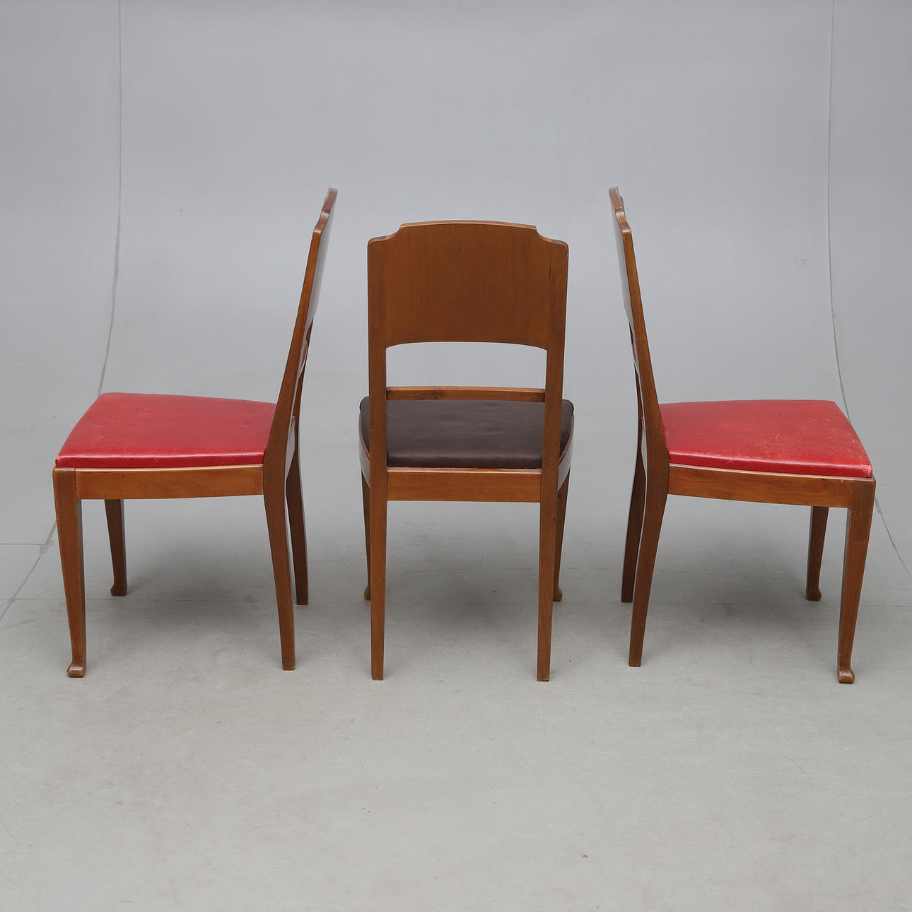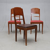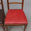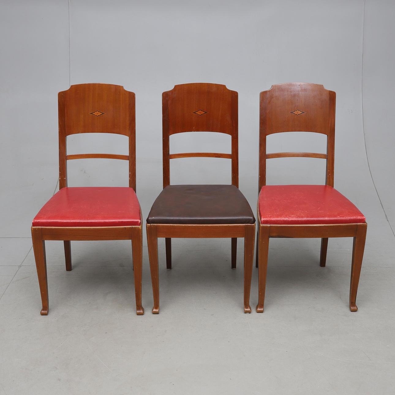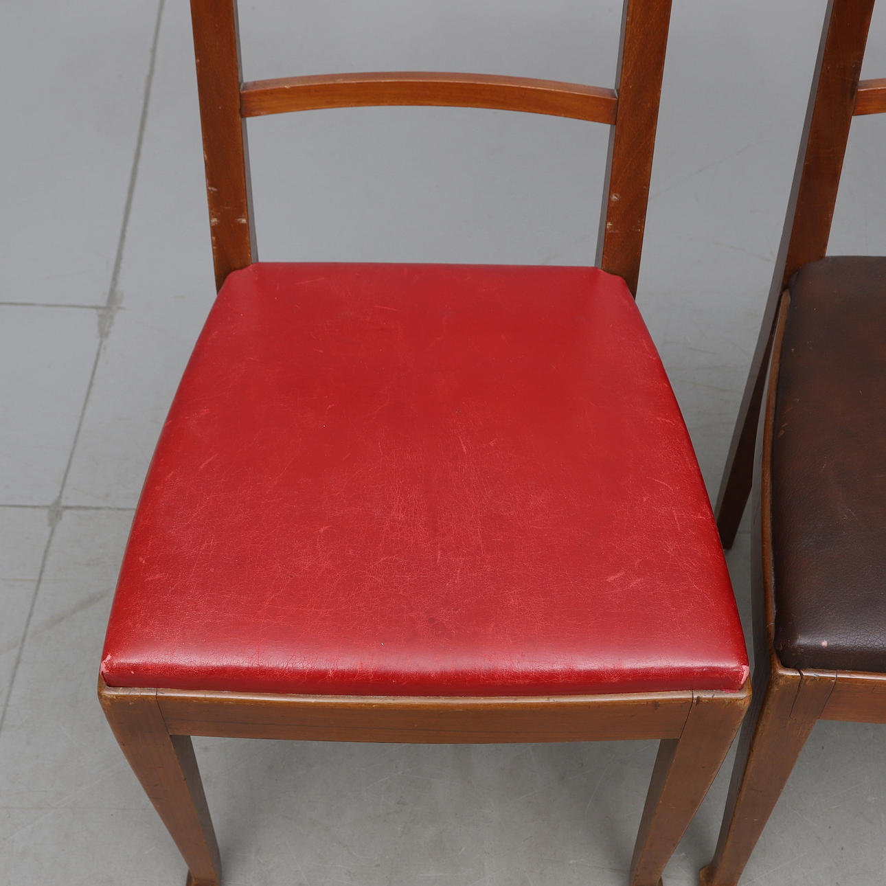 Fanerade med olika träslag. Lös stoppad sits med skinn/konstskinn. Höjd ca 92 cm.