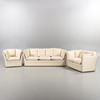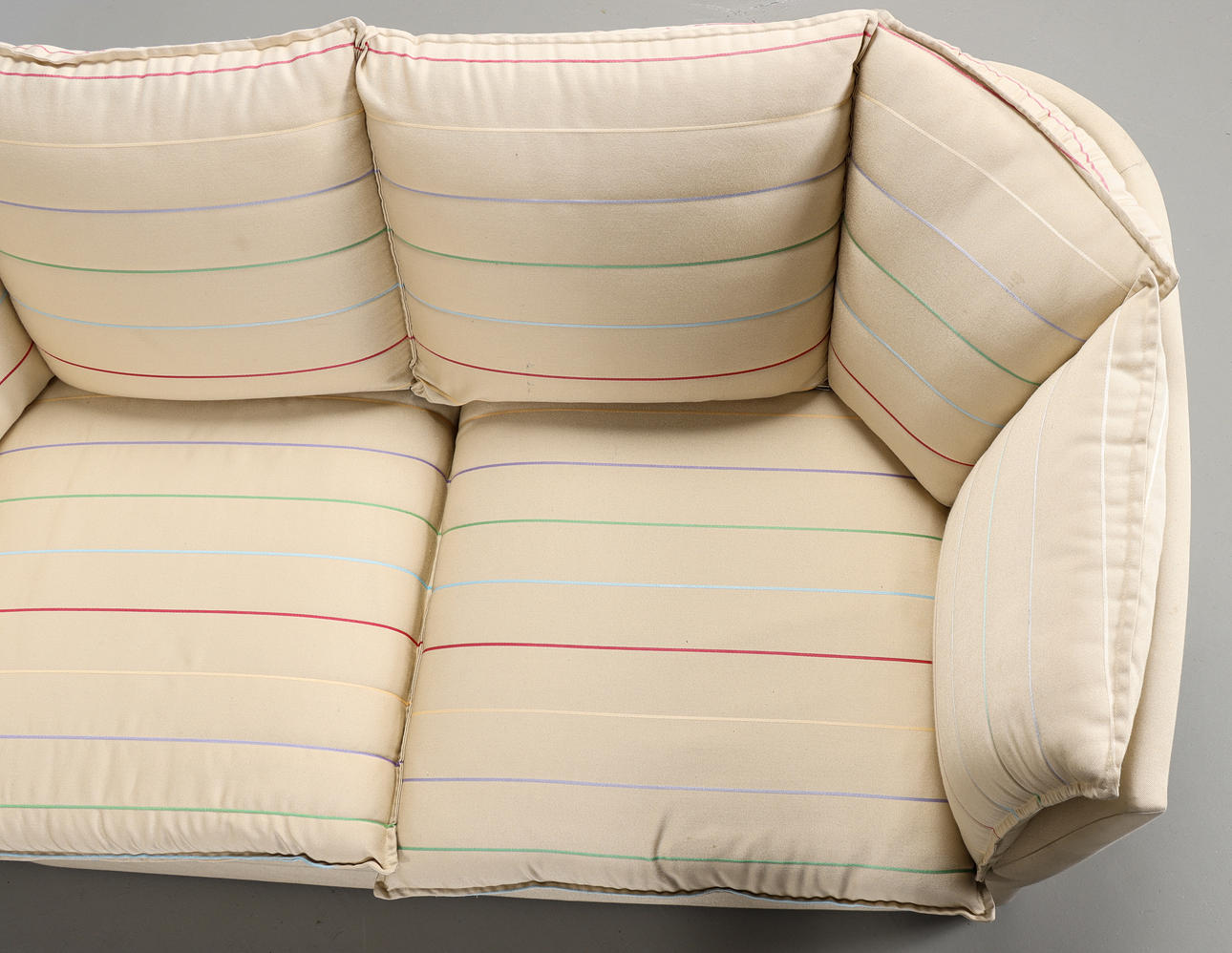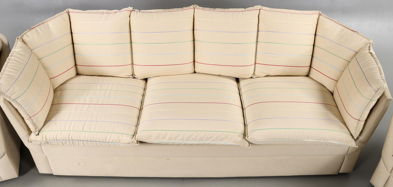 Bestående av fåtölj, 2-stitssoffa och 3-sitssoffa. Textilklädsel med flerfärgade ränder.