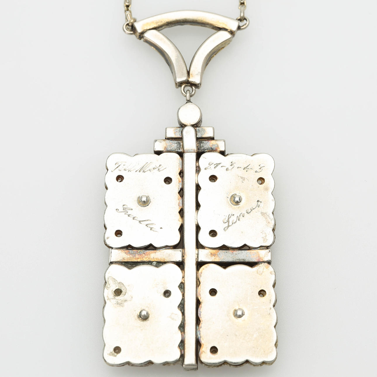 Bruksslitage, slitage på snidade stenar, gravyr på hängets baksida.