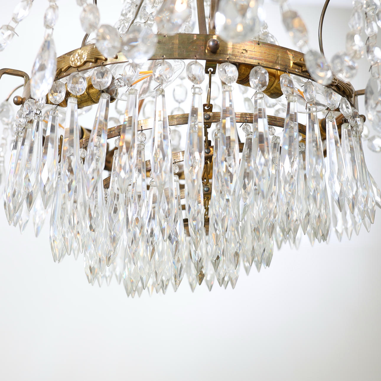 Ljuskrona med stomme i mässing, behängd med prismor.