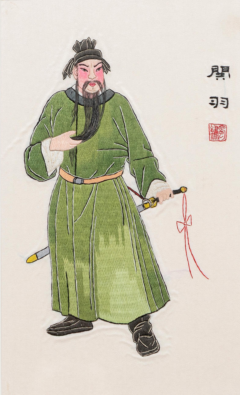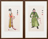 Kvinna med solfjäder, ca 30x17,5 cm. Man med svärd, ca 29,5x17,5 cm. Rammått ca 46x28 cm.