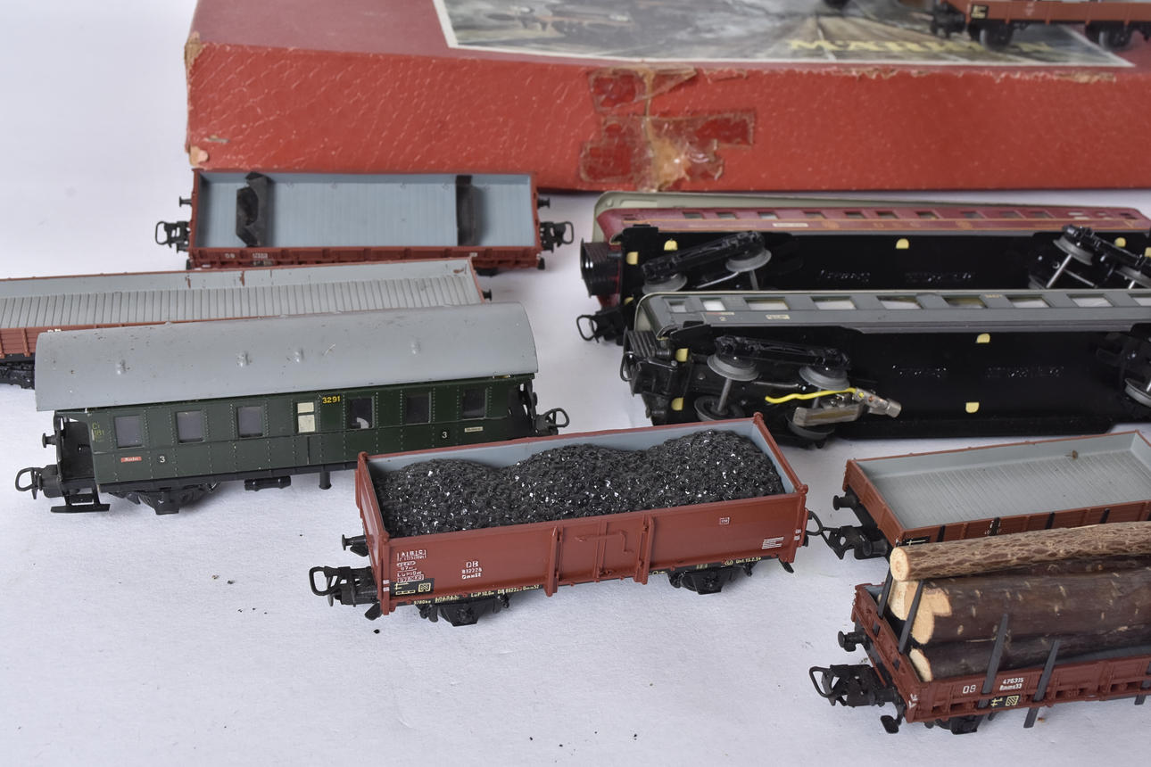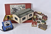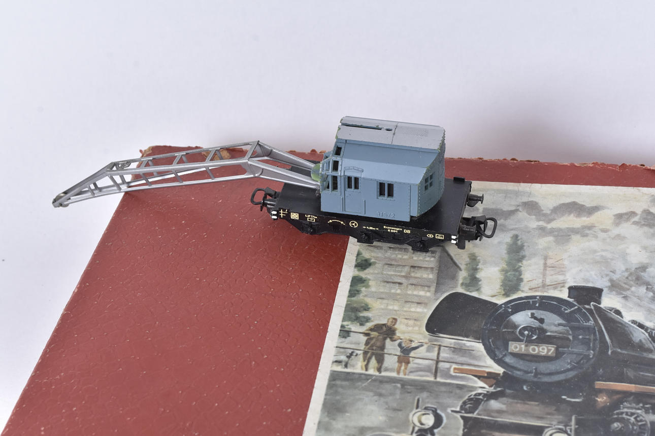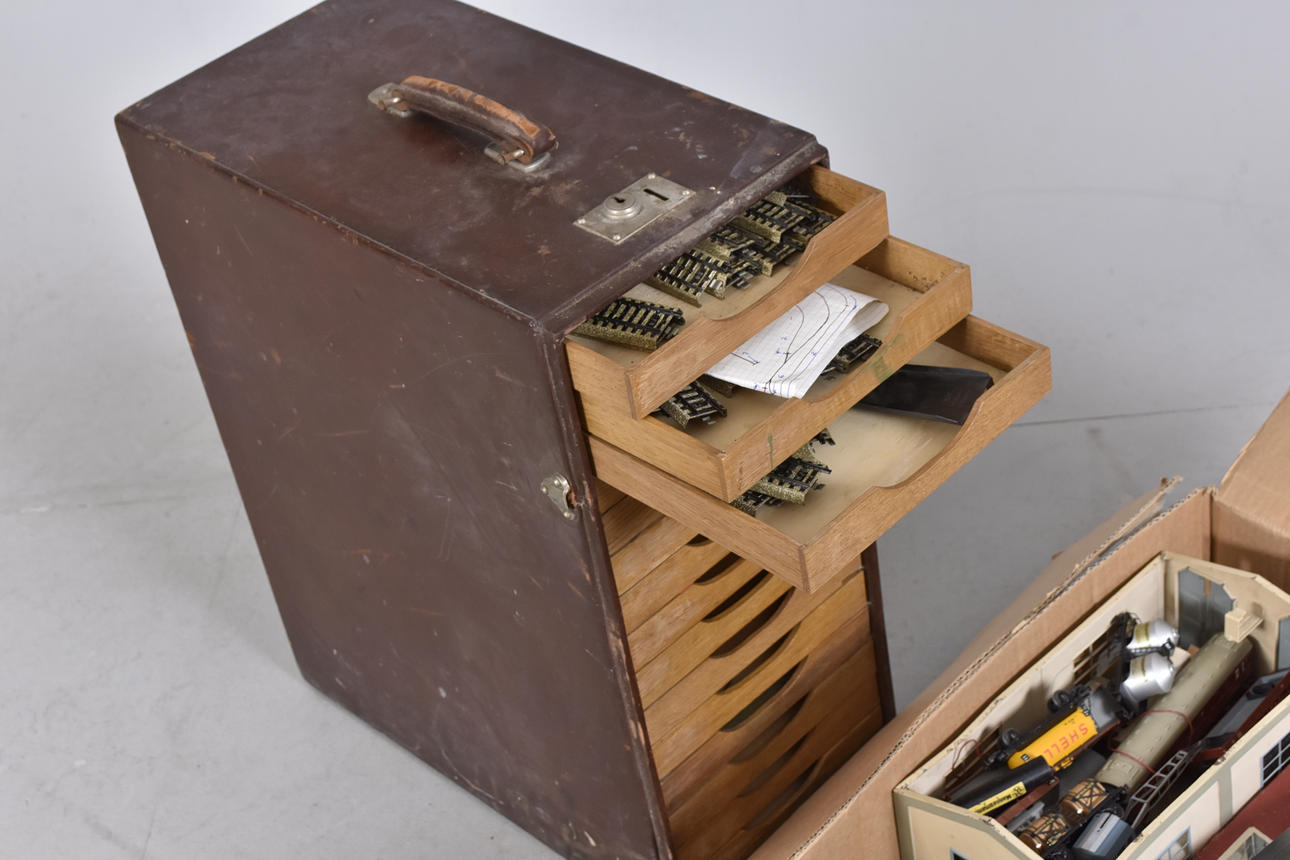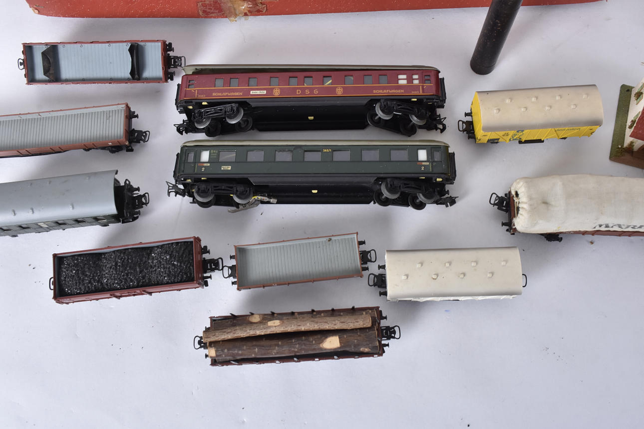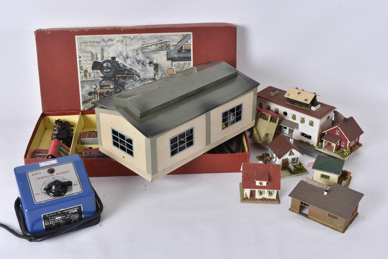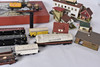 lok, vagnar, räls, byggnader ,mm