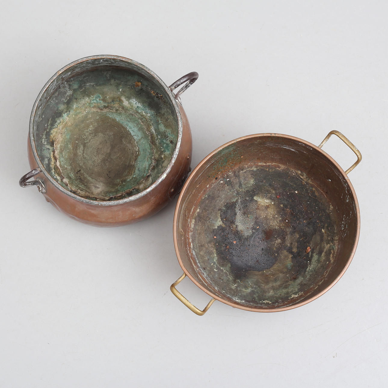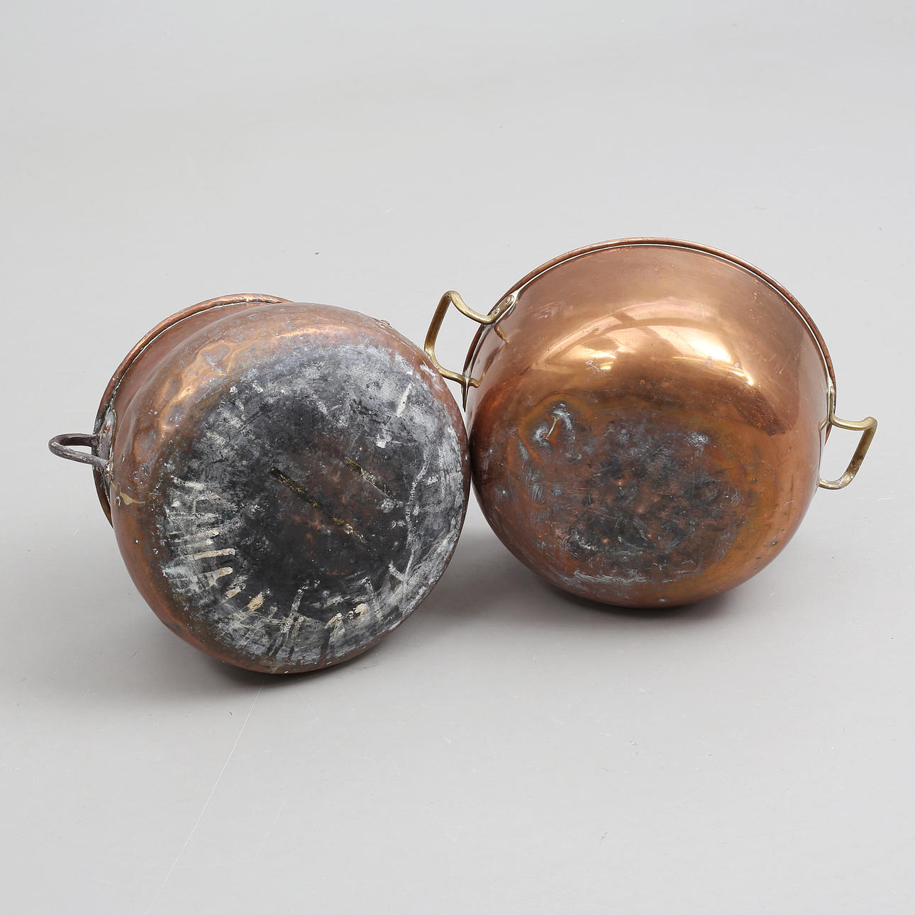 Åldersslitage, märken, fläckar, småbucklor. Den äldre med lagning.