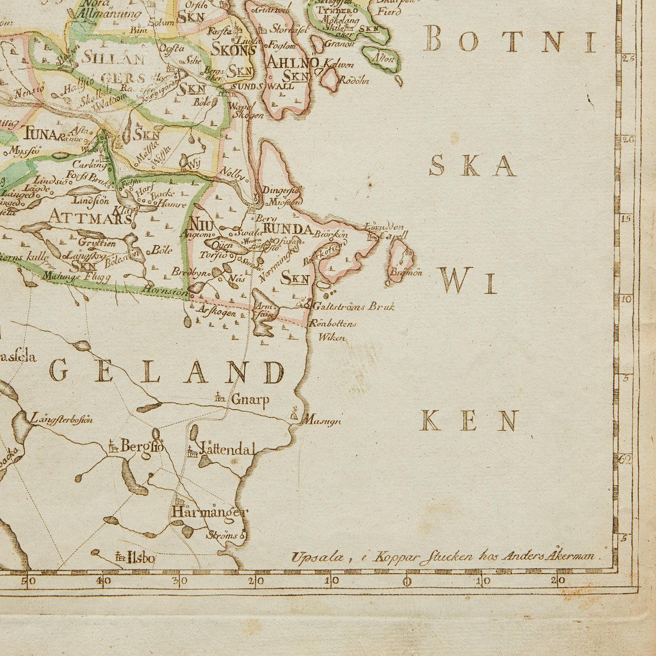 Ca 470x590 mm. Graverad karta i samtida handkolorering, med stor dekorativ kartusch i svartvitt, graverad av Anders Åkerman. Mittveck.