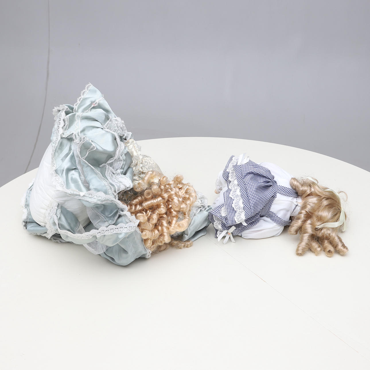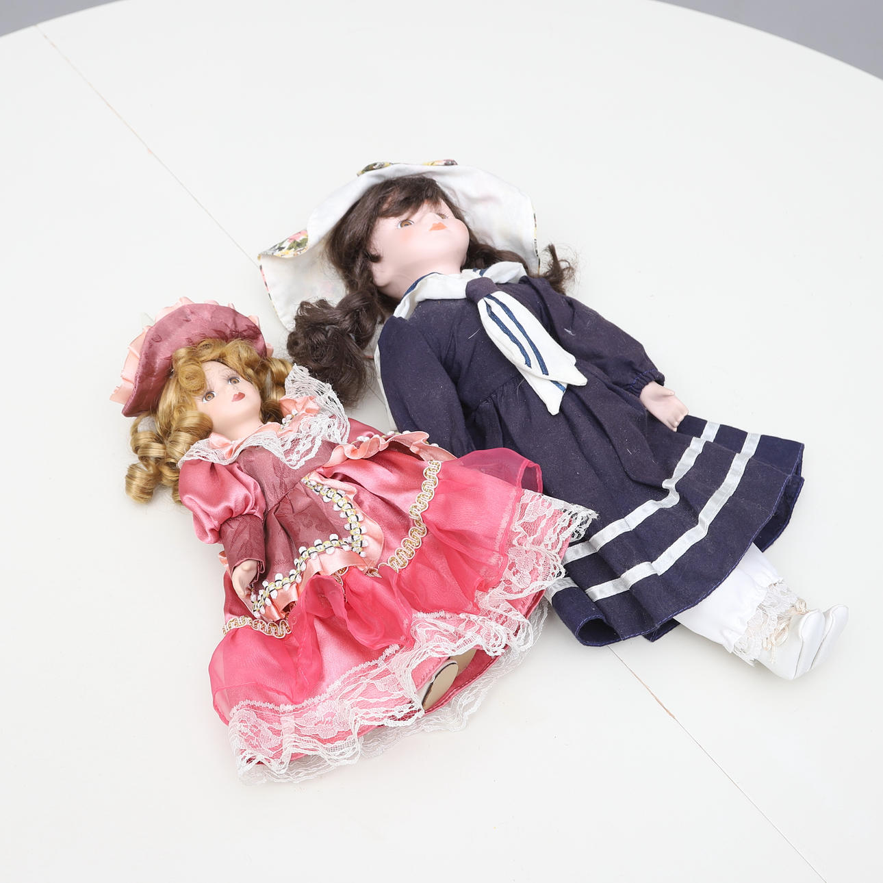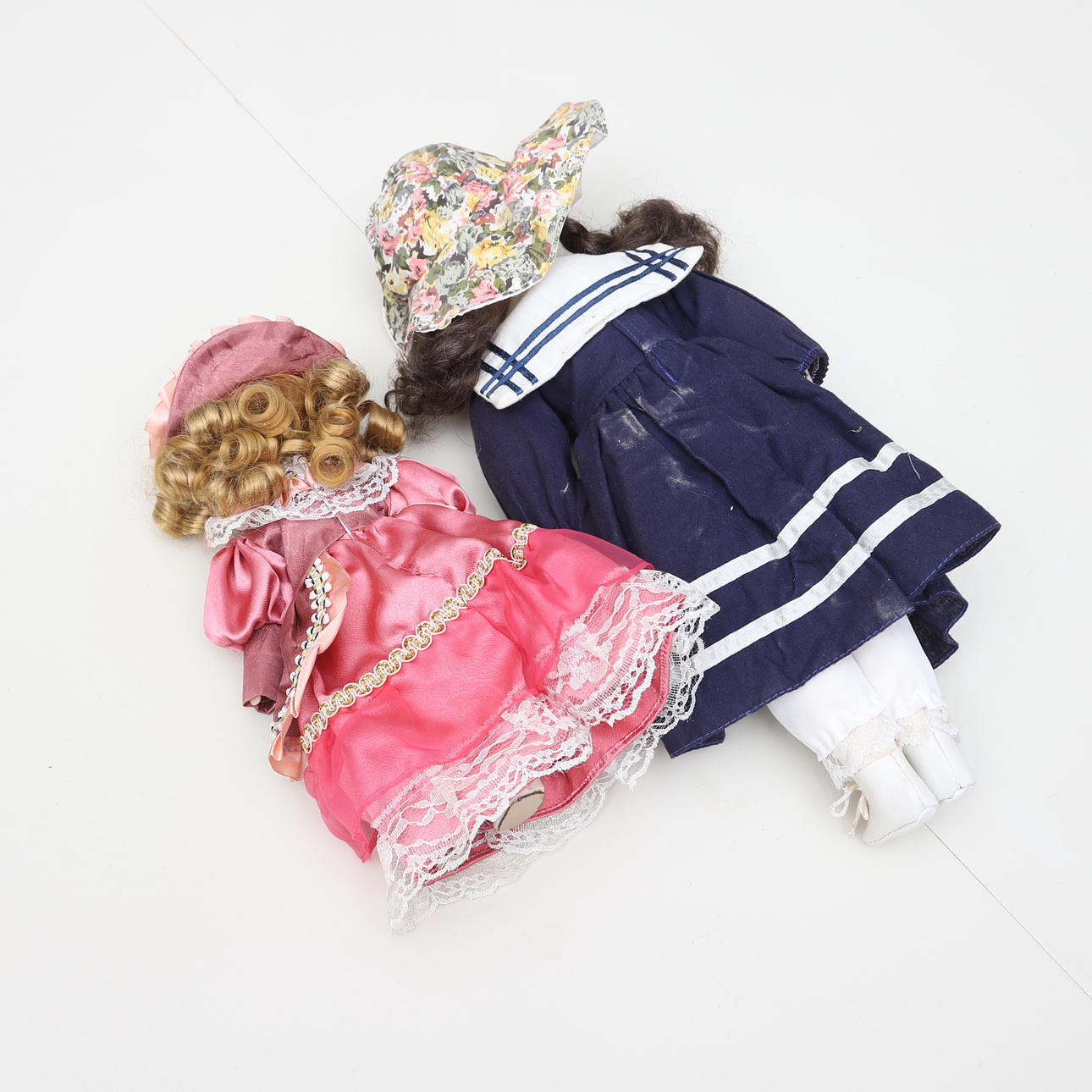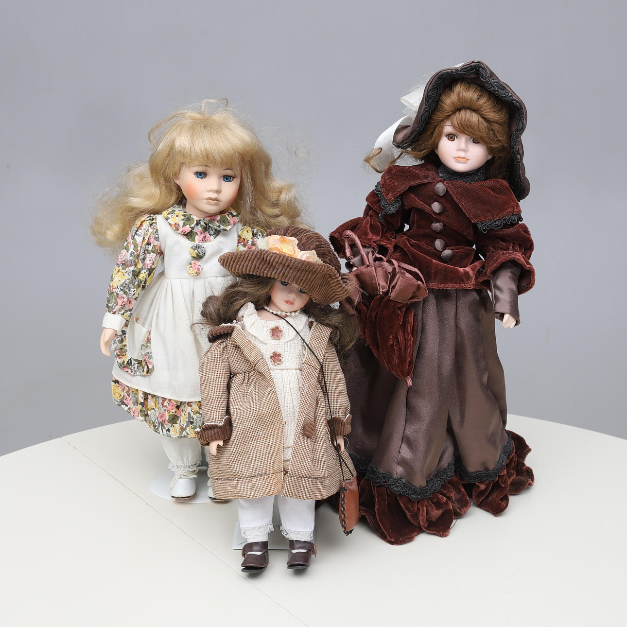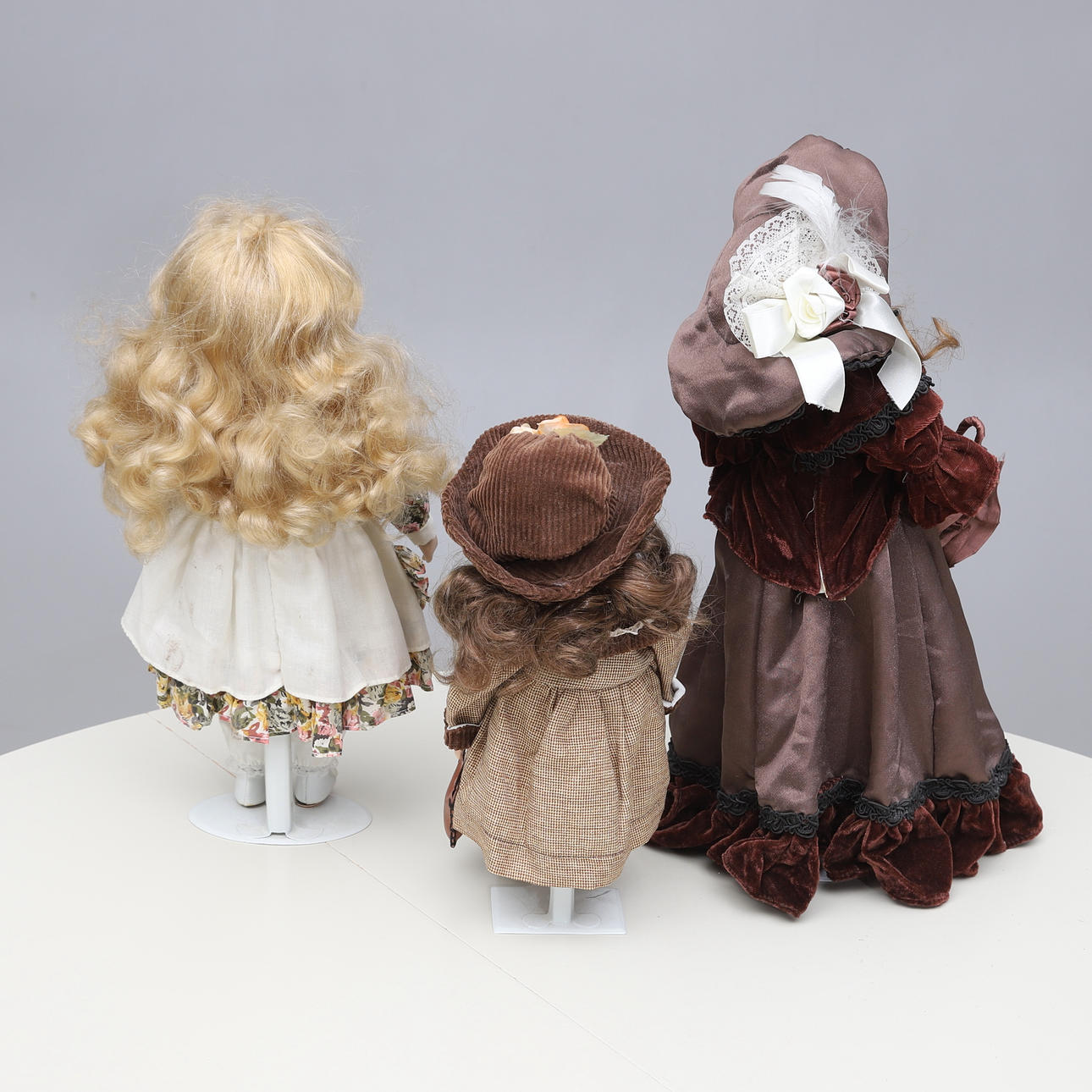 7 stycken dockor. Höjd ca 23 cm- 43 cm. 3 st på ställning.