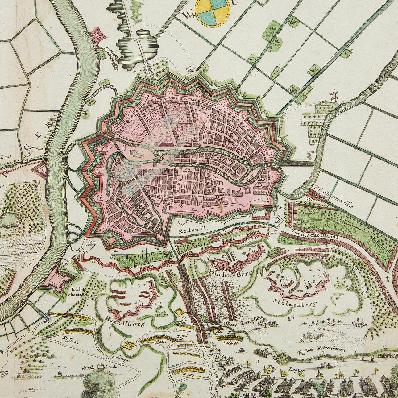 Ca 500 x 590 mm. Graverad karta över Danzig (Gdansk) i samtida handkolorering, Mittveck. Visar belägring av ryska trupper med ryska flottan vid kusten.