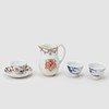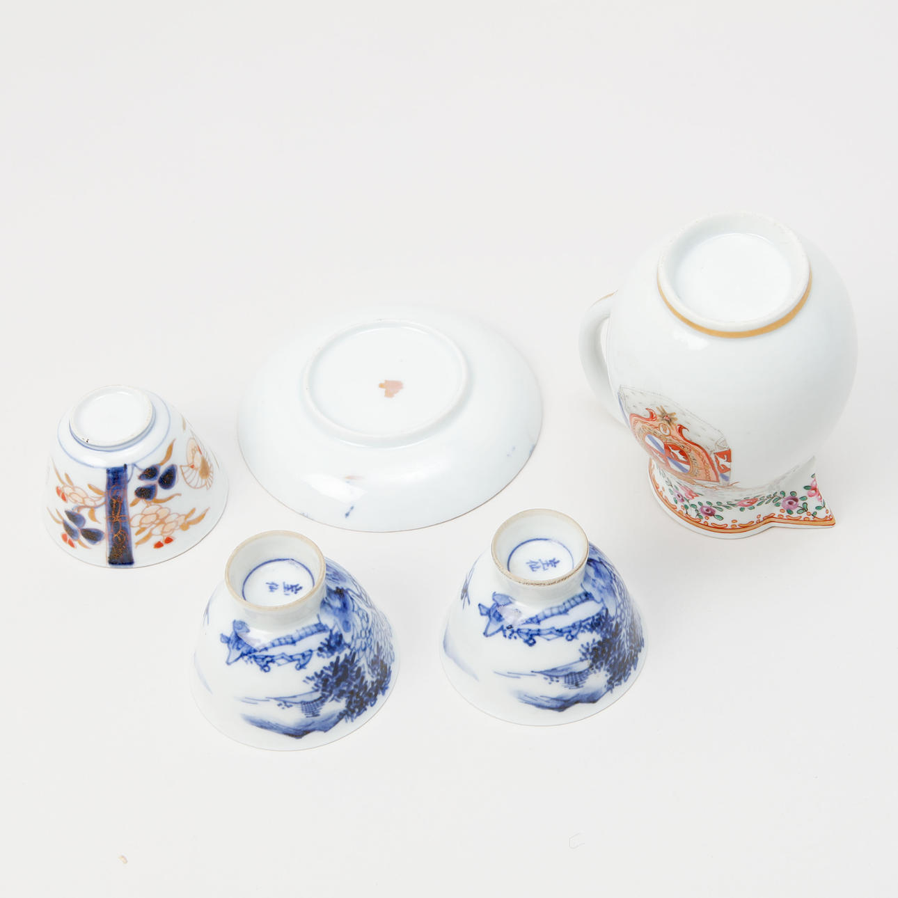1 kanna, 1 kopp med fat och 2 vinkoppar. Dekor i famille rosefärger och vapen, imari samt underglasyrblått. Höjd 4-10 cm.