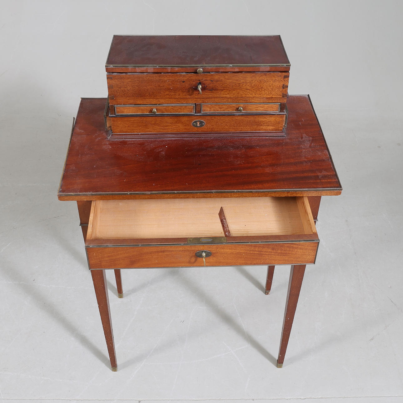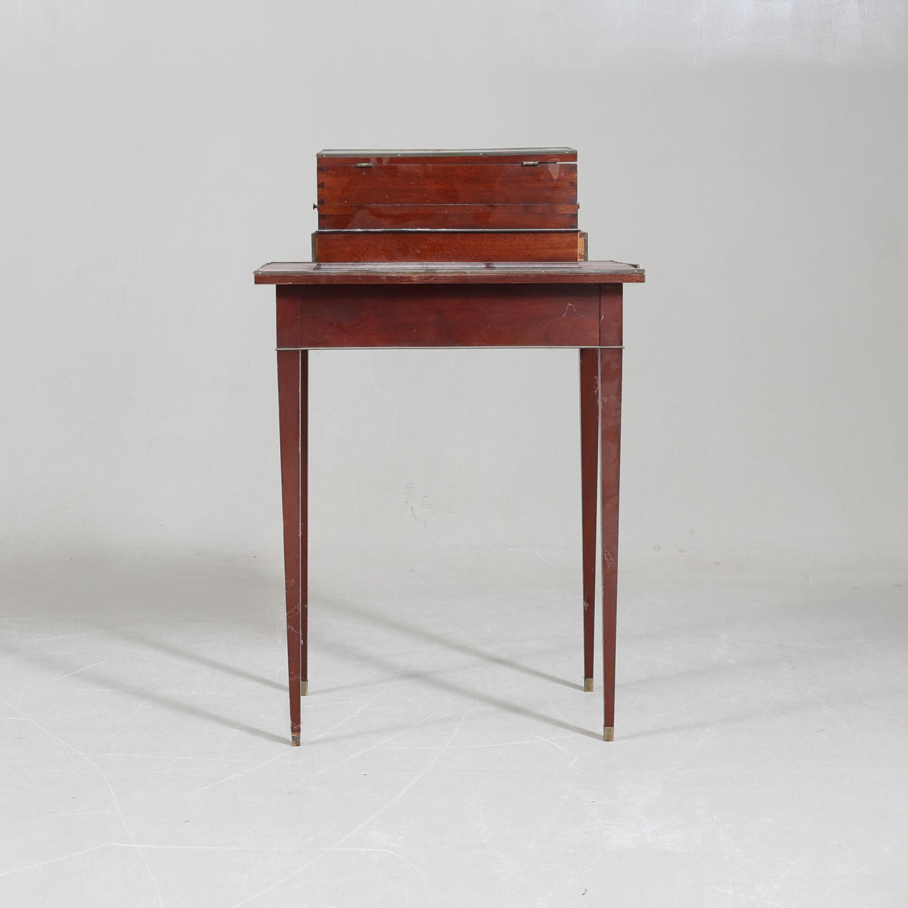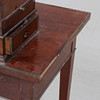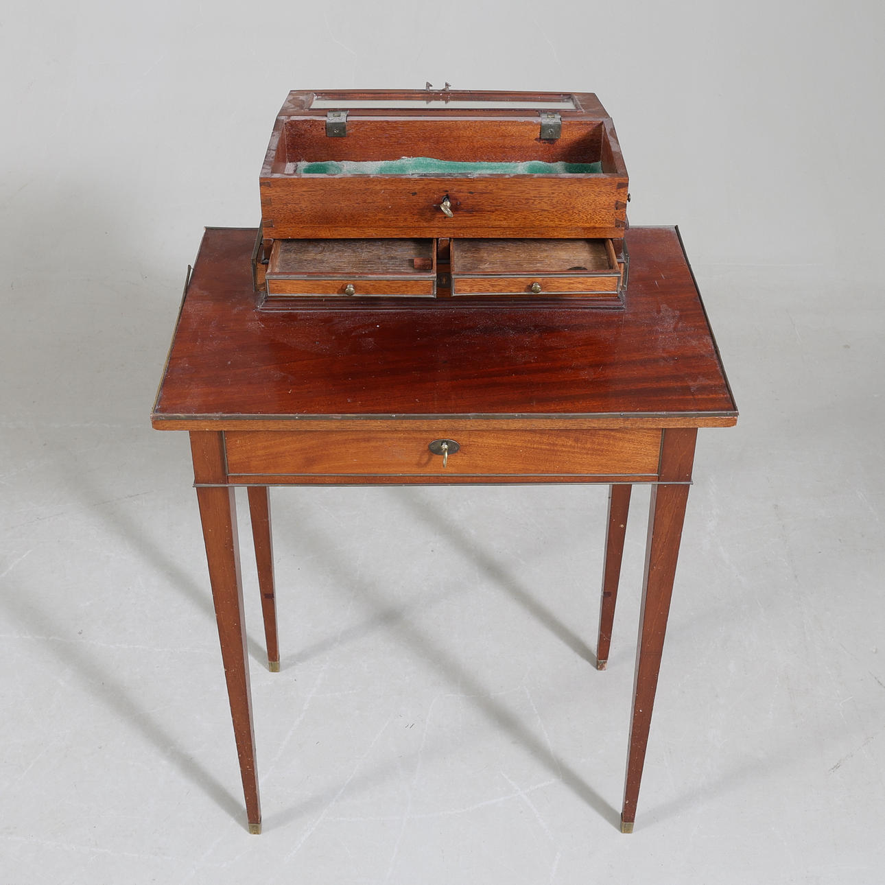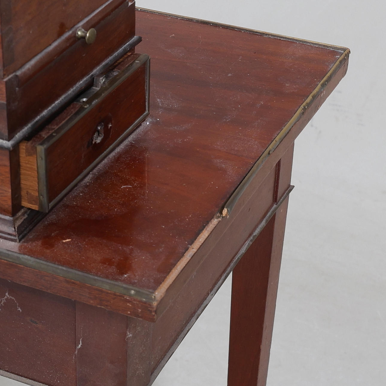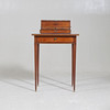 Fanerad. Mässingsbeslag. Uppsats med uppfällbar spegel. Fyra lådor och två utfällbara skivor. En låda i sarg.