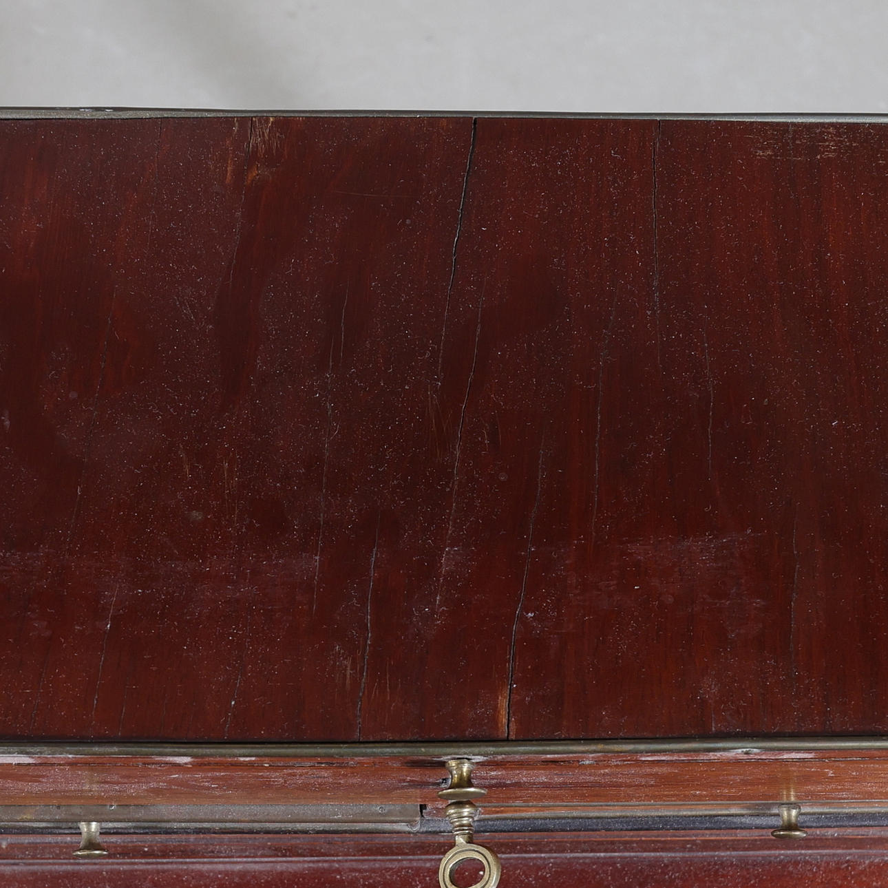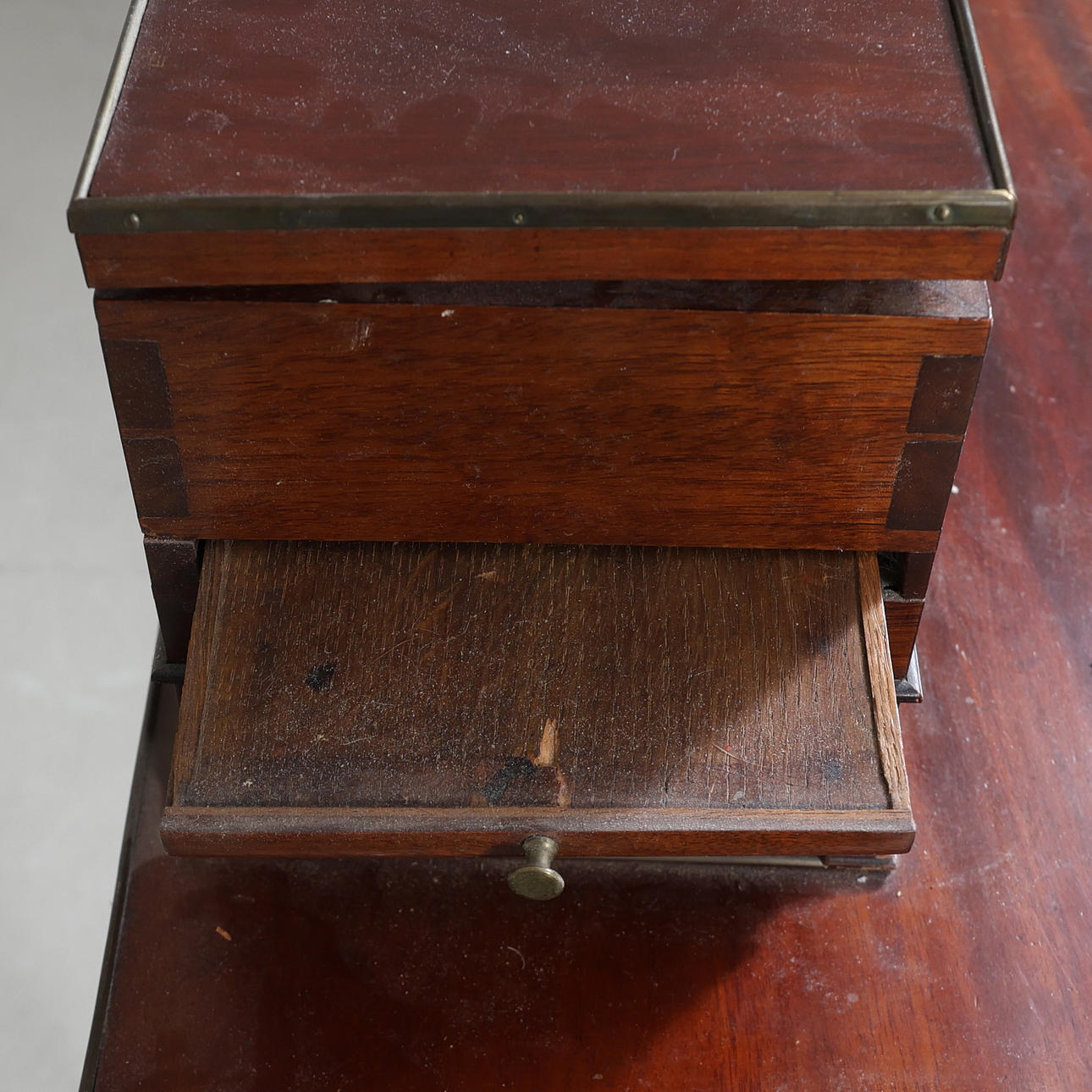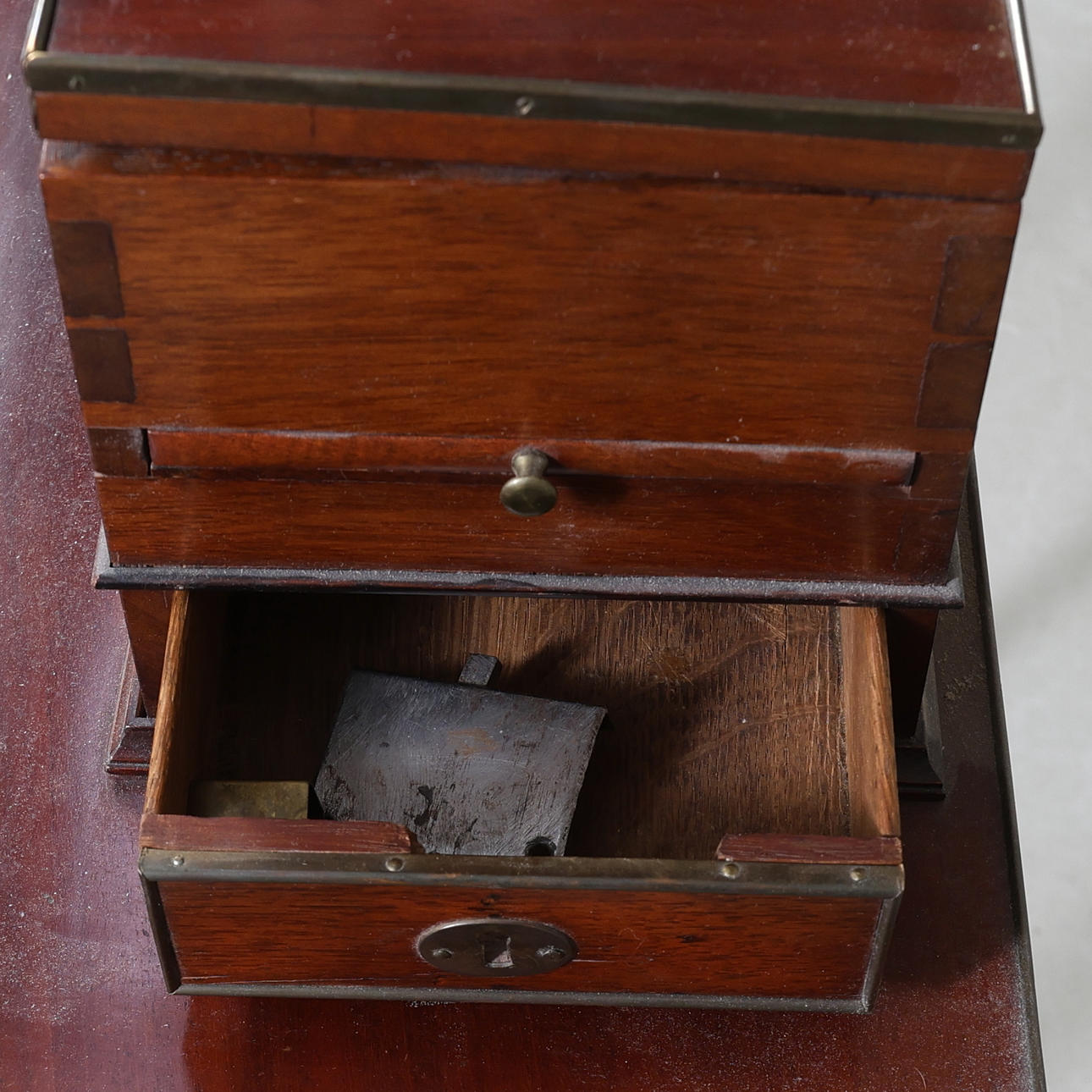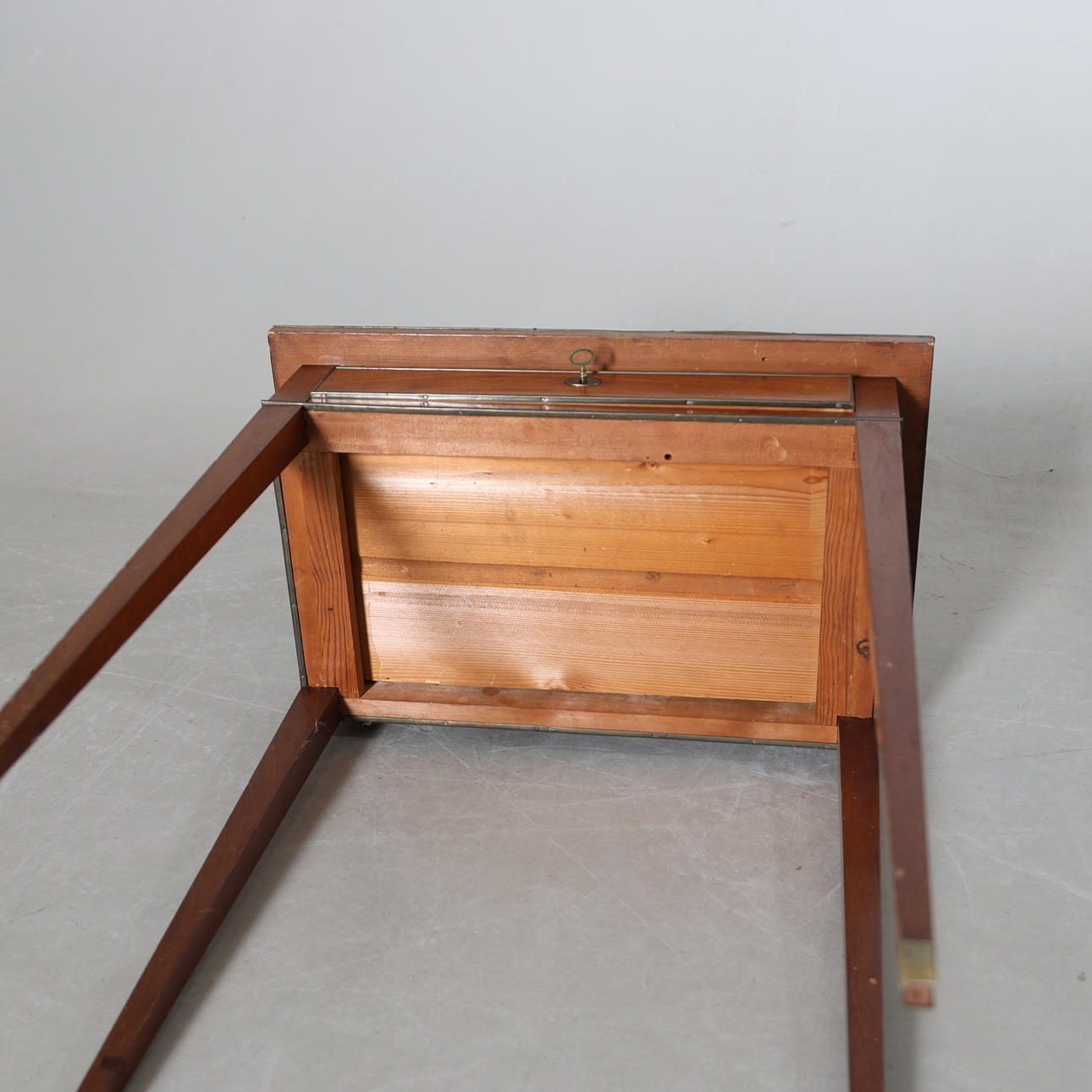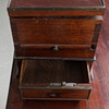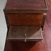 Fanerad. Mässingsbeslag. Uppsats med uppfällbar spegel. Fyra lådor och två utfällbara skivor. En låda i sarg.