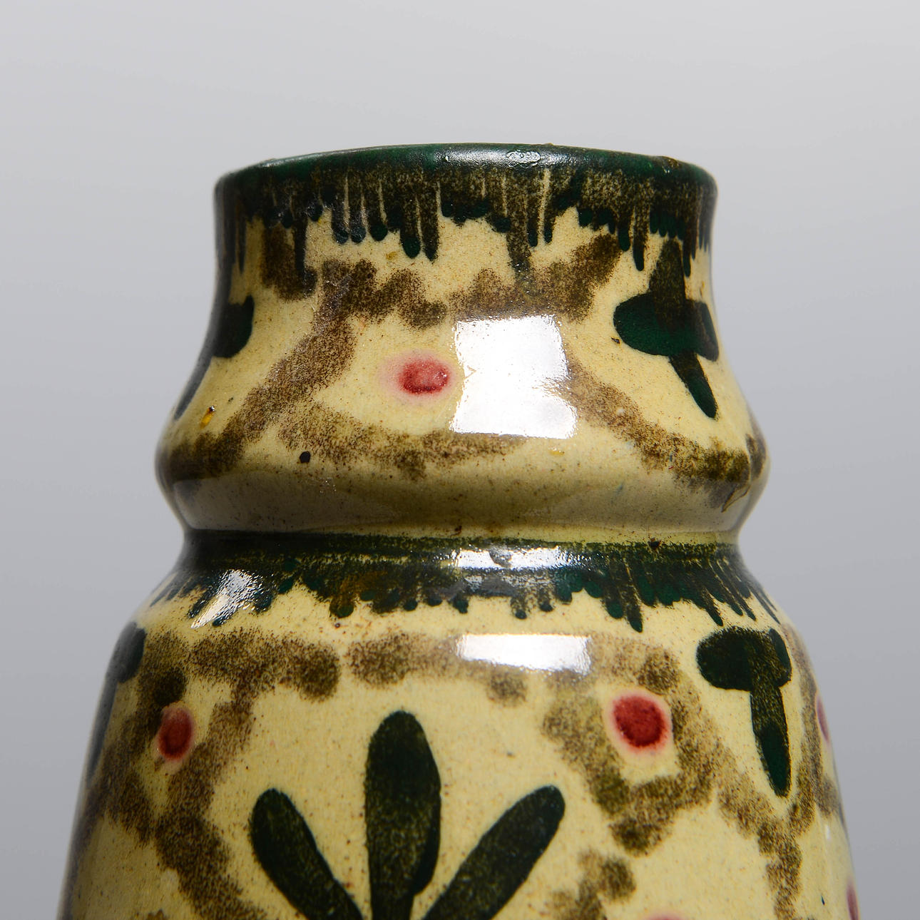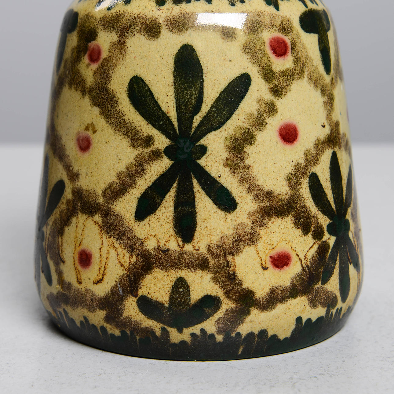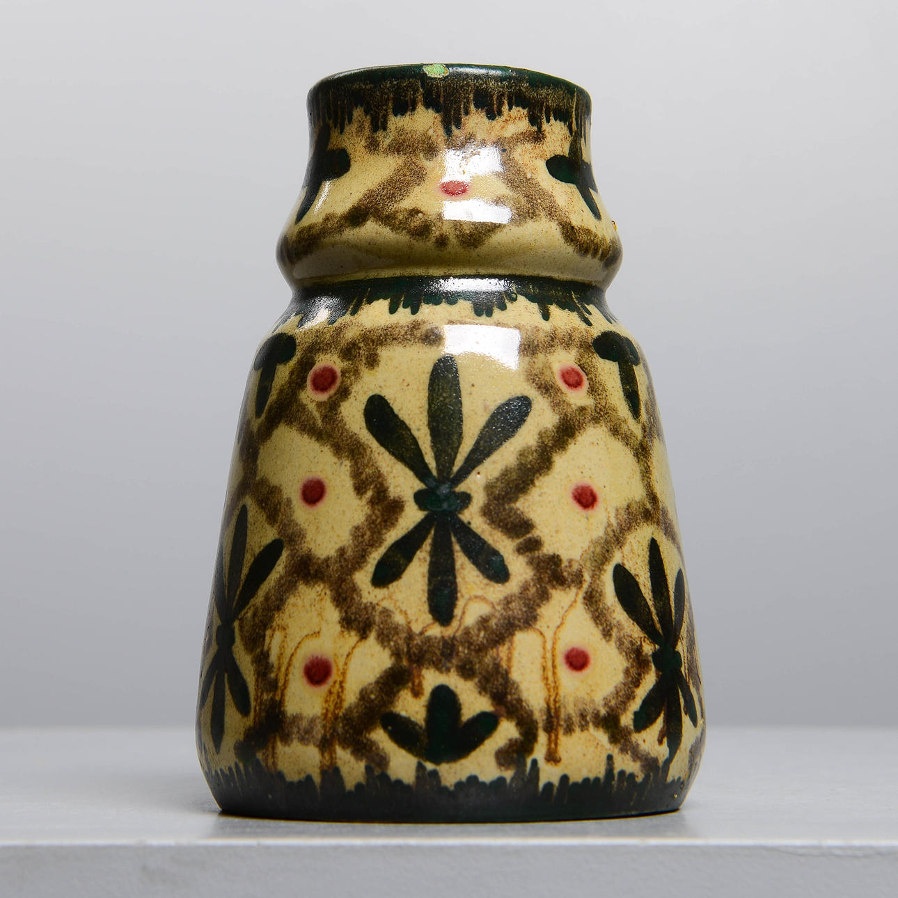 Lergods med målad dekor. Höjd 18,5 cm.