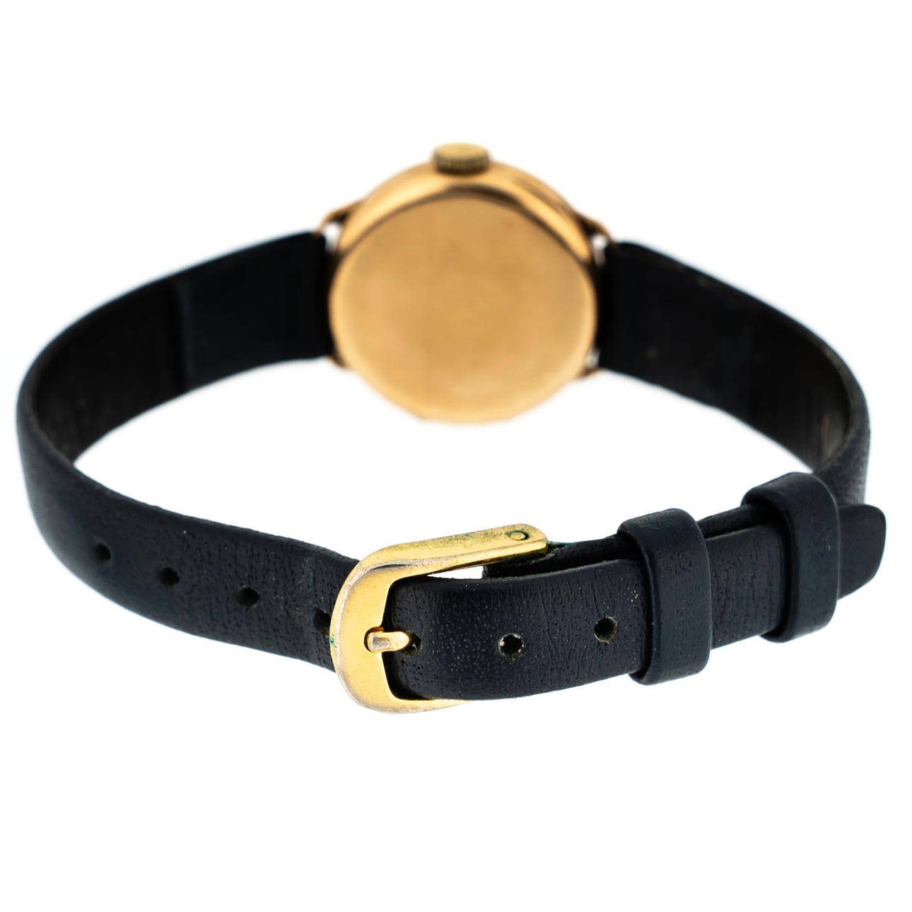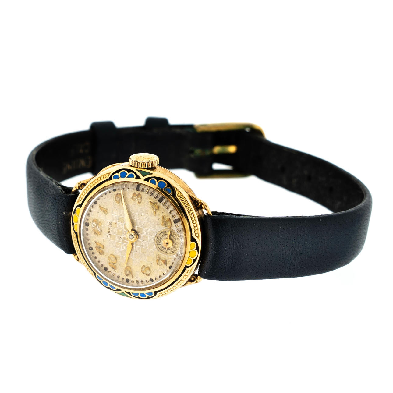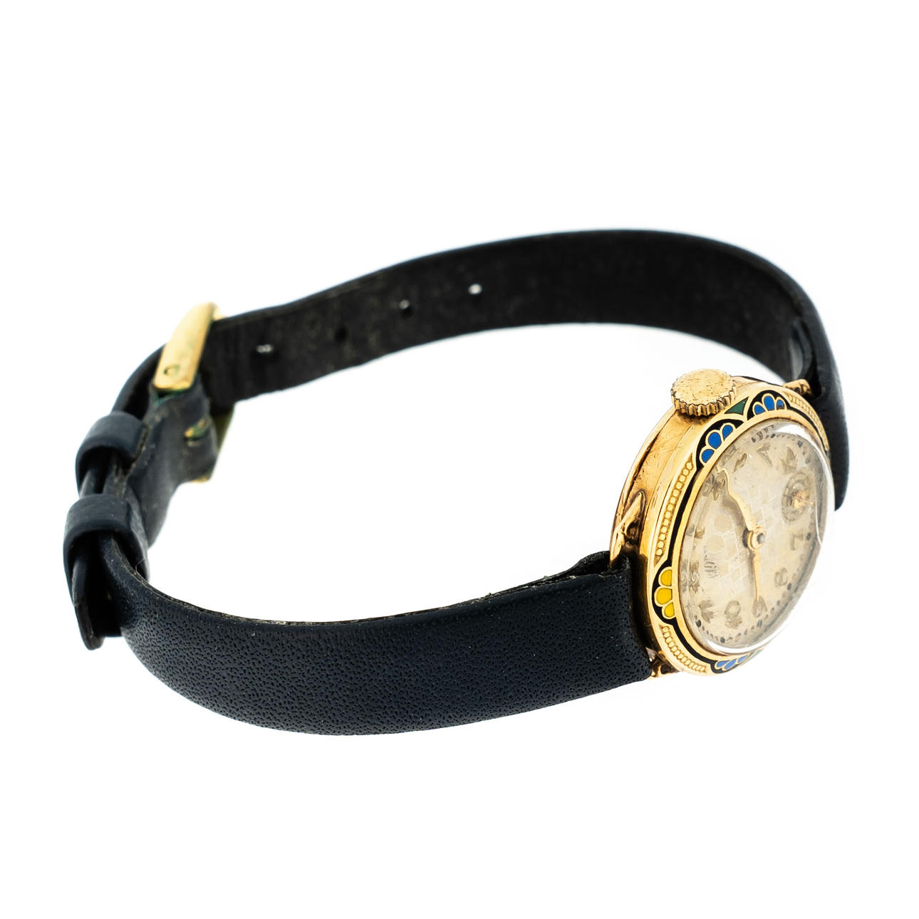 Mekaniskt urverk, band av svart läder.