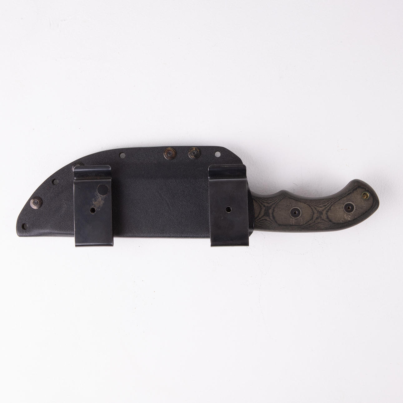 Parkerized finish, grepp i fiberlamintat. Kydexbalja. Längd kniv 30 cm.