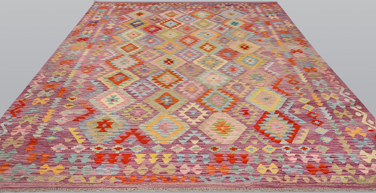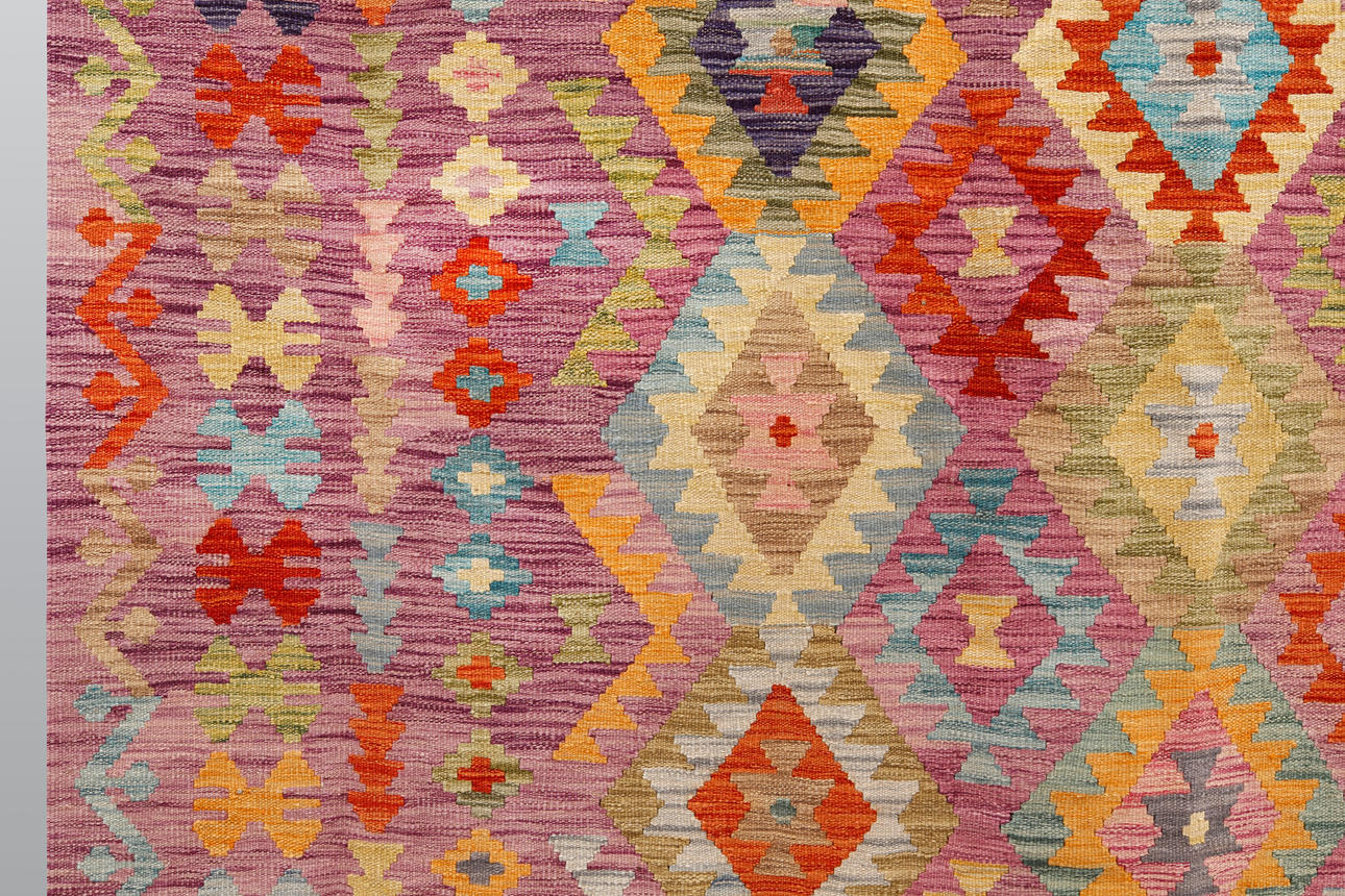 Handvävd Kelim i klassisk design med geometriskt mönster i polykrom färgskala.