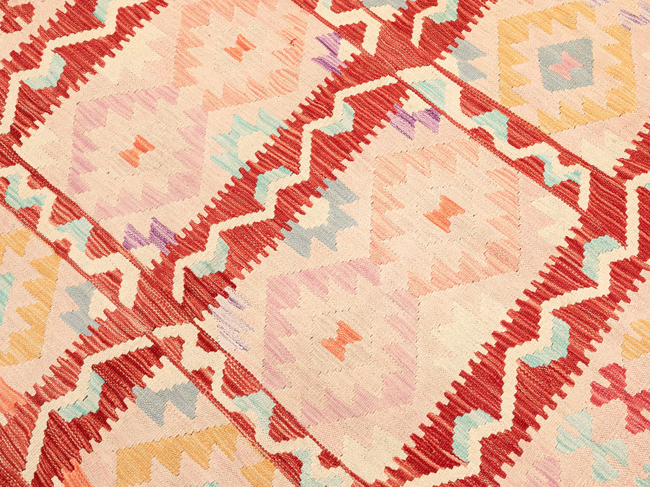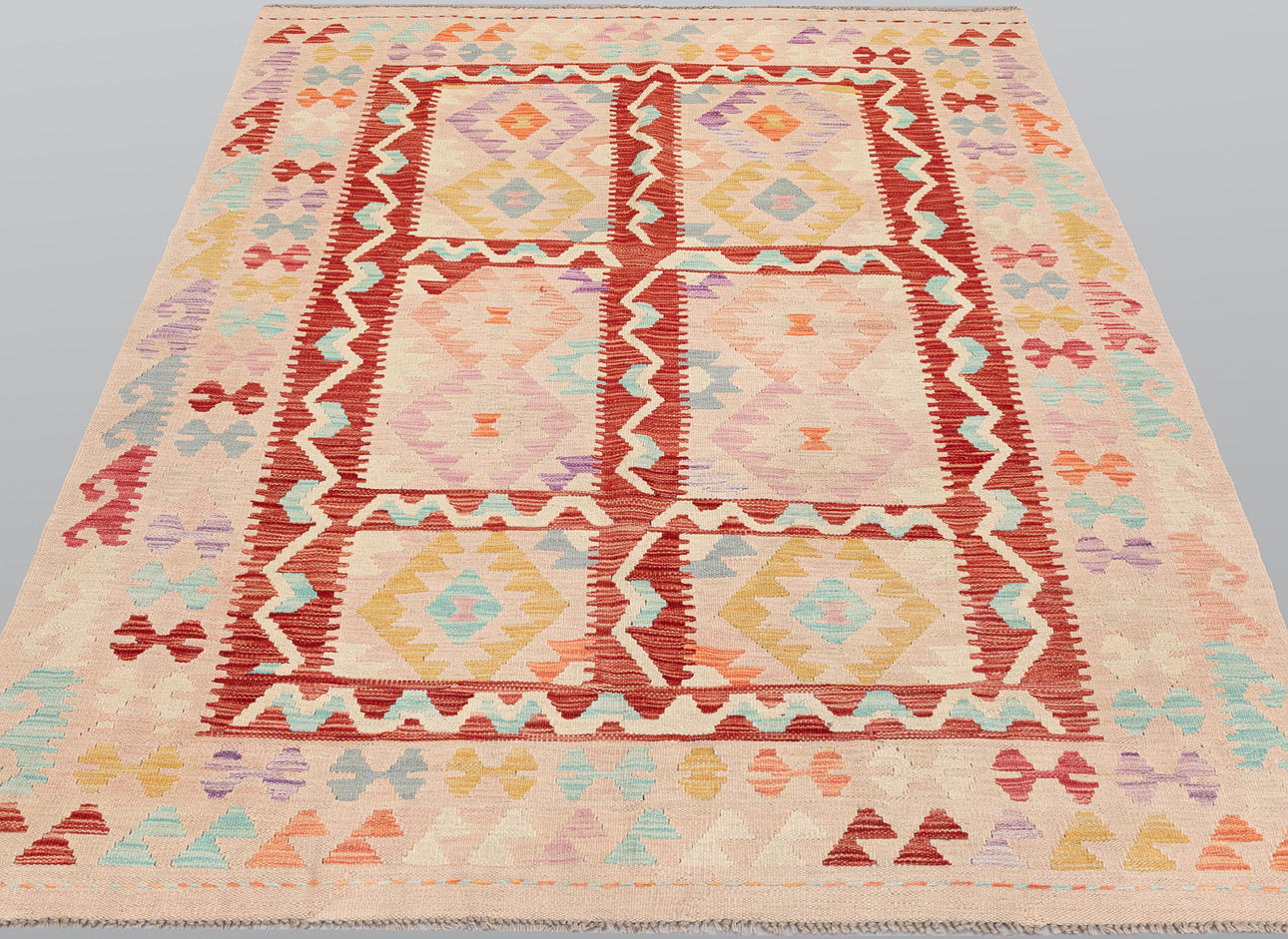 Handvävd Kelim i klassisk design med geometriskt mönster i polykrom färgskala.