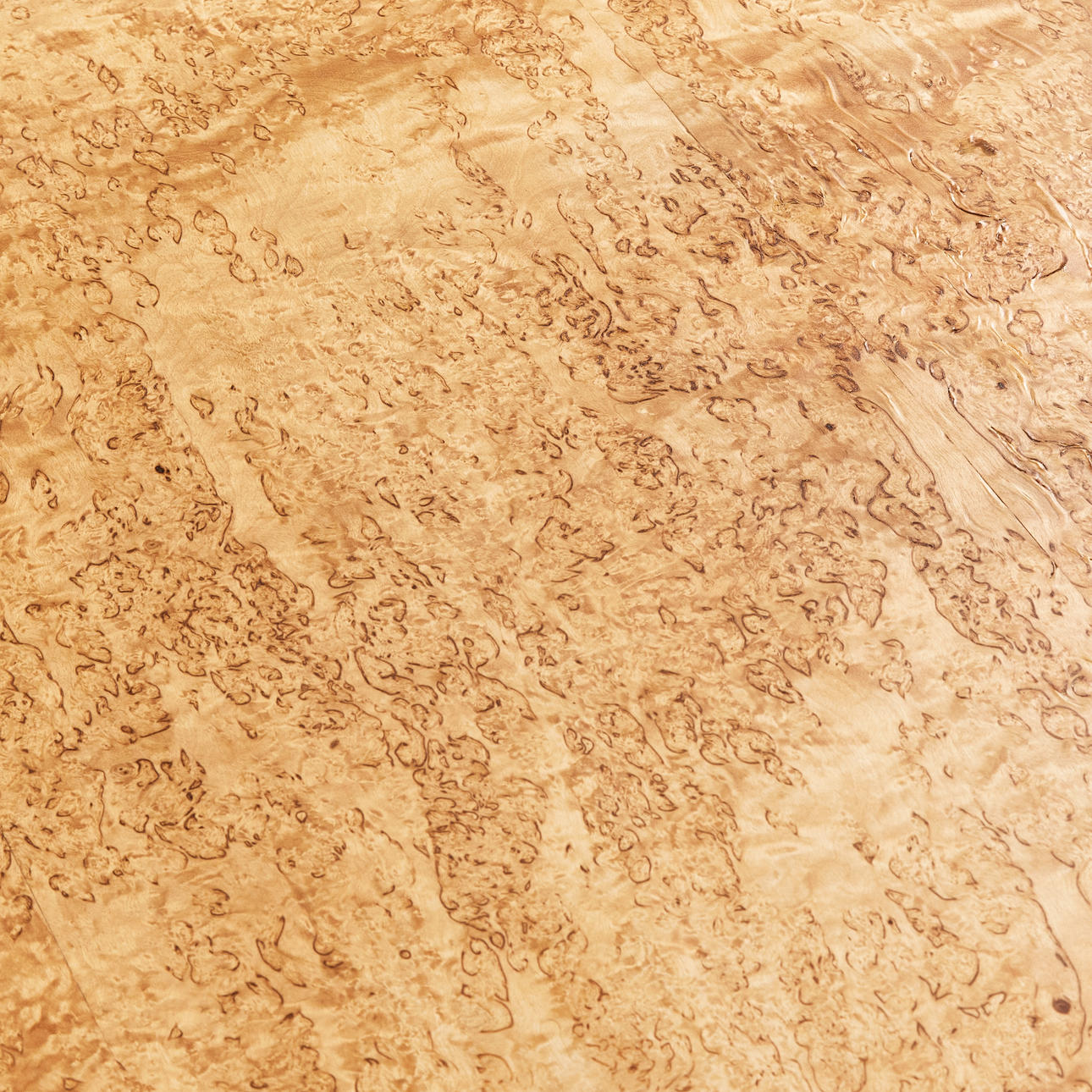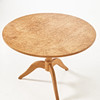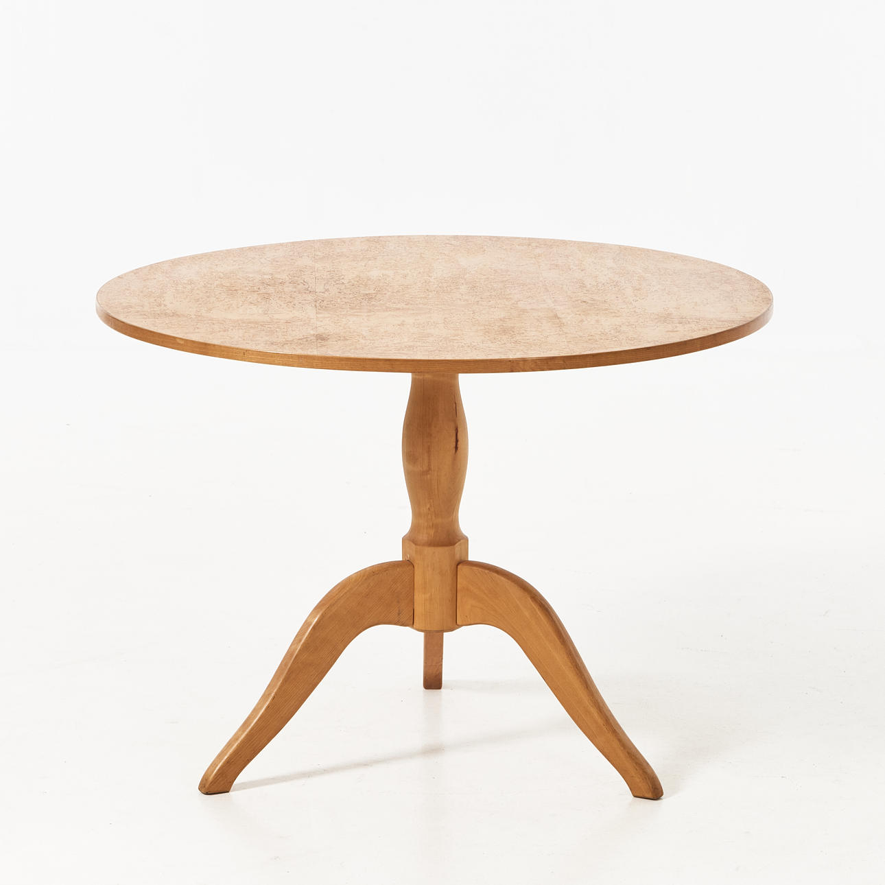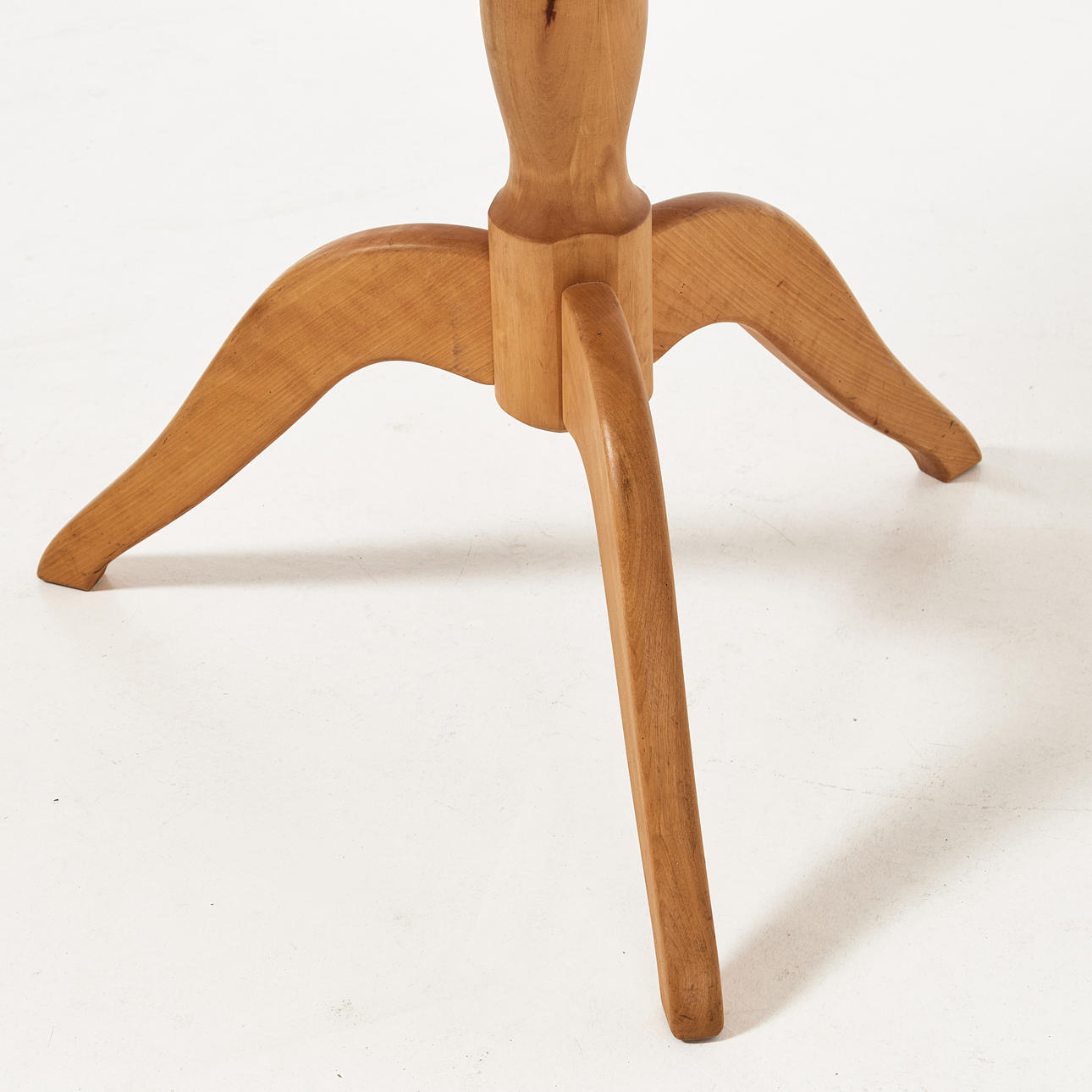 Benställning av björk. Rund skiva fanerad med masurbjörk. Diameter 90, höjd 63 cm.