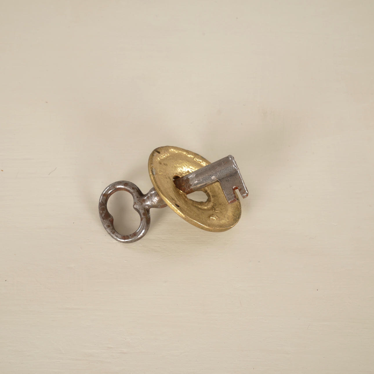 Draghandtag i mässing med fyrkantsmuttrar. Utanpåliggande lås.