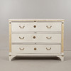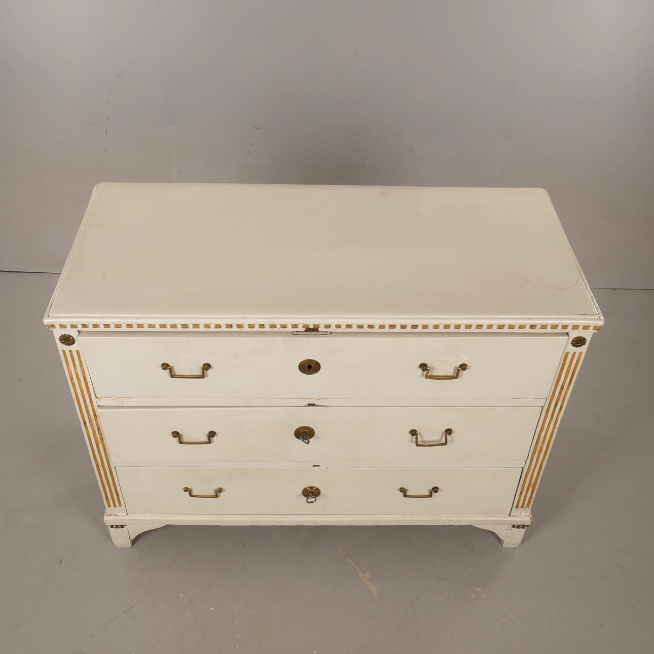 Trelådig vitmålad byrå med bronserade kannelyrer och tandsnitt.