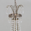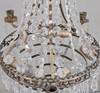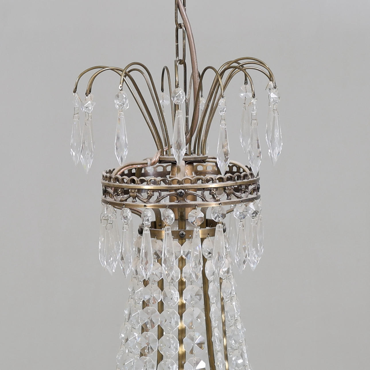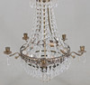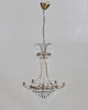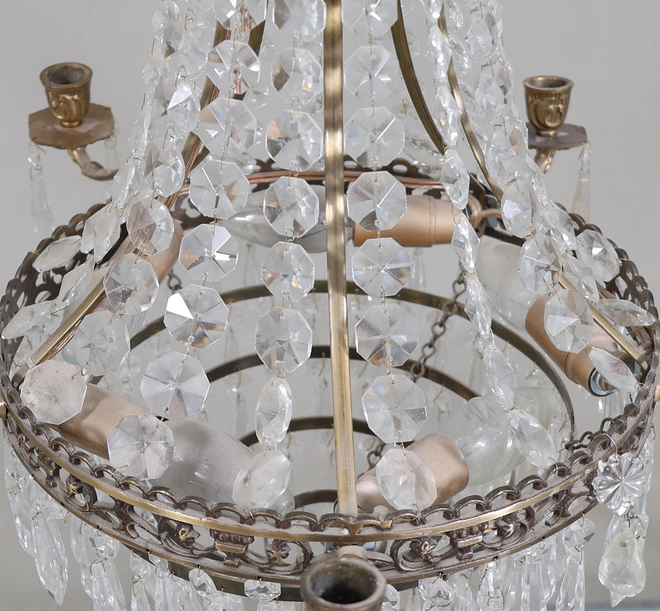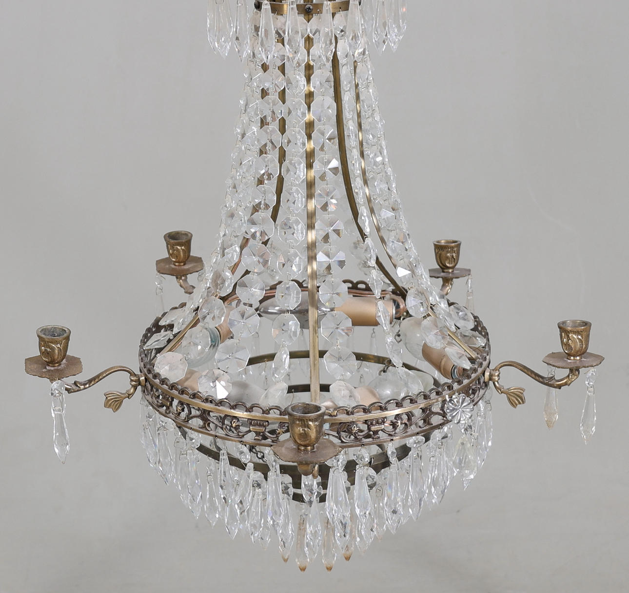 Stomme i metall. Behängd med prismor. Fem ljushållare och fem ljuspunkter.