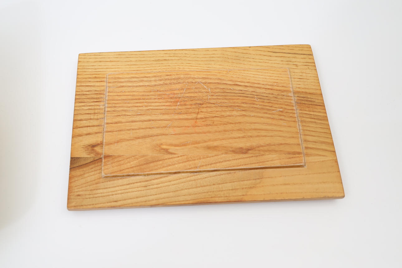Med handmålad dekor. Platta av lackat trä.