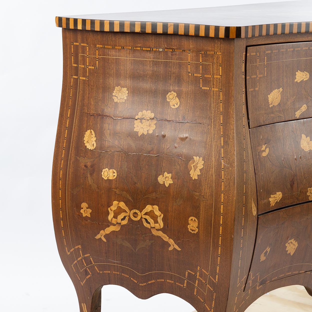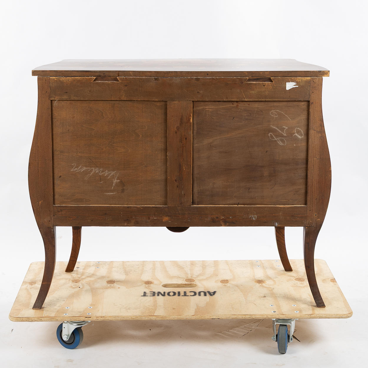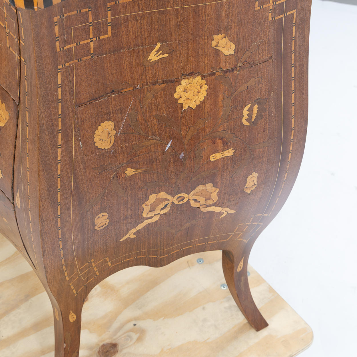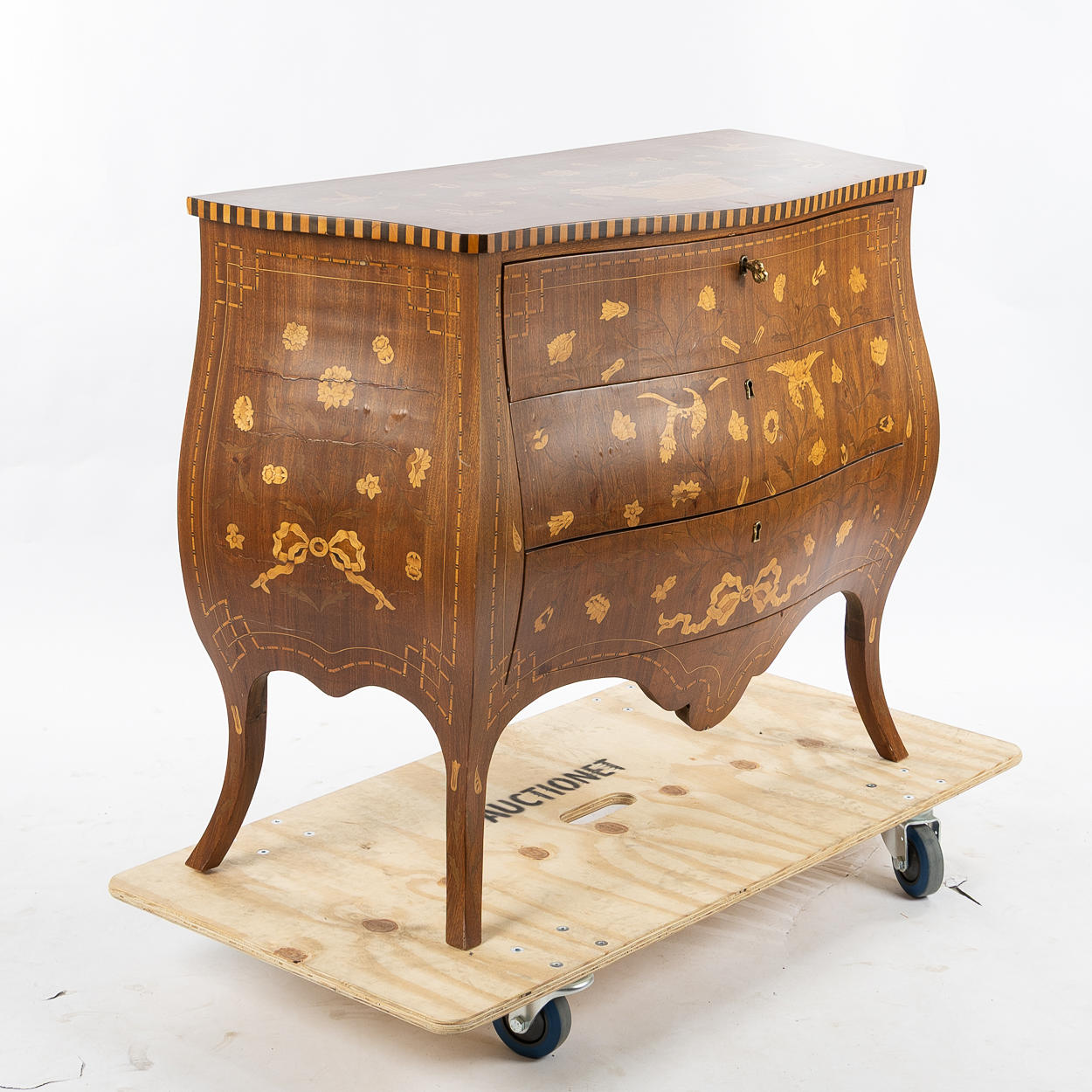 Mått 100x45 cm. Höjd 84 cm. Dekor med inläggningar, blommor och fåglar.