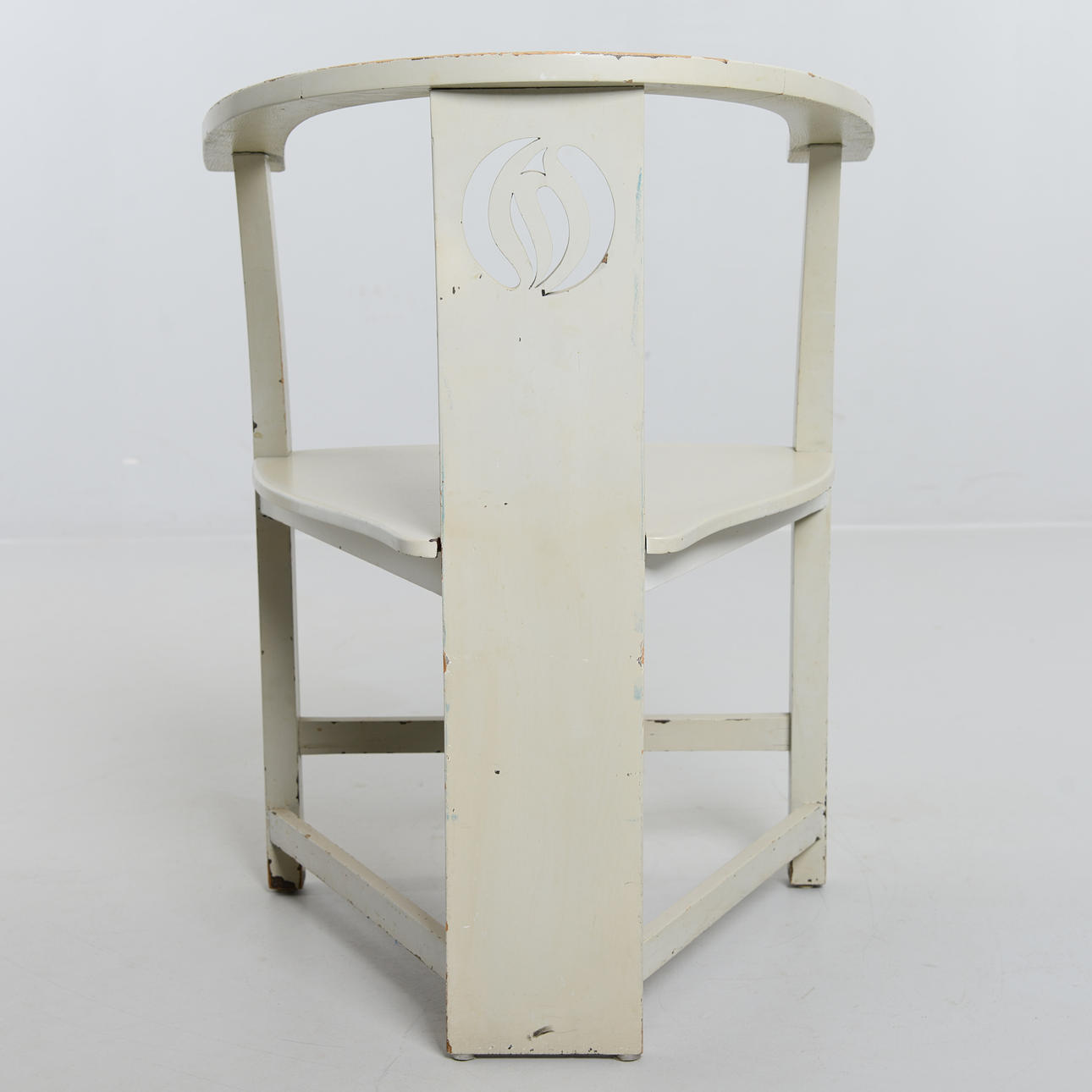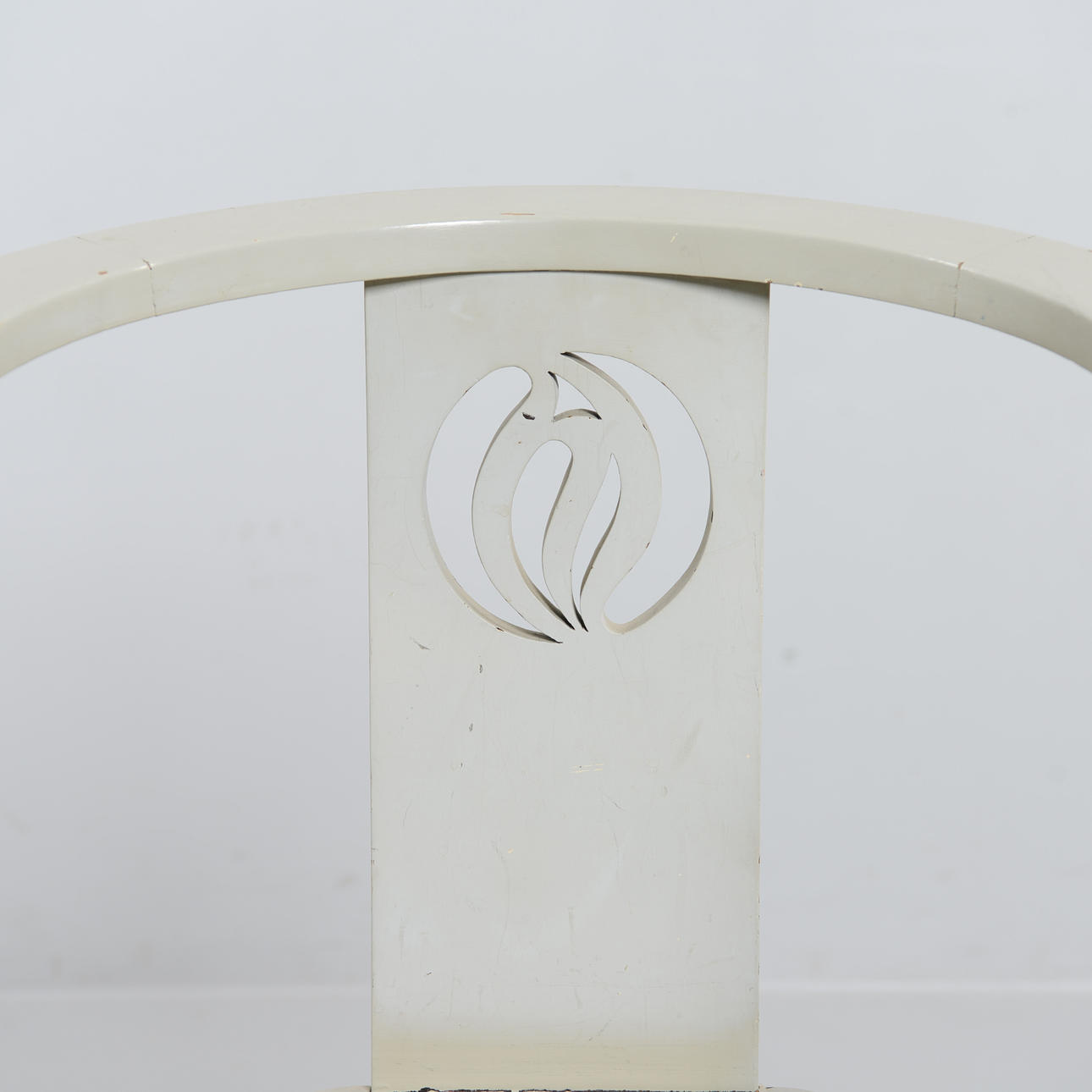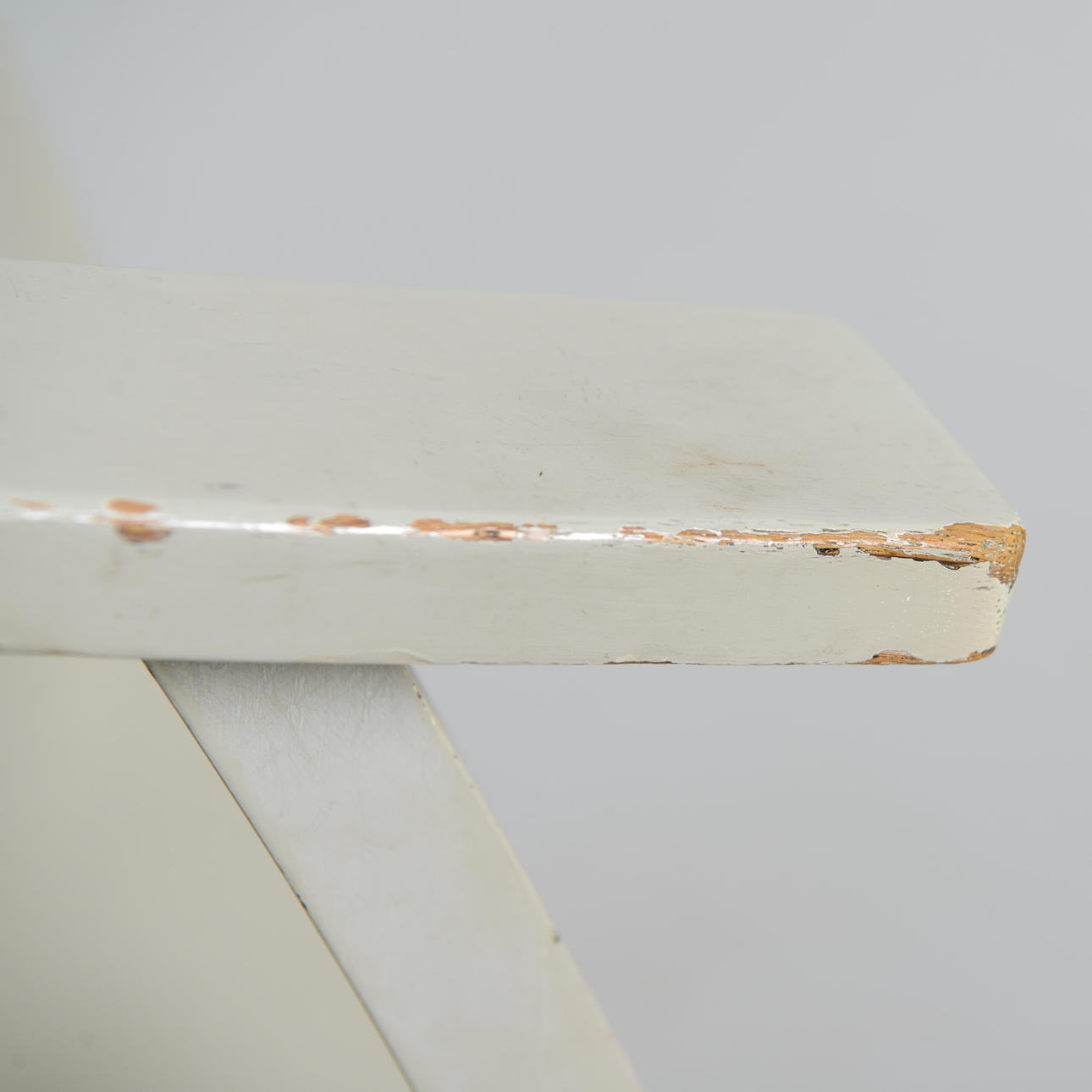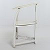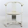 Bemålat trä och skuren dekor på rygg. Sitthöjd 46 cm. Rygghöjd 85 cm. Bredd 64 cm.