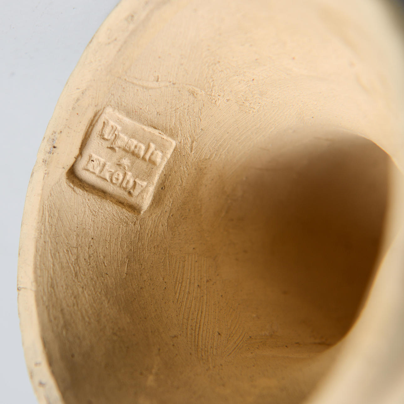 Lergods. Höjd 19 cm. Stämplad med Upsala-Ekebys första stämpel som användes ca 1890-1910.