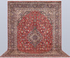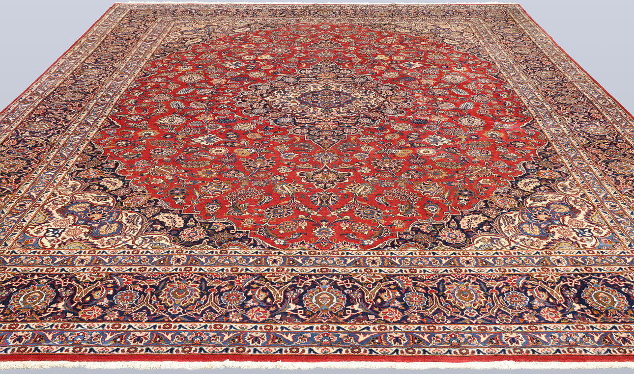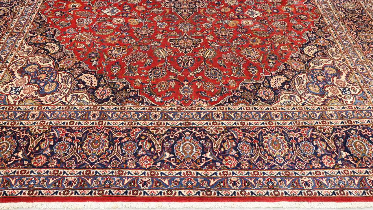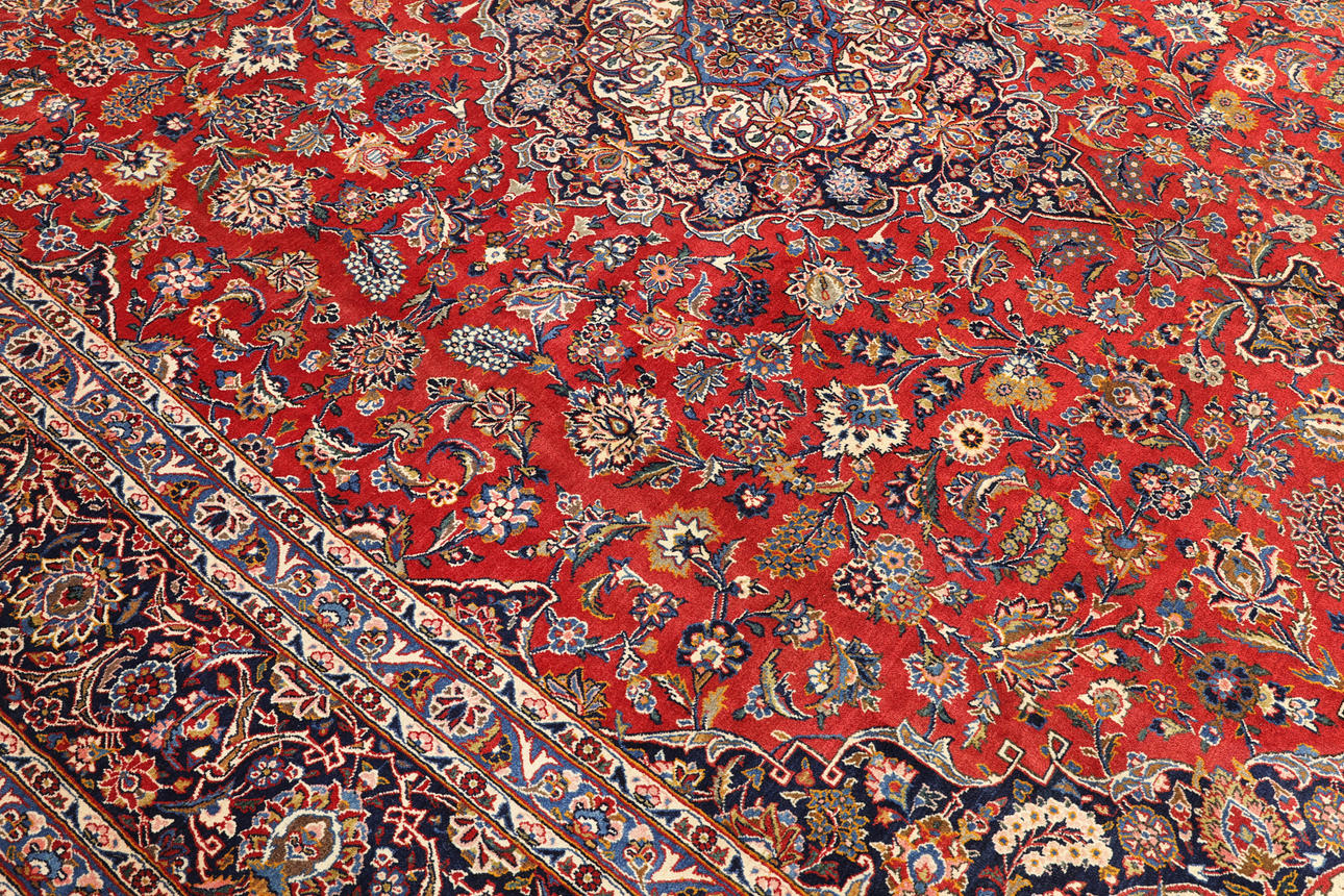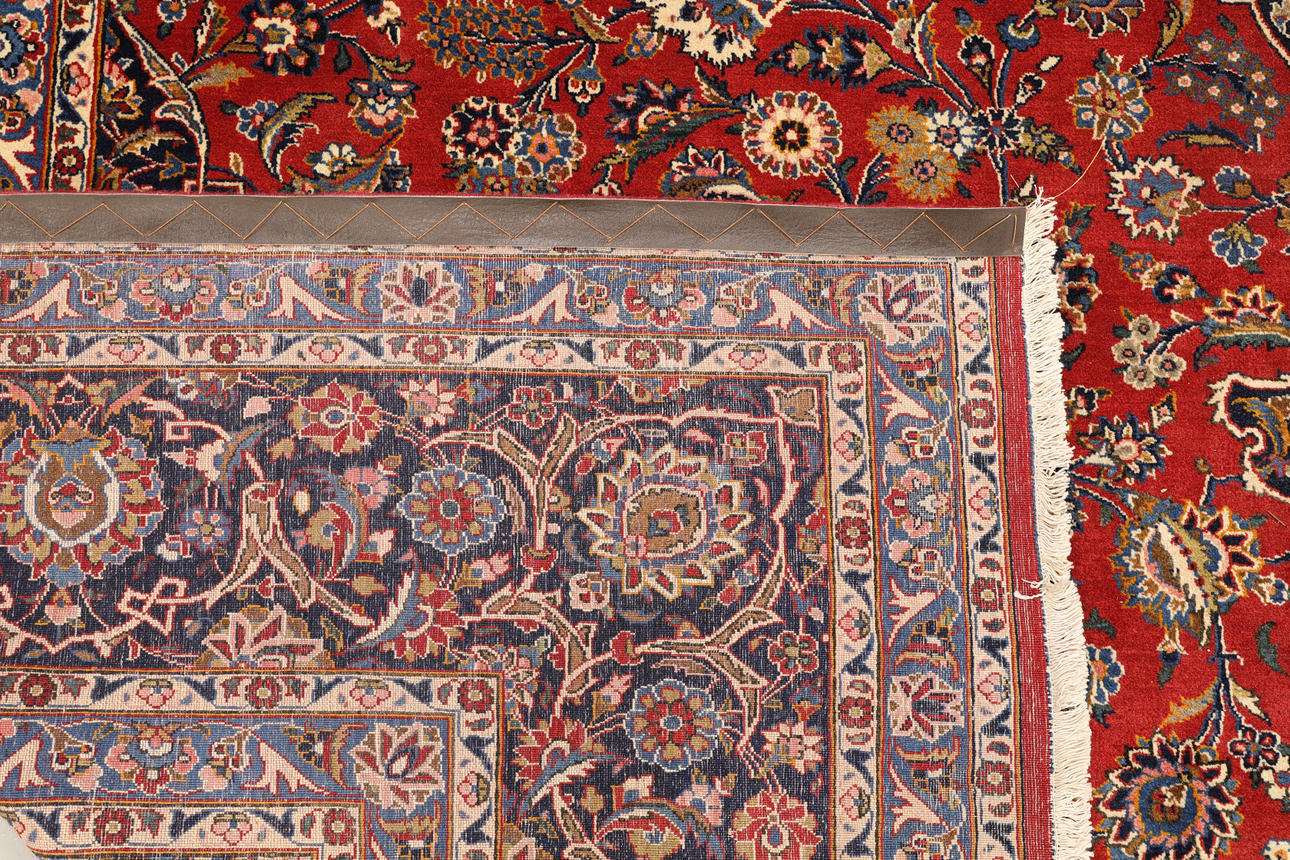 Keshan fine med röd bottenfärg och en centralt placerad medaljong med hög detaljrikedom i blått och beige samt detaljer i orange och rött. Mittfältet är täckt av floralornamentik, palmetter och arabesker i liknande nyanser, och hörnpartierna följer samma färgsättning som medaljongen. Bården har en mörk botten och dekor av palmettrankor. Luggen är av ull och varpen är av bomull.