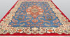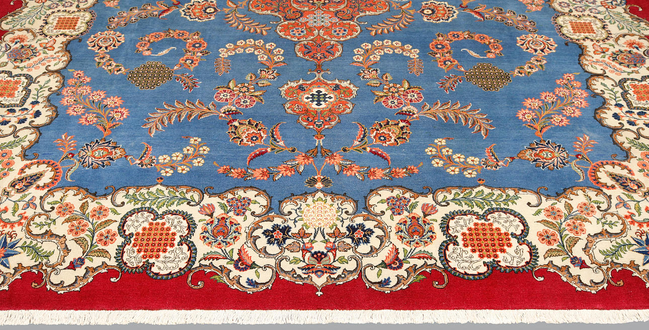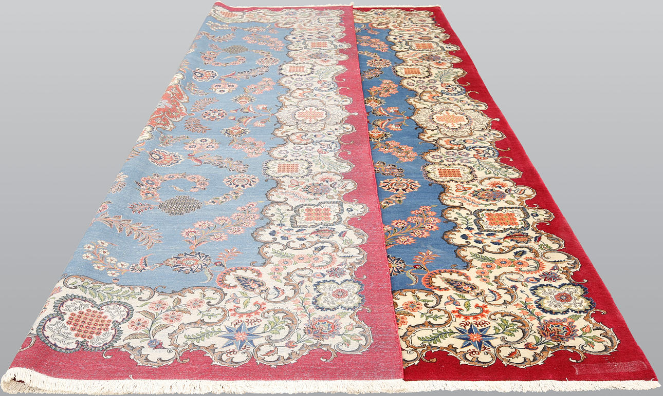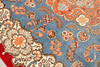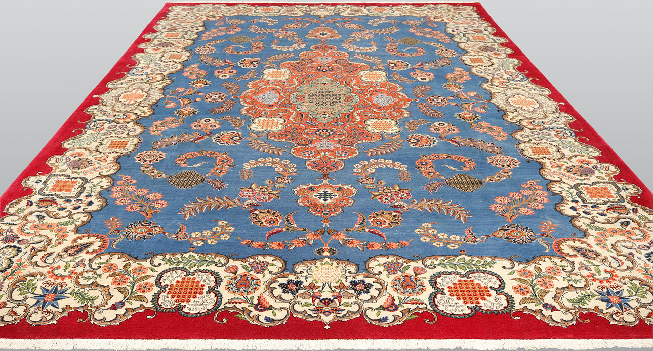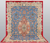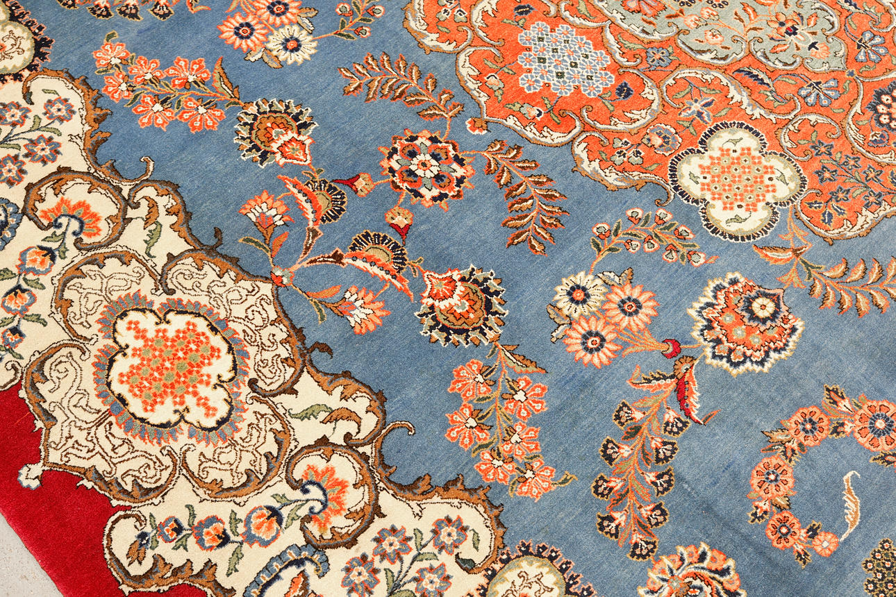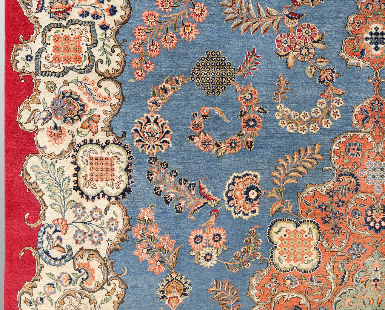 Royal Keshan fine med ljusblå botten och en stor centralt placerad medaljong i korall, beige och mörkblått. Mittfältet är uppbyggt av symmetriska blom- och rankmotiv i beige, korall, blått och grönt. Bården har ljus botten med stora palmett- och blommotiv som ramas in av en röd kant. Luggen är av ull och varpen är av bomull.